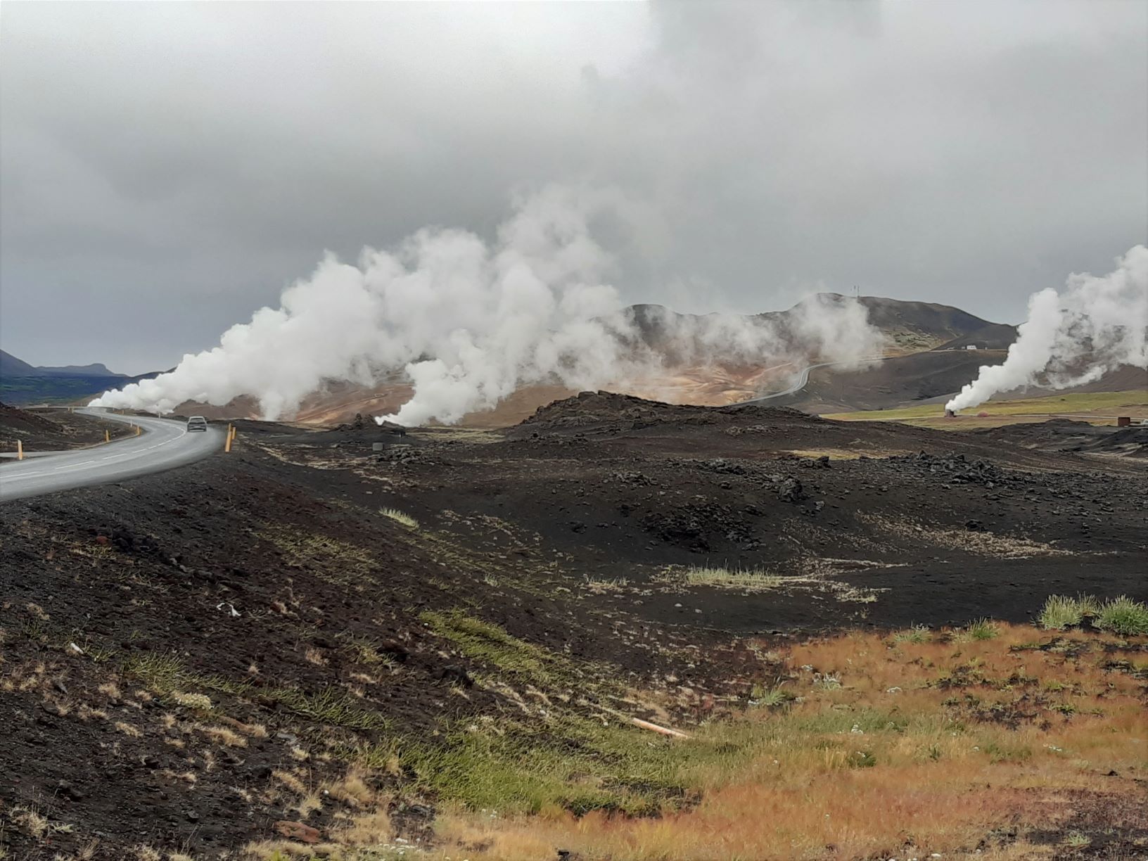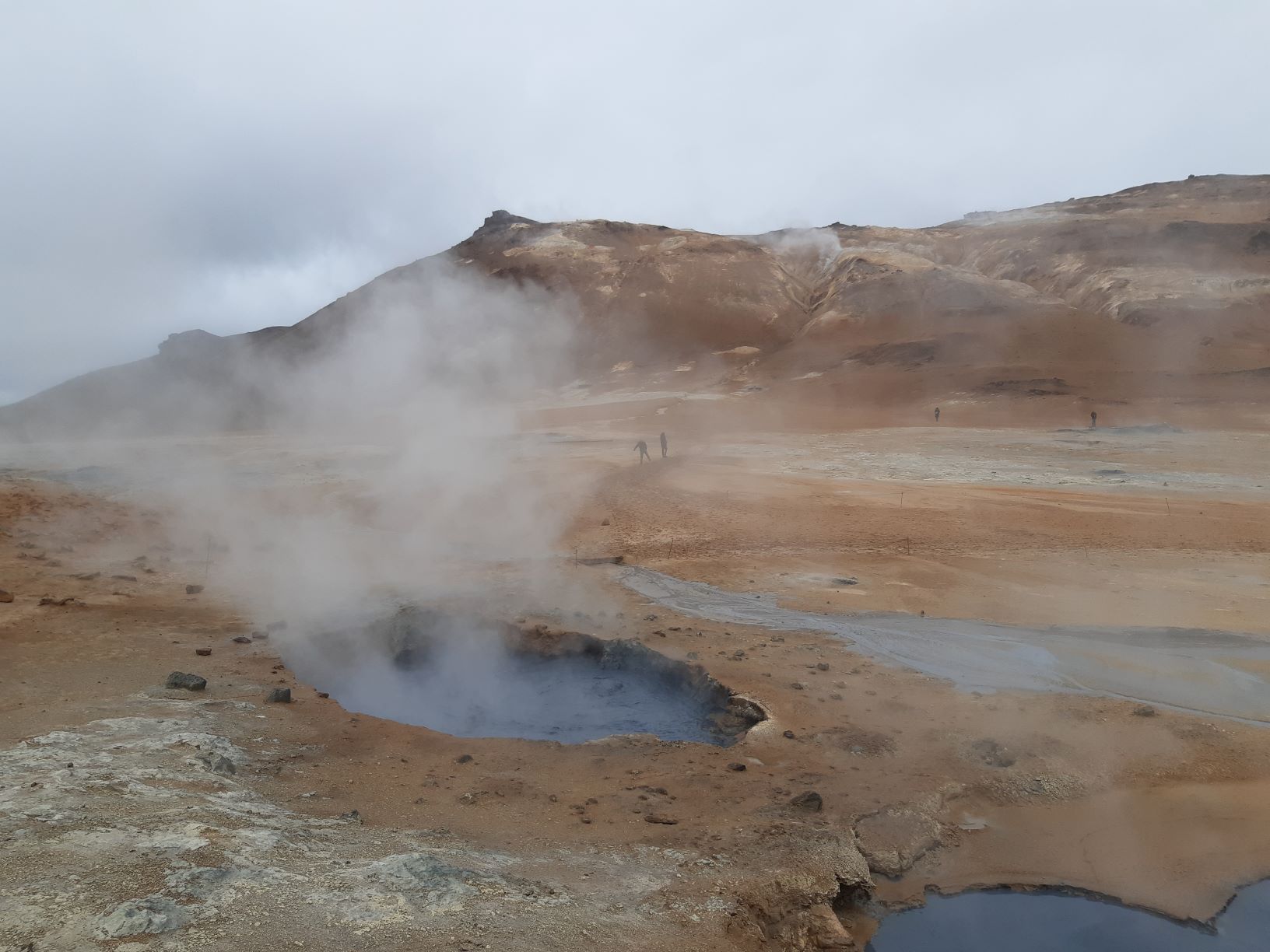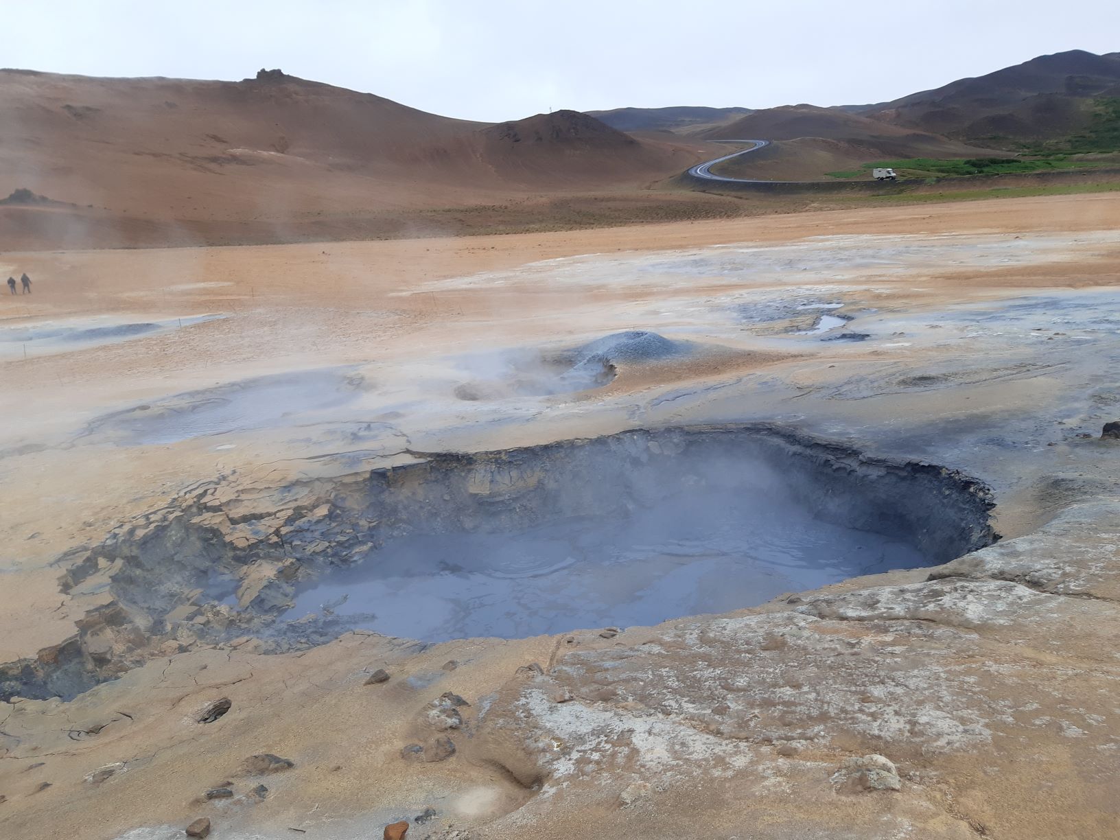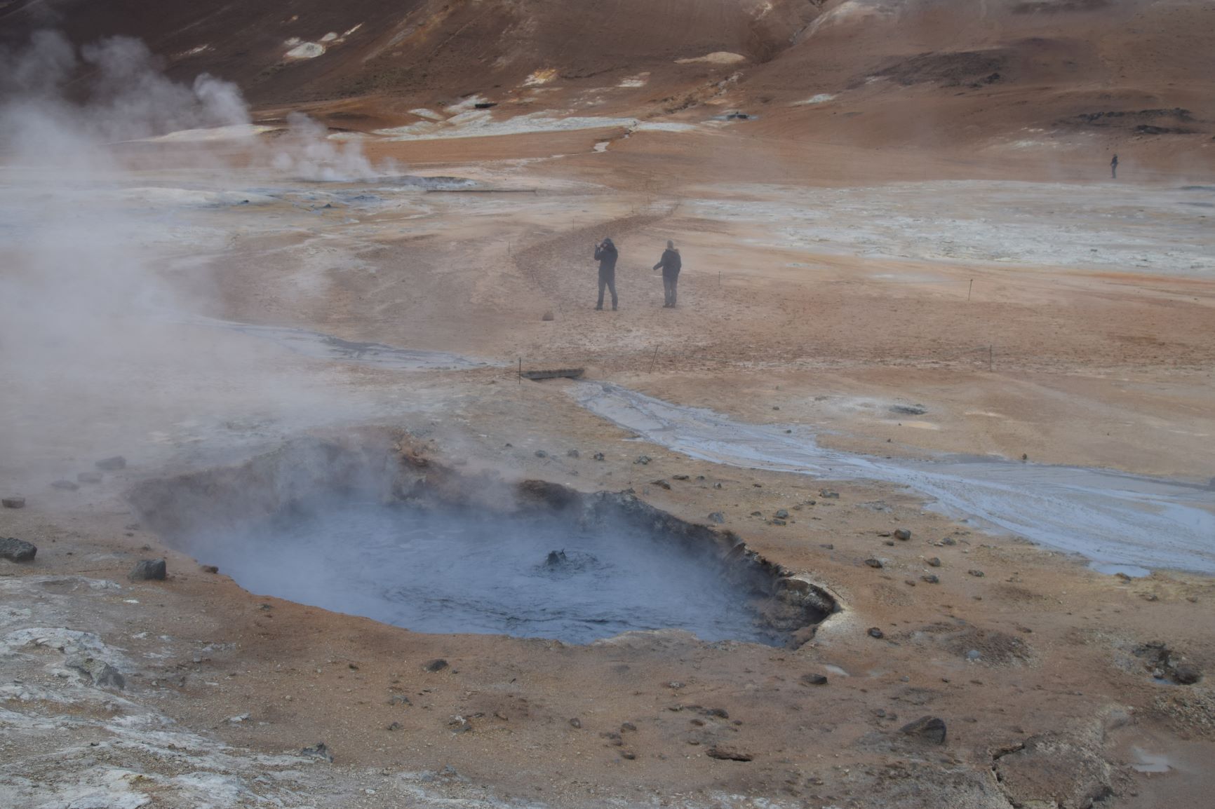 Wir sind am Myvatn (Mückensee) auf einem Campingplatz, weil unsere Solarzellen nur auf Sonne, nicht aber auf Regen reagieren. Seit gestern Mittag regnet es intensiv. Die Region birgt eine Vielfalt an Sehenswertem, aber bei trübem, feucht-kaltem Wetter braucht es Überwindung, im Freien herumzustoffeln. So beschränken wir uns auf ein Minimum und ziehen lediglich dahin, wo’s zischt, brodelt, dampft und nach Schwefel riecht. Man befindet sich hier auf dem Grabenbruchsystem zwischen der nordamerikanischen und eurasischen Kontinentalplatte.