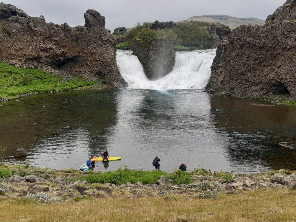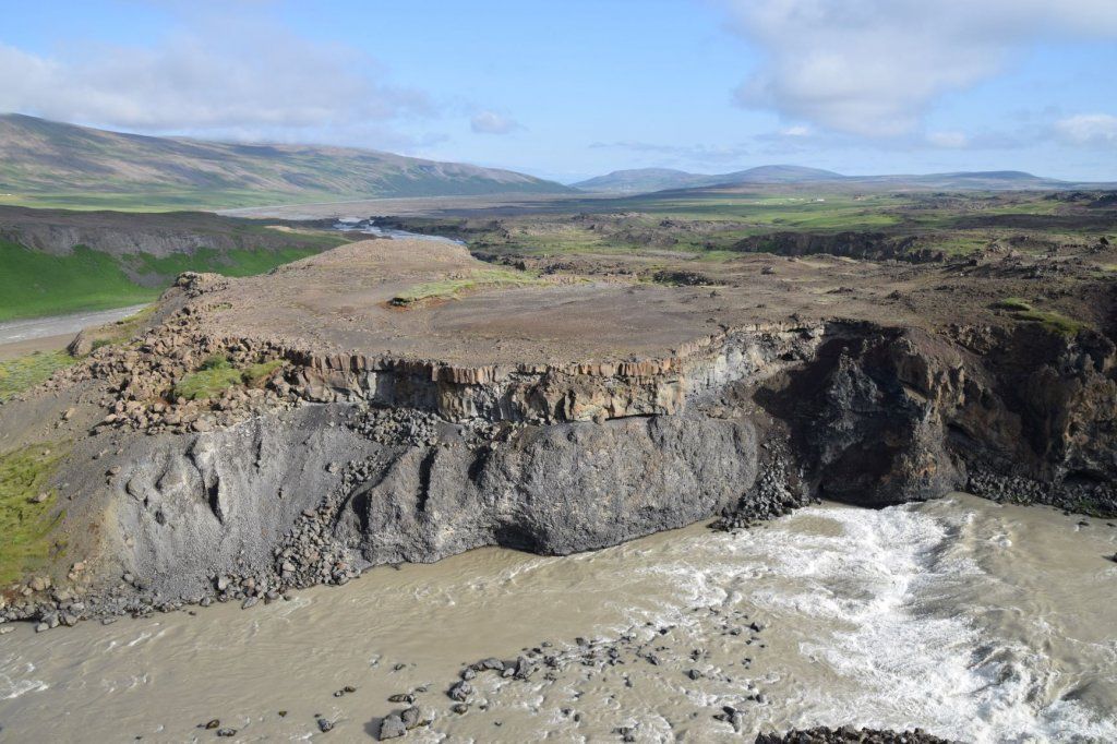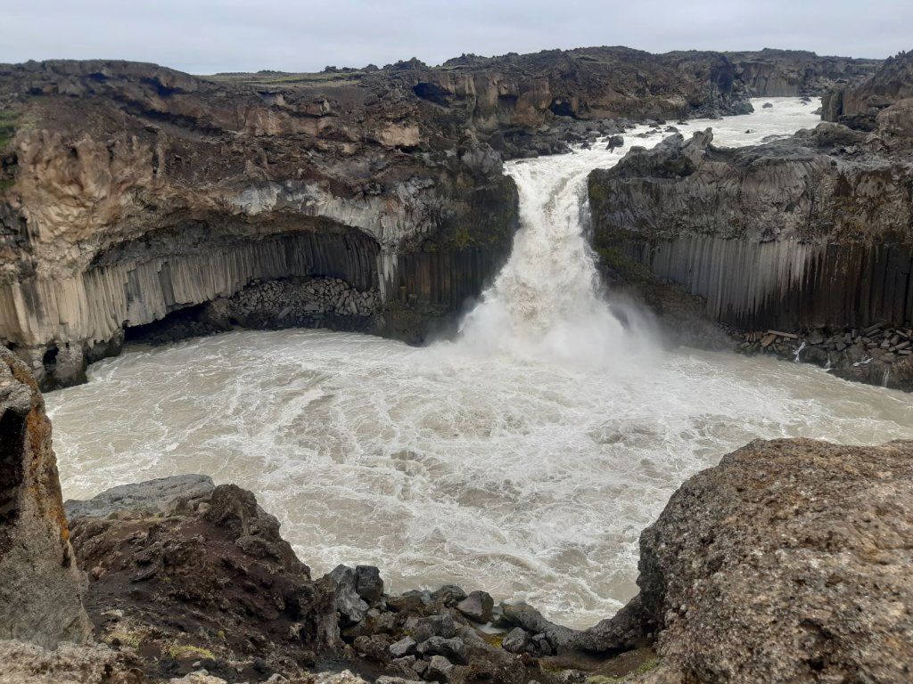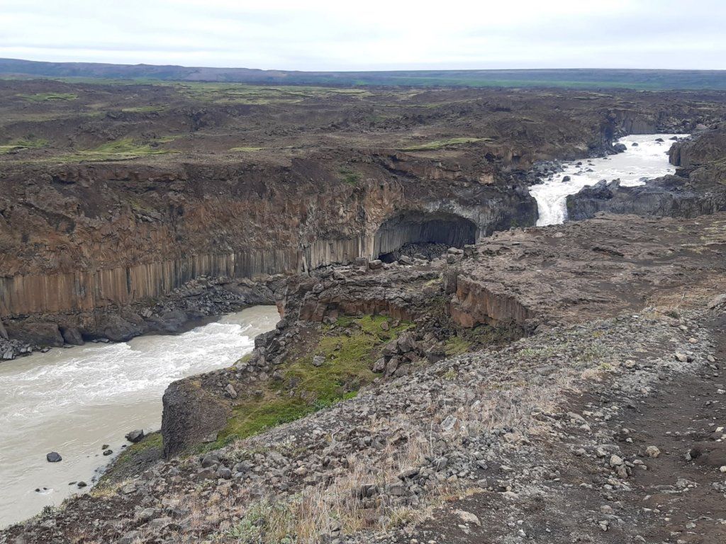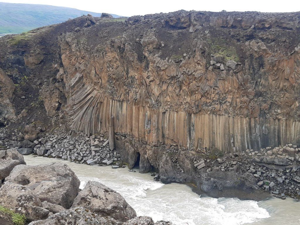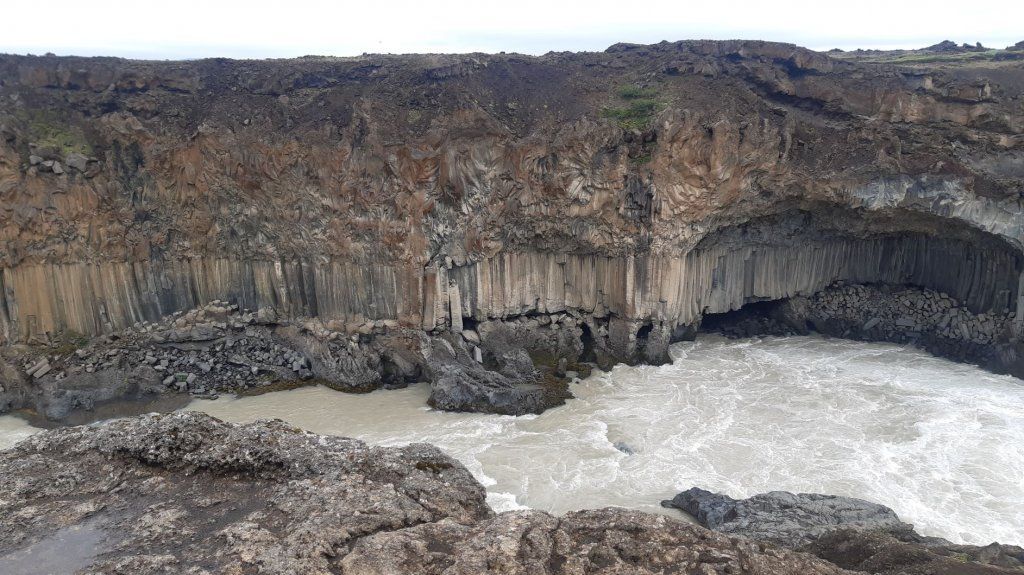 Unser erstes Ziel ist der Godafoss, der Götterfall. Der Fluss Skjalfandafljot (na ja), der vom Hochland her kommt, stürzt publikumswirksam in die Tiefe und fliesst bei Husavik ins Meer. Hier beginnen wir unsere Reise ins Hochland und folgen dem Fluss aufwärts bis zu einem weiteren Wasserfall, dem Aldeyjarfoss, der malerisch in eine enge, aus schön ausgeformten Basaltsäulen bestehende Schlucht stürzt. Auf dem kleinen Parkplatz übernachten wir weit weg von Gut und Böse. Übrigens: Hochland heisst ca. 600 - 700m hoch, keine Asphaltstrassen, tiefe und weniger tiefe Furten und spektakuläre Landschaften.