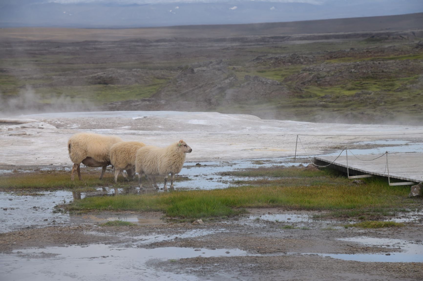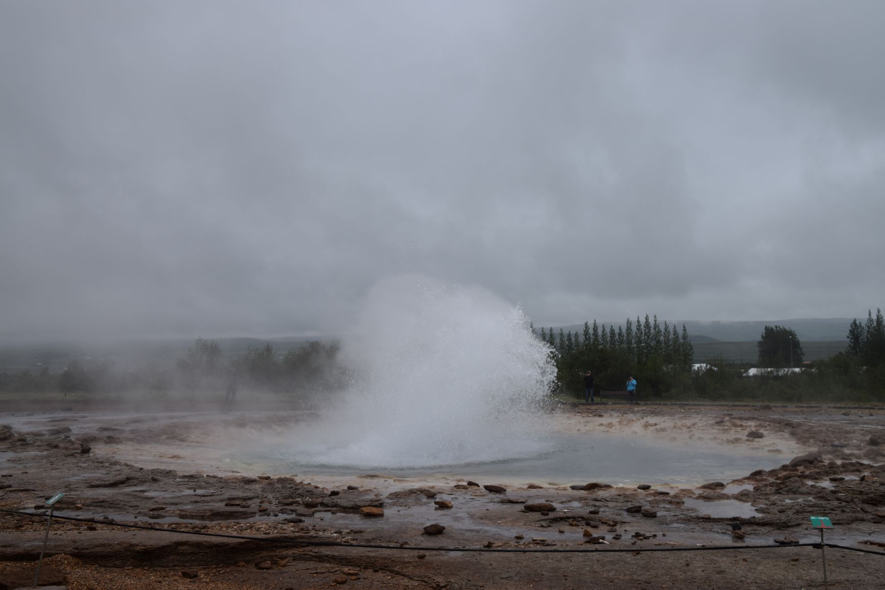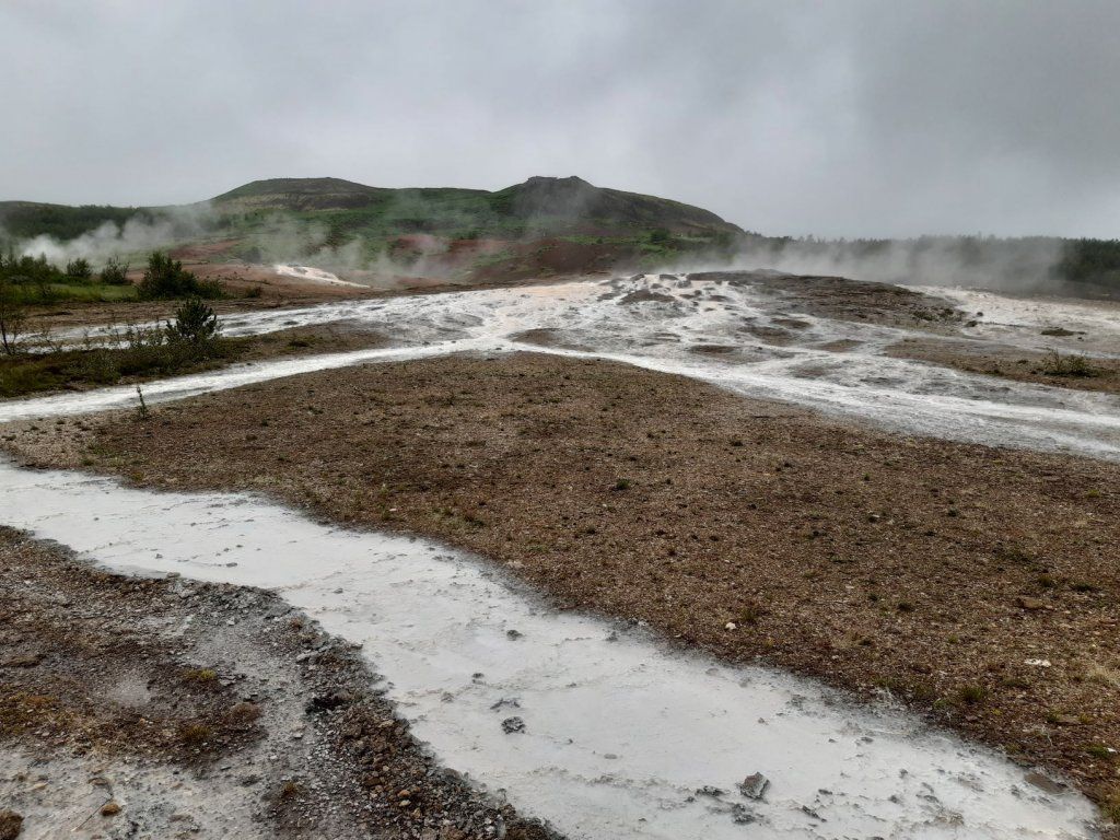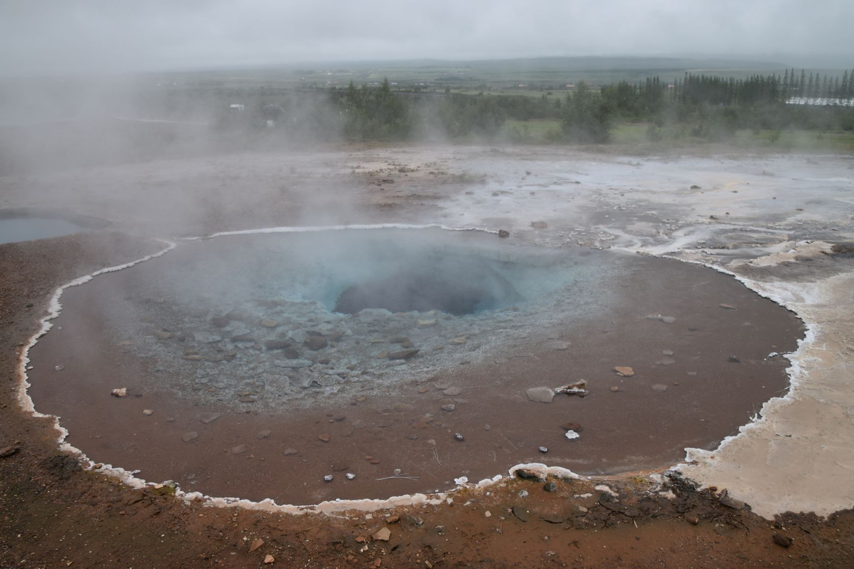Am frühen Morgen des 2. August holen wir den gestern verpassten Nationalfeiertag nach. Noch vor den Touristen sind wir beim Platz der berühmten Geysire. Da kocht, brodelt, dampft und schwefelt es. Der Grosse Geysir hat sich zwar zur Ruhe gelegt, aber die Hinterlassenschaft aus seiner Aktivzeit, ein grosses Becken mit faszinierenden Sinterablagerungen, ist bemerkenswert. Der Geysir Strokkur hingegen ist fleissig und schiesst alle paar Minuten seine Fontäne in die Luft, womit wir beim 1. August angelangt sind. Es muss ja nicht immer ein Vulkan sein, obwohl es solche in Island zur Genüge hätte!