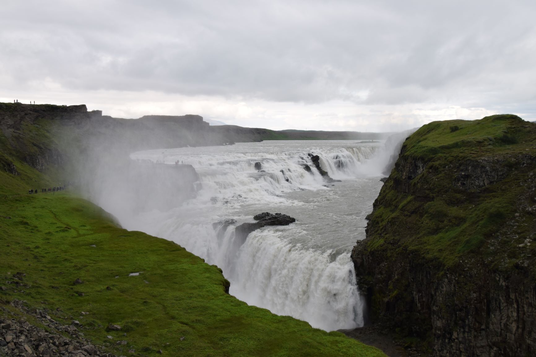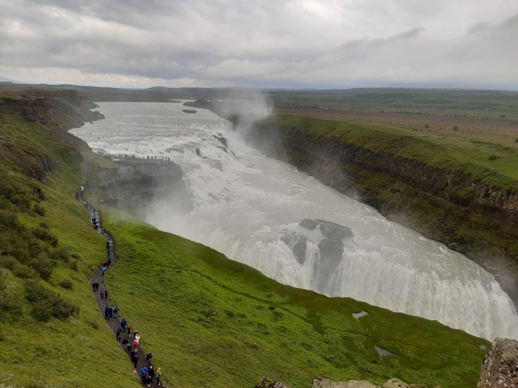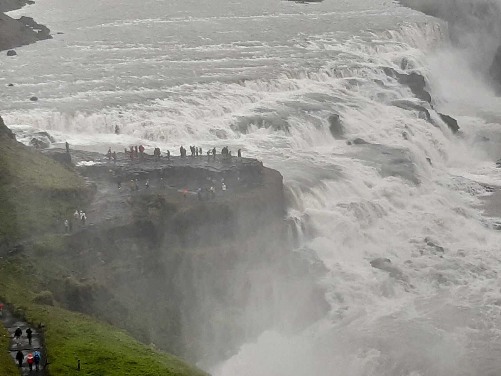 Nun bessert der Strassenzustand, die letzten 10 km sind sogar asphaltiert. Beim Gullfoss (Goldener Wasserfall) ist der grosse Parkplatz gut gefüllt, was uns nach der langen, einsamen Fahrt durchs Hochland nicht besonders positiv auffällt. Der Wasserfall ist trotzdem beeindruckend.