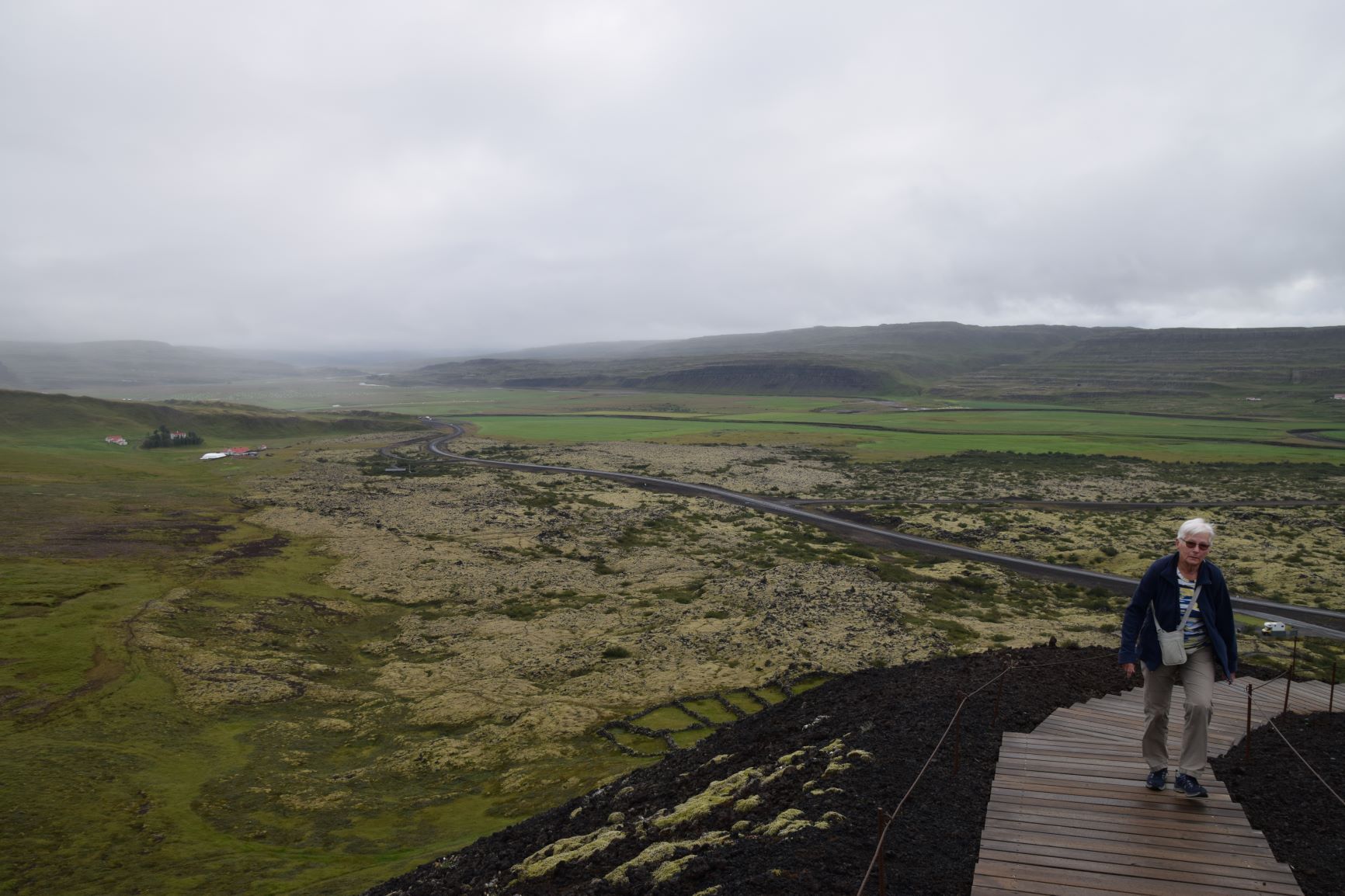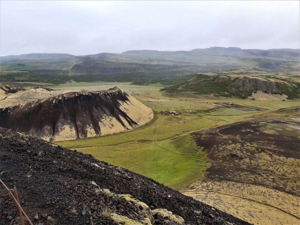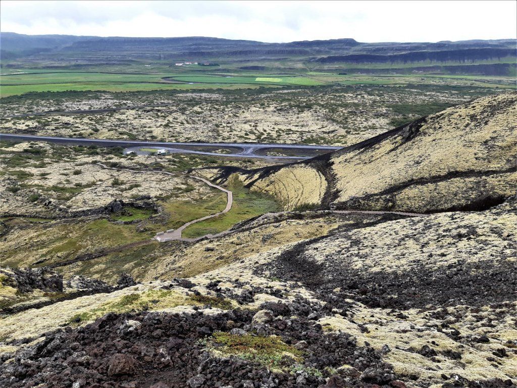 Wir fahren die Ringstrasse wieder nordwärts, die wir vor ein paar Tagen südwärts gefahren sind. Das Wetter ist noch etwas trüb, hellt aber am Nachmittag auf. Zuerst kommen wir an den drei Grabrok-Kratern vorbei, die vor ca. 3000 Jahren entstanden sind. Ein weitläufiges Gebiet ist von Lavaformationen geprägt, die hellen Moose geben auf dem schwarzen Untergrund ein schönes Bild ab.
