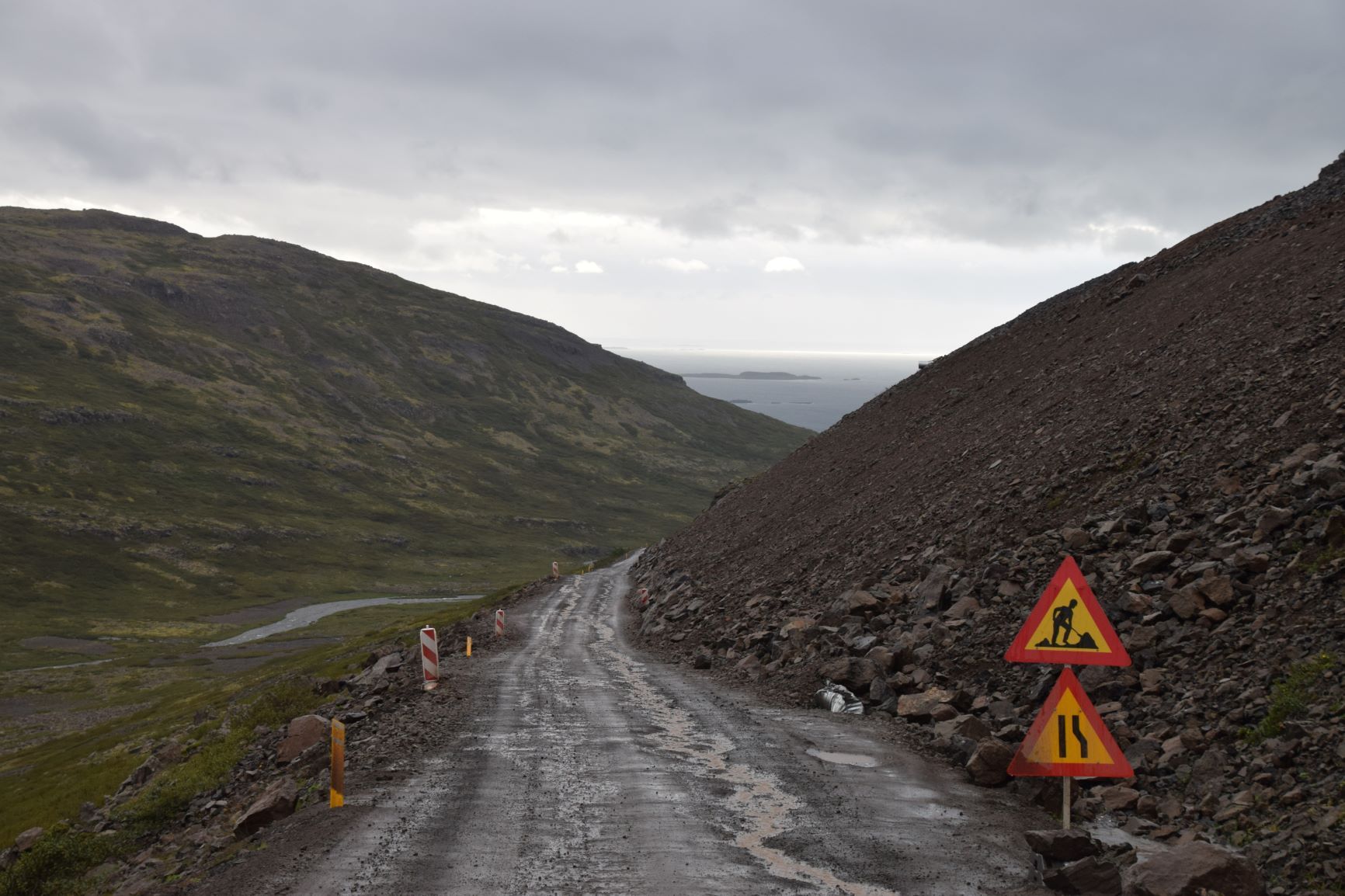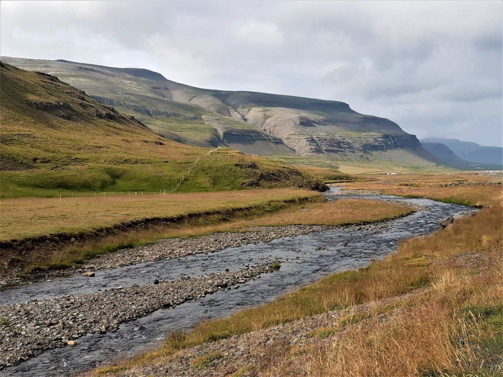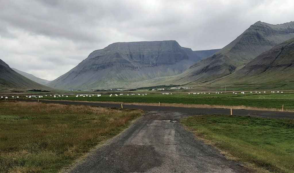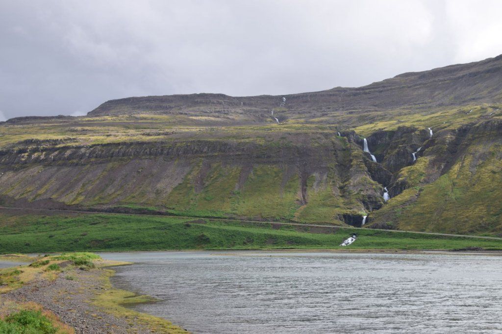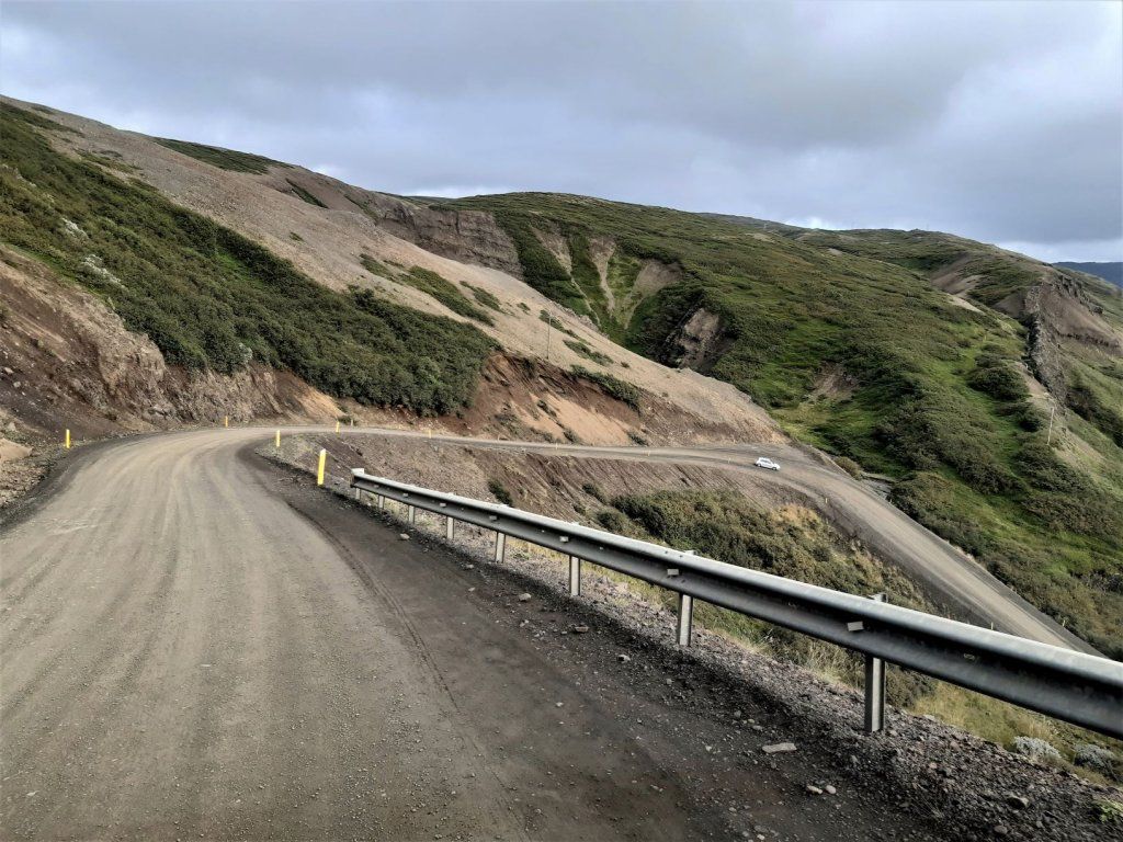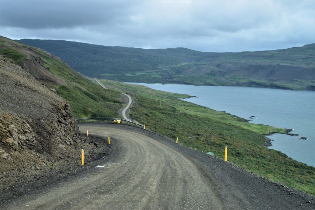 Am Samstag, 28.8. ist sogar das Wetter ganz passabel, sodass wir das letzte Stück ostwärts gebührend geniessen können. Wieder muss ein landschaftlich reizvoller Naturstrasse-Pass überwunden werden und auf dem Talweg ein Gefälle von 15%, hinunter nach Djupidalur (dalur = Tal). Wenig später geht’s definitiv Richtung Süden mit Fernziel Reykjavik. Diesmal aber nur, weil’s an der Route liegt, nicht weil wieder irgendetwas repariert werden muss!