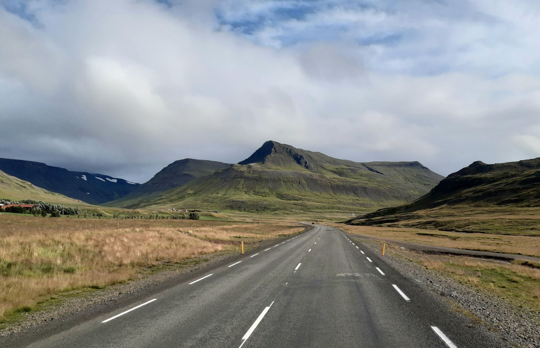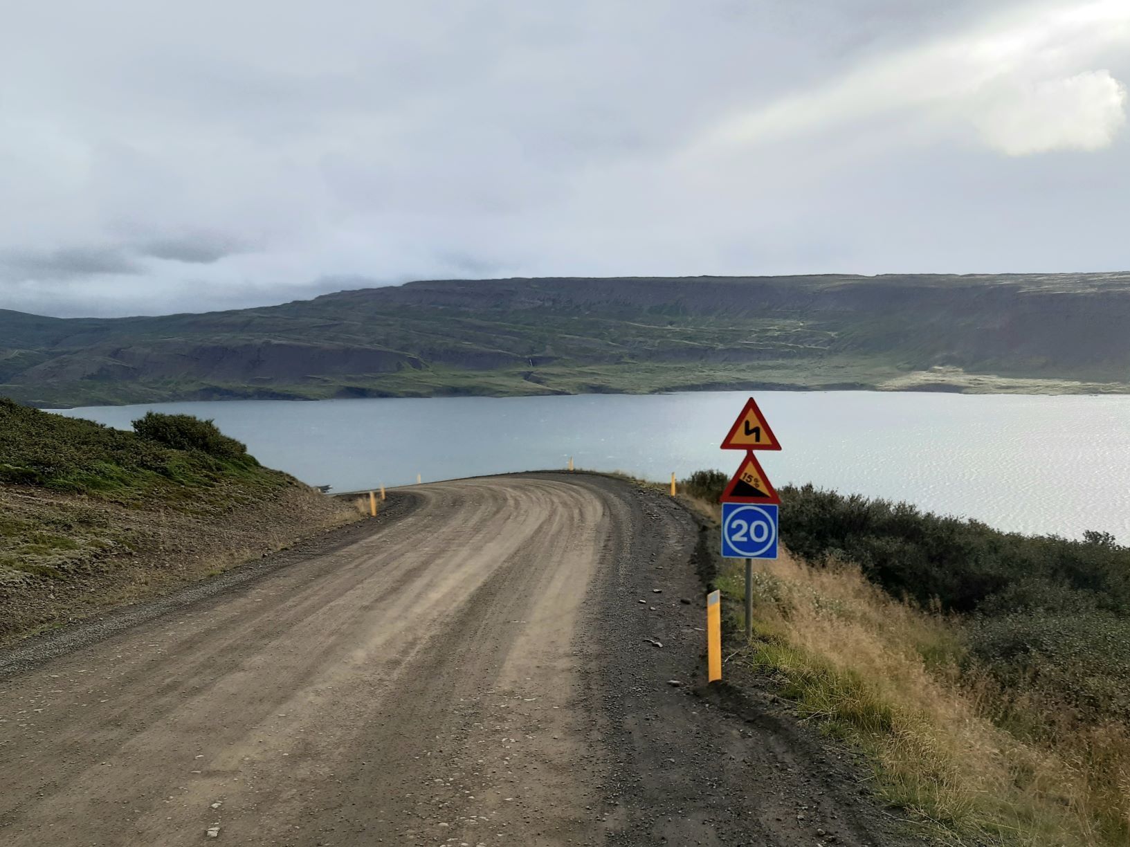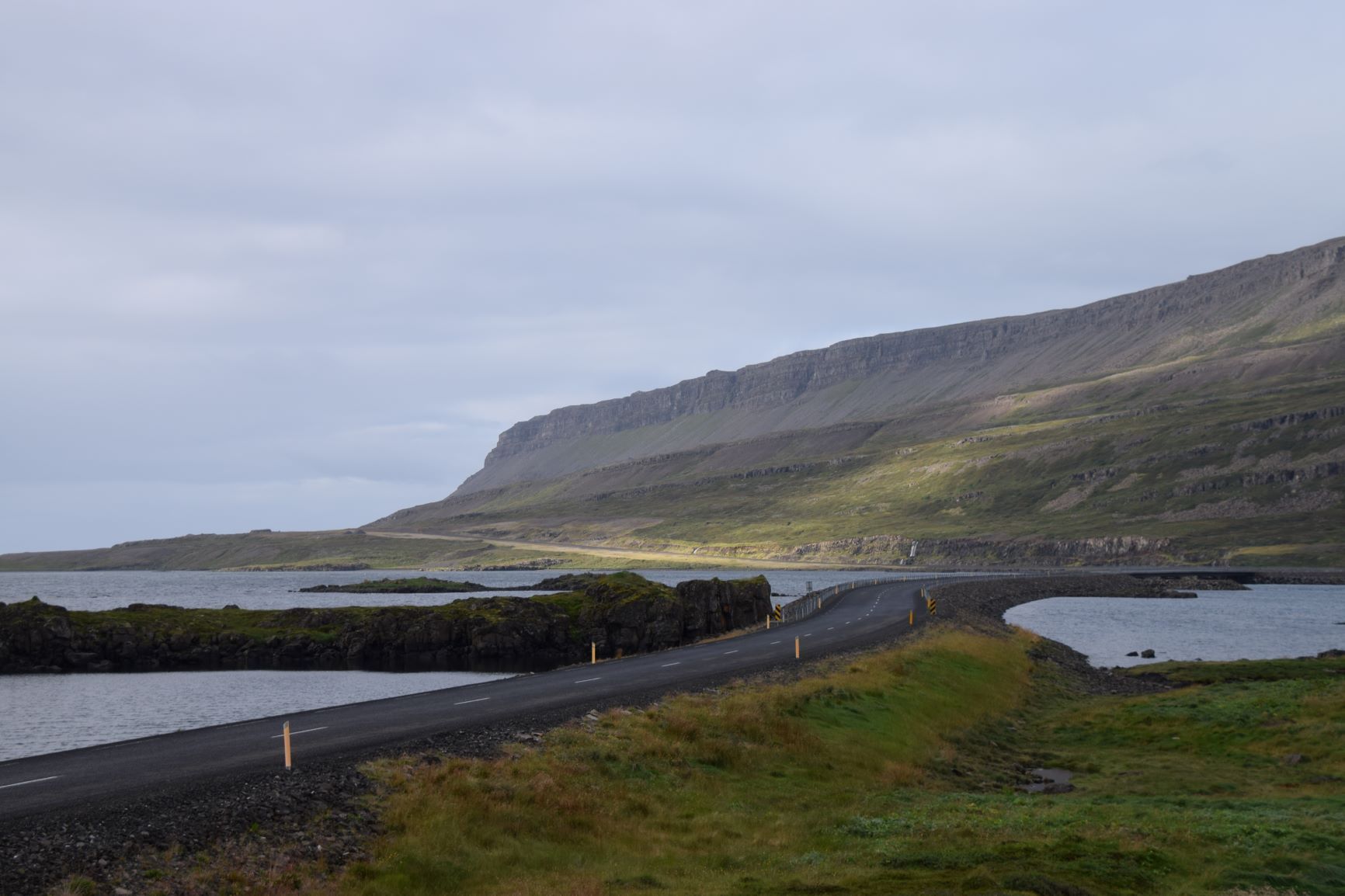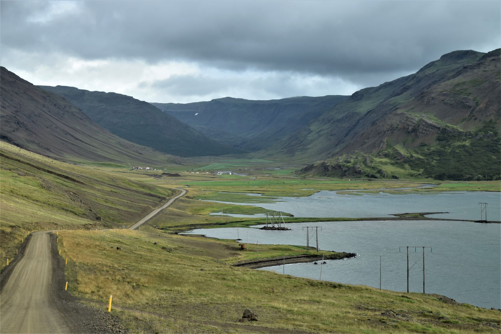 Am Samstag, 28.8. ist sogar das Wetter ganz passabel, sodass wir das letzte Stück ostwärts gebührend geniessen können. Wieder muss ein landschaftlich reizvoller Naturstrasse-Pass überwunden werden und auf dem Talweg ein Gefälle von 15%, hinunter nach Djupidalur (dalur = Tal). Wenig später geht’s definitiv Richtung Süden mit Fernziel Reykjavik. Diesmal aber nur, weil’s an der Route liegt, nicht weil wieder irgendetwas repariert werden muss!