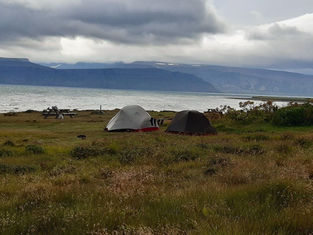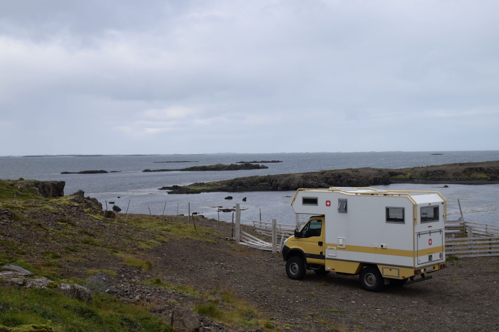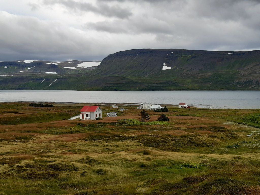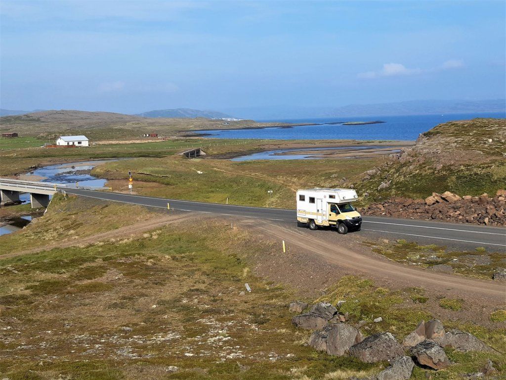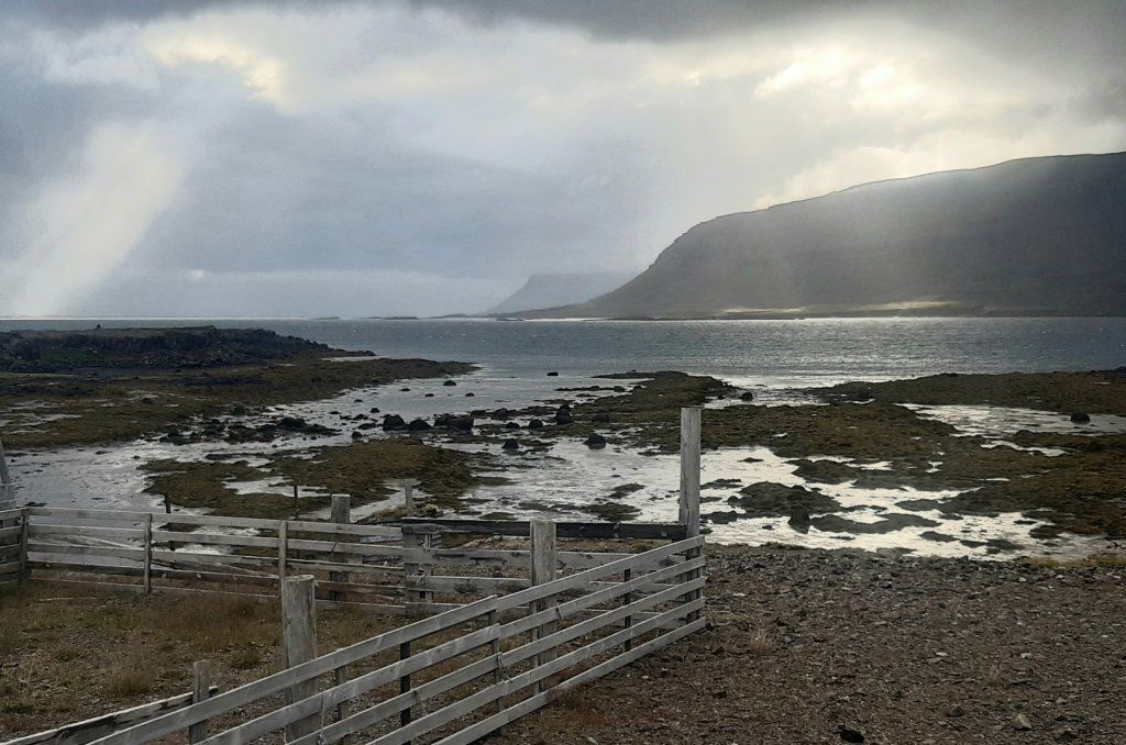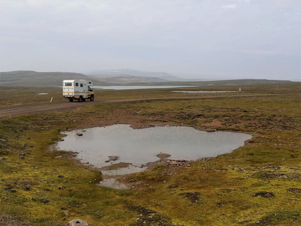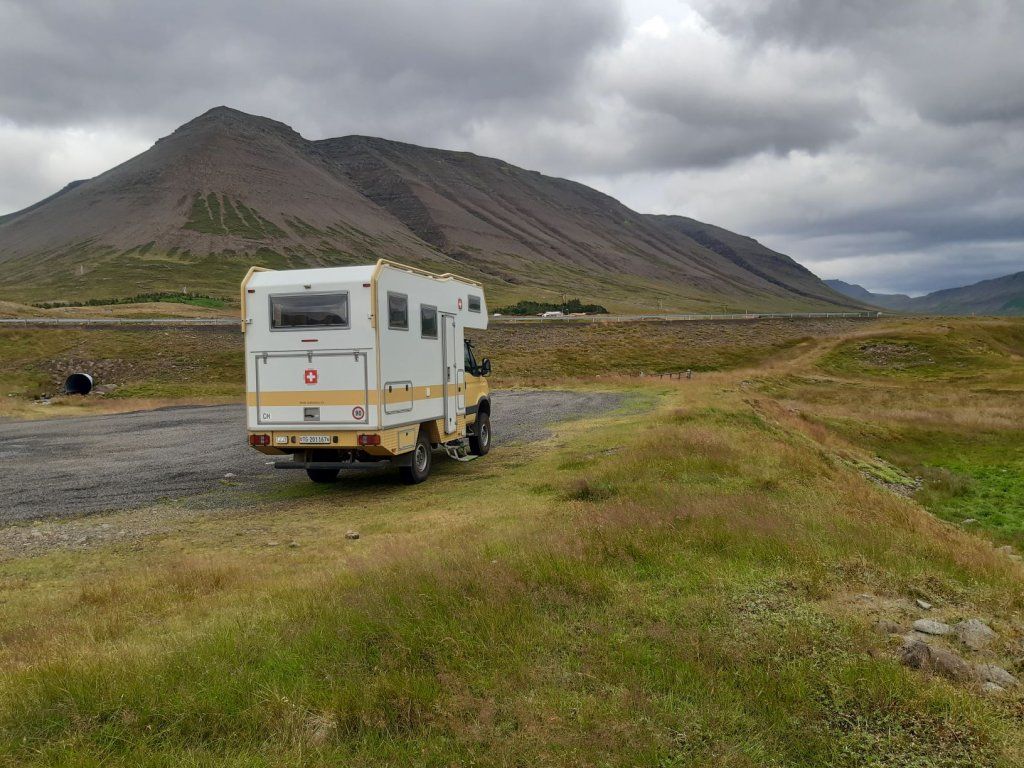 Inzwischen hat eine Lastwagenwerkstatt bei unserem Iveco eine neue Einspritzdüse am Motor eingebaut. Bei Ankunft in Isafjördur am letzten Sonntag lief der Motor nur noch auf drei Zylindern. Das Ersatzteil kam aus Frankreich und die Unterstützung des Mechanikers wurde von IVECO Reykjavik gewährleistet. Dank guter Flugverbindungen des lokalen Flugplatzes hielt sich der erforderliche Reiseunterbruch in Grenzen und der „Campingplatz“ vor der Werkstatt, inklusive Stromanschluss und Blick zum Hafen, war gar nicht so übel. Heute Donnerstagnachmittag können wir nun weiterziehen. Es geht südwärts bis zum Dyrafjord, wo wir ein Traumplätzchen zum Übernachten finden. Allerdings dreht der Wind kräftig auf, rüttelt die ganze Nacht an unserem Häuschen und zudem trommelt heftiger Regen aufs Dach, sodass aus der erhofften ruhigen Nacht nichts wird.