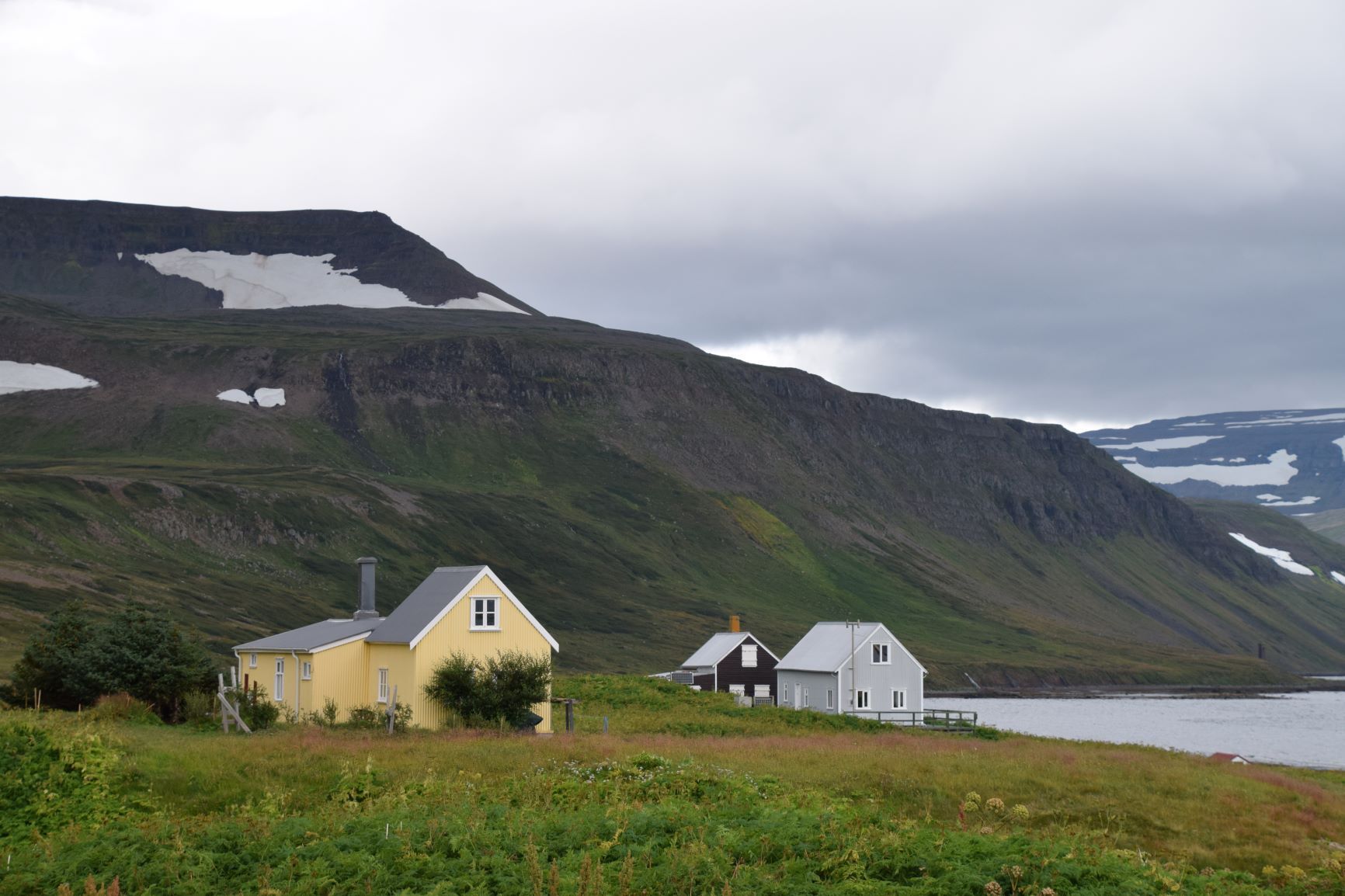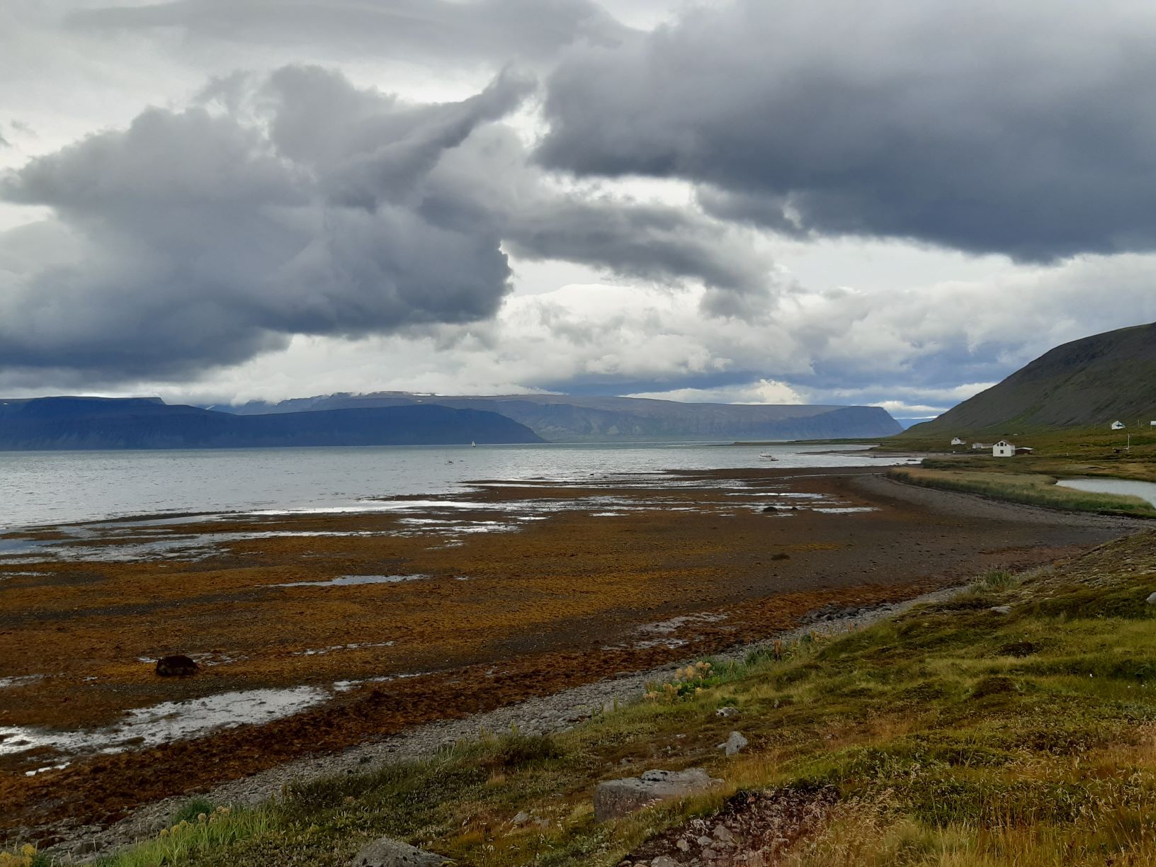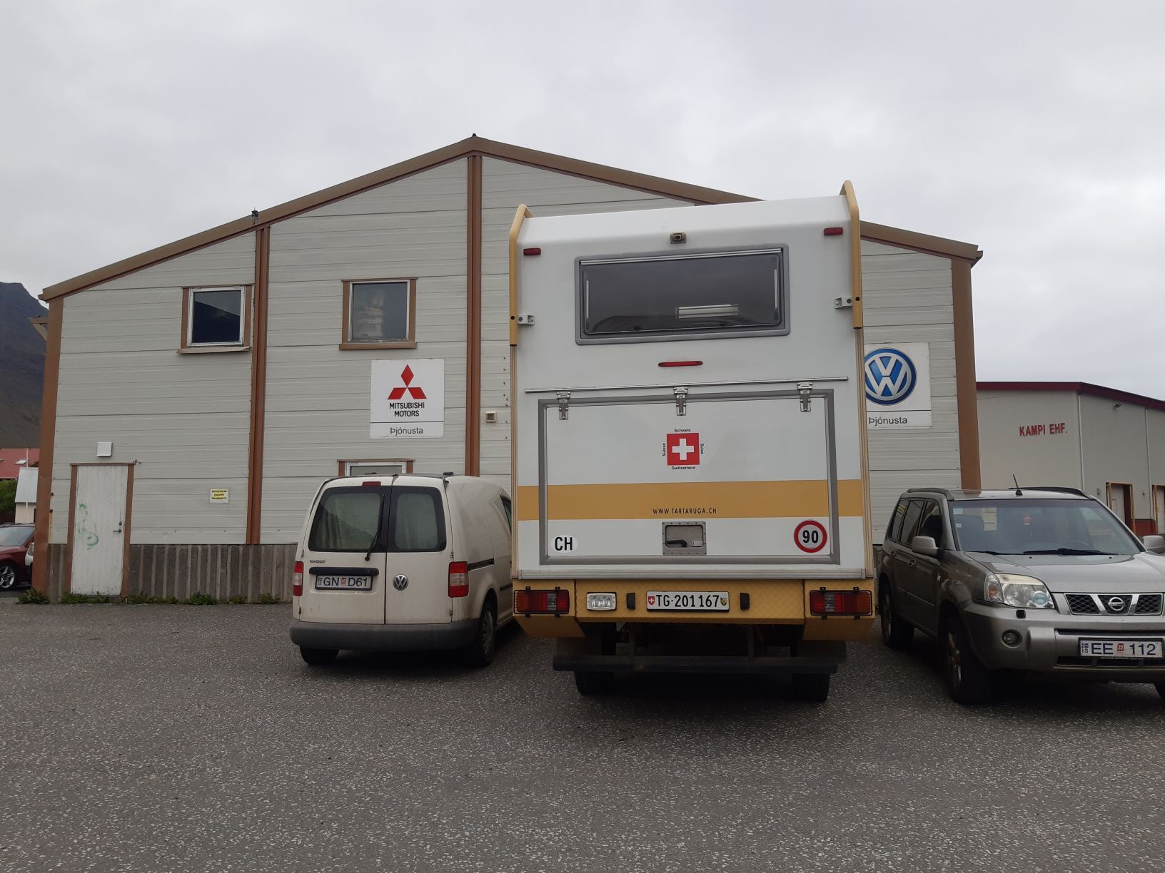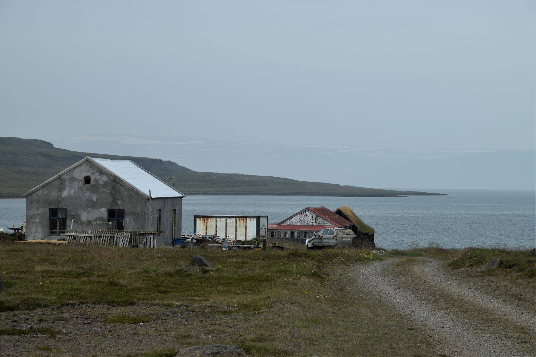 Inzwischen hat eine Lastwagenwerkstatt bei unserem Iveco eine neue Einspritzdüse am Motor eingebaut. Bei Ankunft in Isafjördur am letzten Sonntag lief der Motor nur noch auf drei Zylindern. Das Ersatzteil kam aus Frankreich und die Unterstützung des Mechanikers wurde von IVECO Reykjavik gewährleistet. Dank guter Flugverbindungen des lokalen Flugplatzes hielt sich der erforderliche Reiseunterbruch in Grenzen und der „Campingplatz“ vor der Werkstatt, inklusive Stromanschluss und Blick zum Hafen, war gar nicht so übel. Heute Donnerstagnachmittag können wir nun weiterziehen. Es geht südwärts bis zum Dyrafjord, wo wir ein Traumplätzchen zum Übernachten finden. Allerdings dreht der Wind kräftig auf, rüttelt die ganze Nacht an unserem Häuschen und zudem trommelt heftiger Regen aufs Dach, sodass aus der erhofften ruhigen Nacht nichts wird.