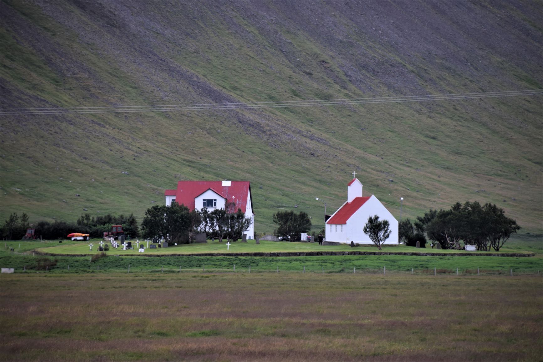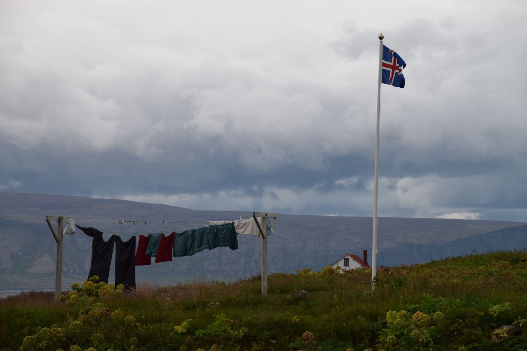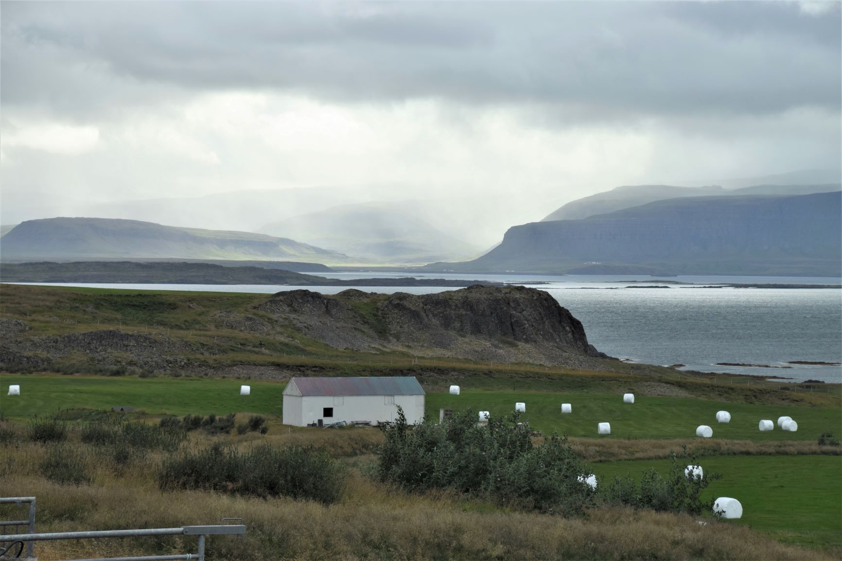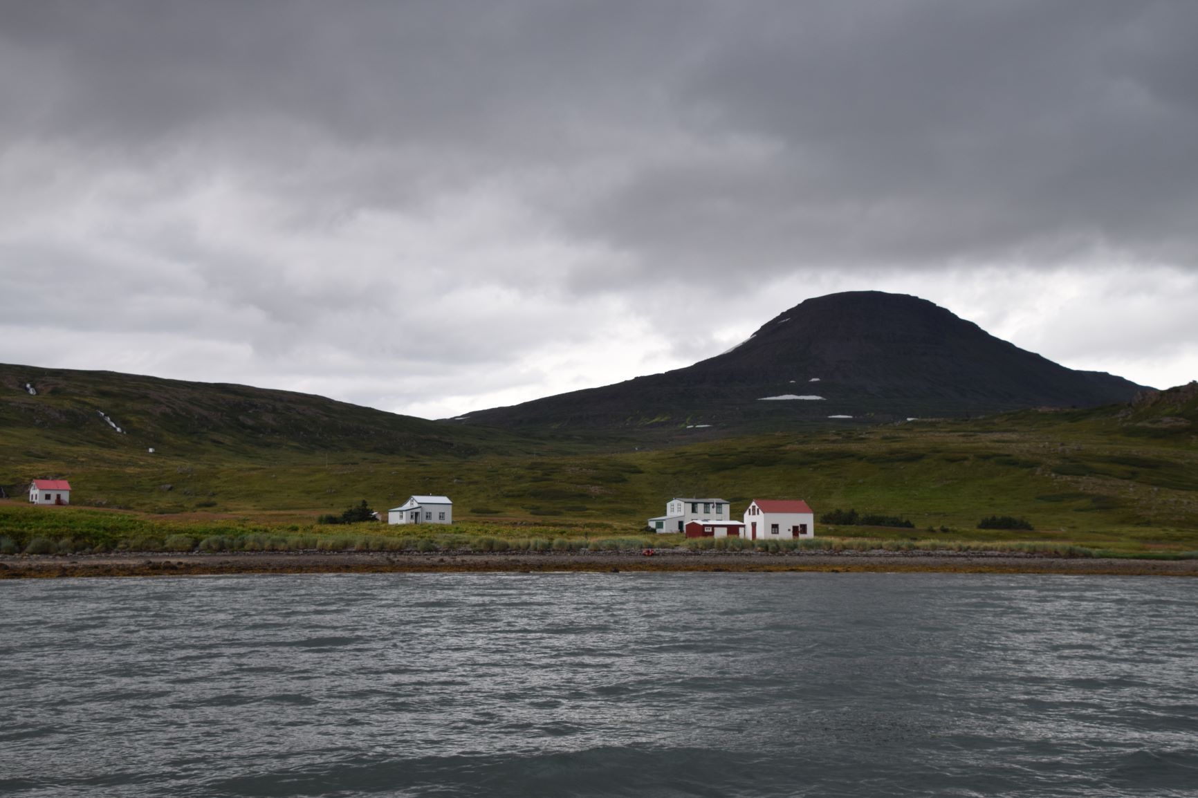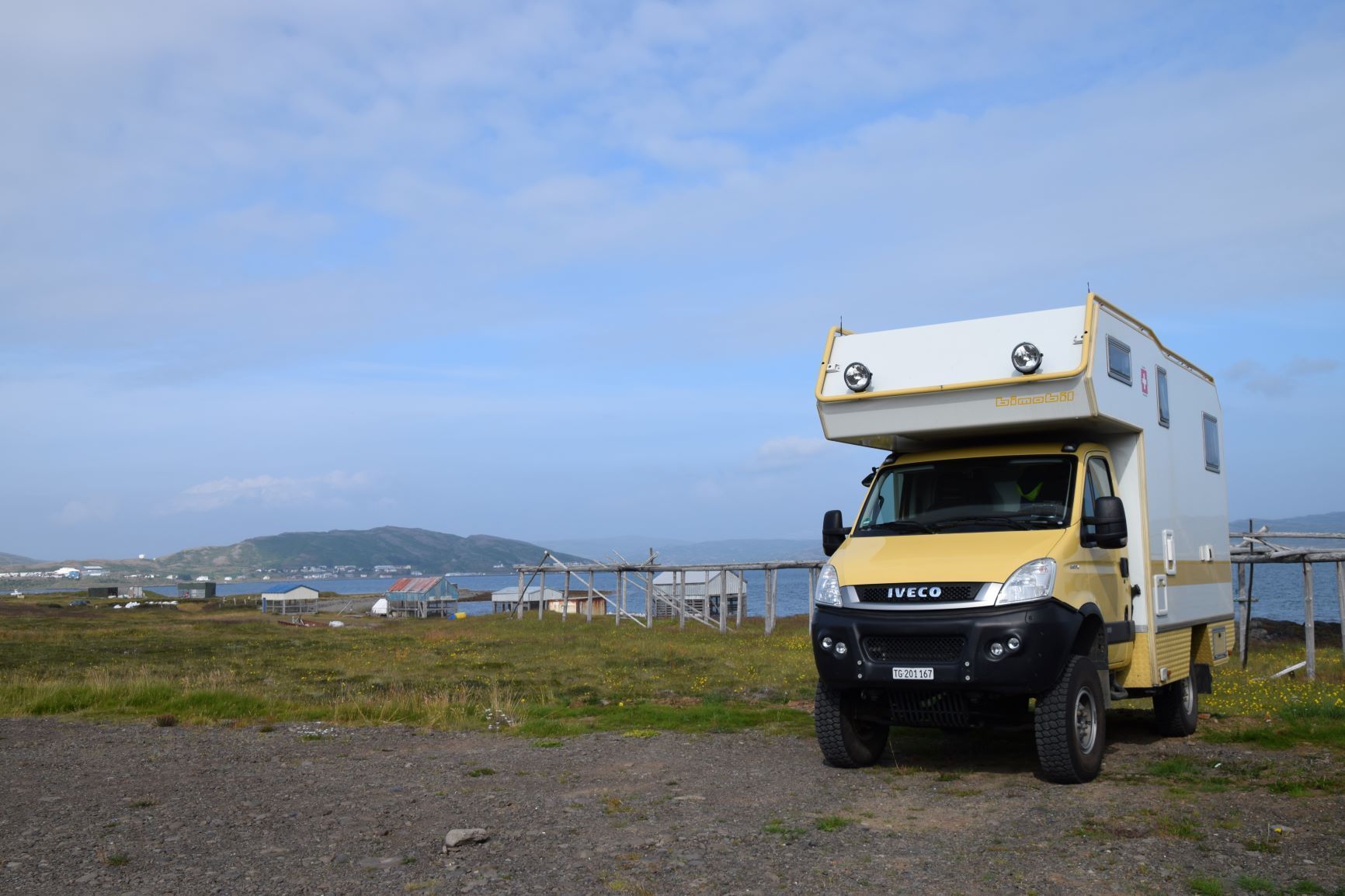 Inzwischen hat eine Lastwagenwerkstatt bei unserem Iveco eine neue Einspritzdüse am Motor eingebaut. Bei Ankunft in Isafjördur am letzten Sonntag lief der Motor nur noch auf drei Zylindern. Das Ersatzteil kam aus Frankreich und die Unterstützung des Mechanikers wurde von IVECO Reykjavik gewährleistet. Dank guter Flugverbindungen des lokalen Flugplatzes hielt sich der erforderliche Reiseunterbruch in Grenzen und der „Campingplatz“ vor der Werkstatt, inklusive Stromanschluss und Blick zum Hafen, war gar nicht so übel. Heute Donnerstagnachmittag können wir nun weiterziehen. Es geht südwärts bis zum Dyrafjord, wo wir ein Traumplätzchen zum Übernachten finden. Allerdings dreht der Wind kräftig auf, rüttelt die ganze Nacht an unserem Häuschen und zudem trommelt heftiger Regen aufs Dach, sodass aus der erhofften ruhigen Nacht nichts wird.