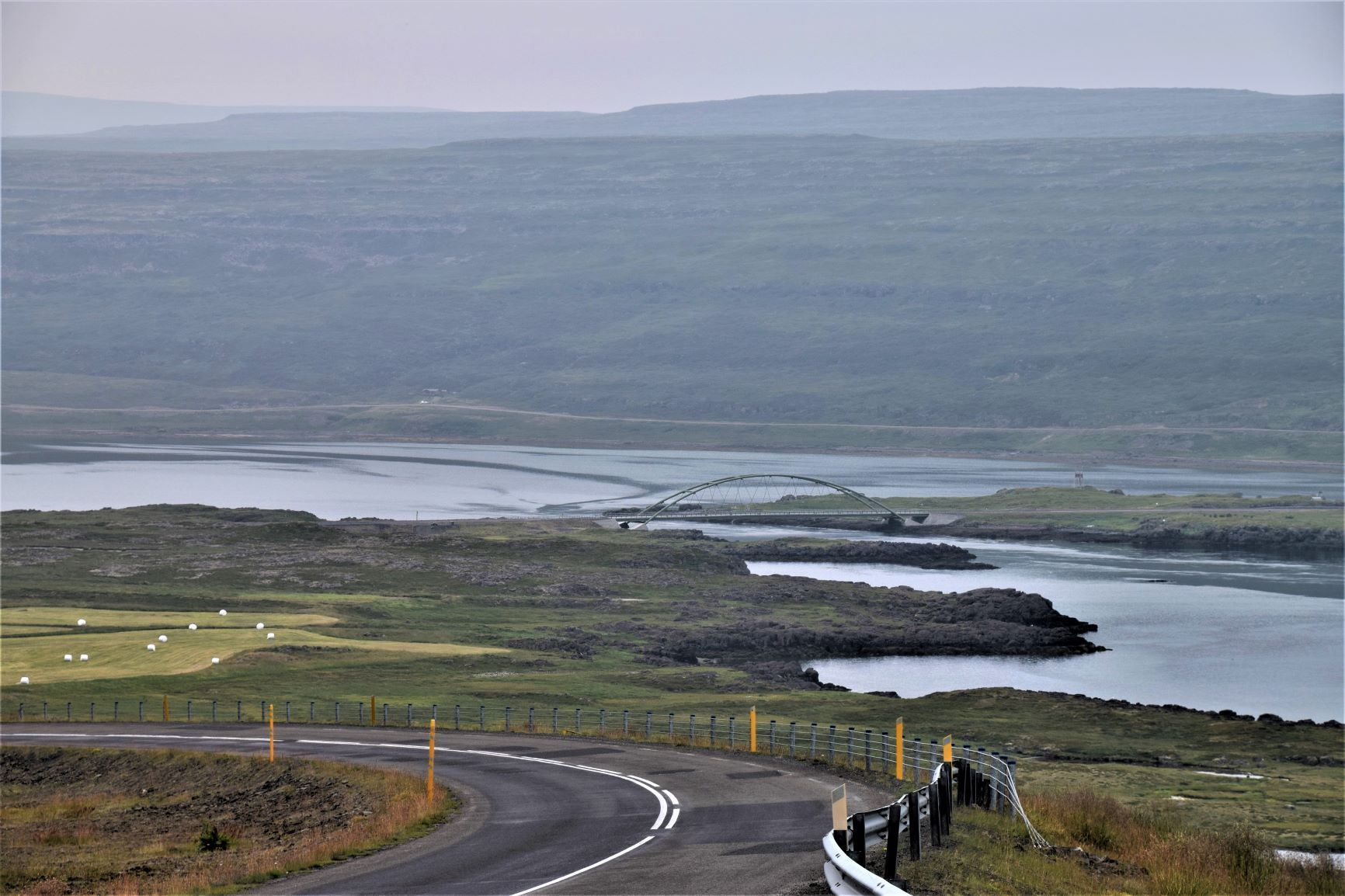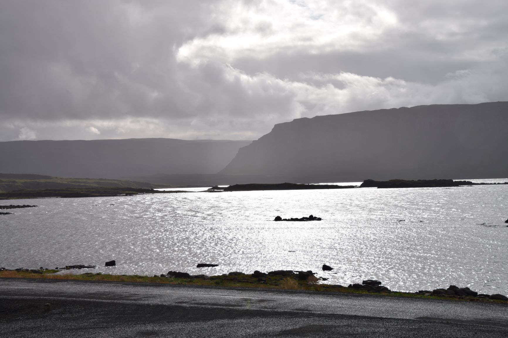 Nun zweigen wir ab auf die 60, später auf die 61 und sind schon am ersten Tag mitten in einer landschaftlich abwechslungsreichen und eindrücklichen Welt. Am Steingrimsfjord bei Holmavik finden wir einen idealen Platz für Nacht mit schönster Aussicht übers Wasser und in die Bucht namens Hunafloi.