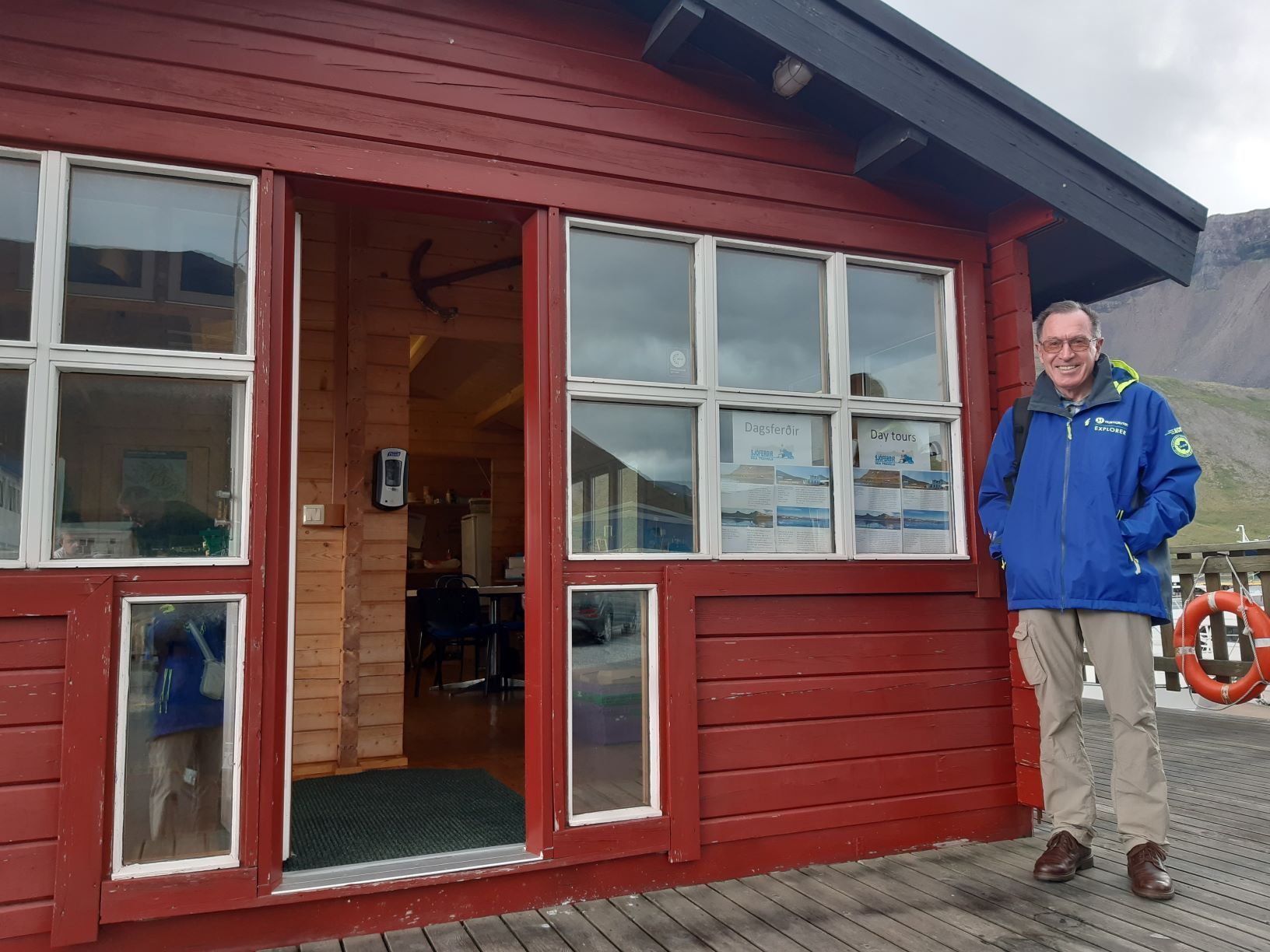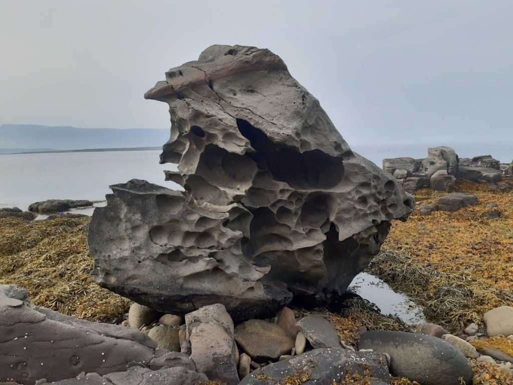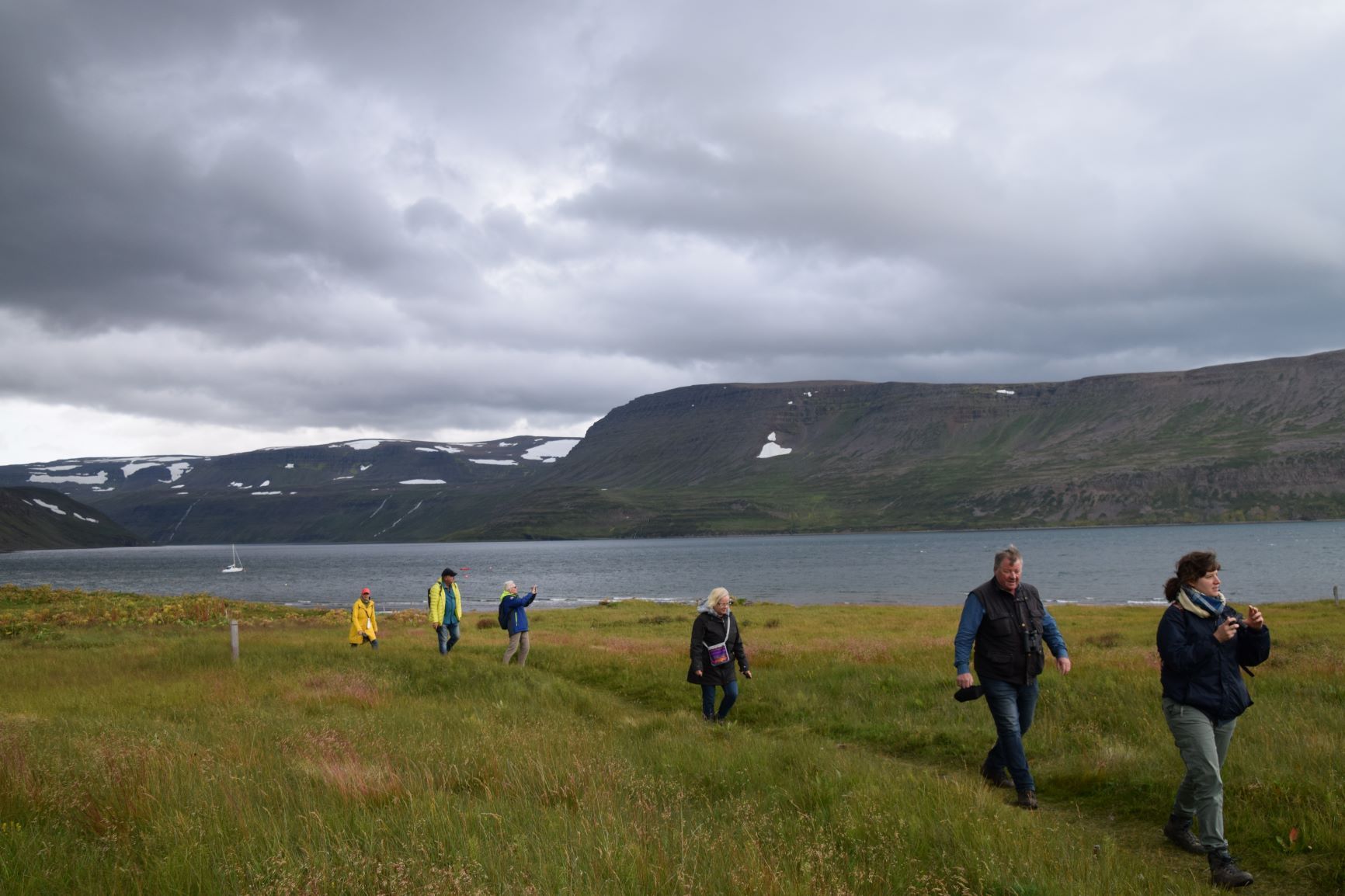 Bei wechselnd bedecktem Himmel und zügigem Wind unternehmen wir an diesem schönsten Tag der Woche einen Ausflug zum nördlichsten Inselarm Hornstrandir mit dem Titel „History at Hesteyri“, zusammen mit sieben weiteren Teilnehmenden. Schon die einstündige Überquerung des Isafjords in einem kleinen Schiff ist ein Erlebnis. Es stampft, spritzt und schüttelt gewaltig. Wenigstens empfinden wir Binnenländer es so. Der Guide meint, es sei „a little bit bumpy“. Für die Anlandung werden wir in ein Schlauchboot verfrachtet und ziemlich unzimperlich zum Steg geschleust. Schon am grauen Sandstrand sehen wir frische Spuren des Polarfuchses. Mehr lässt er allerdings nicht von sich blicken.