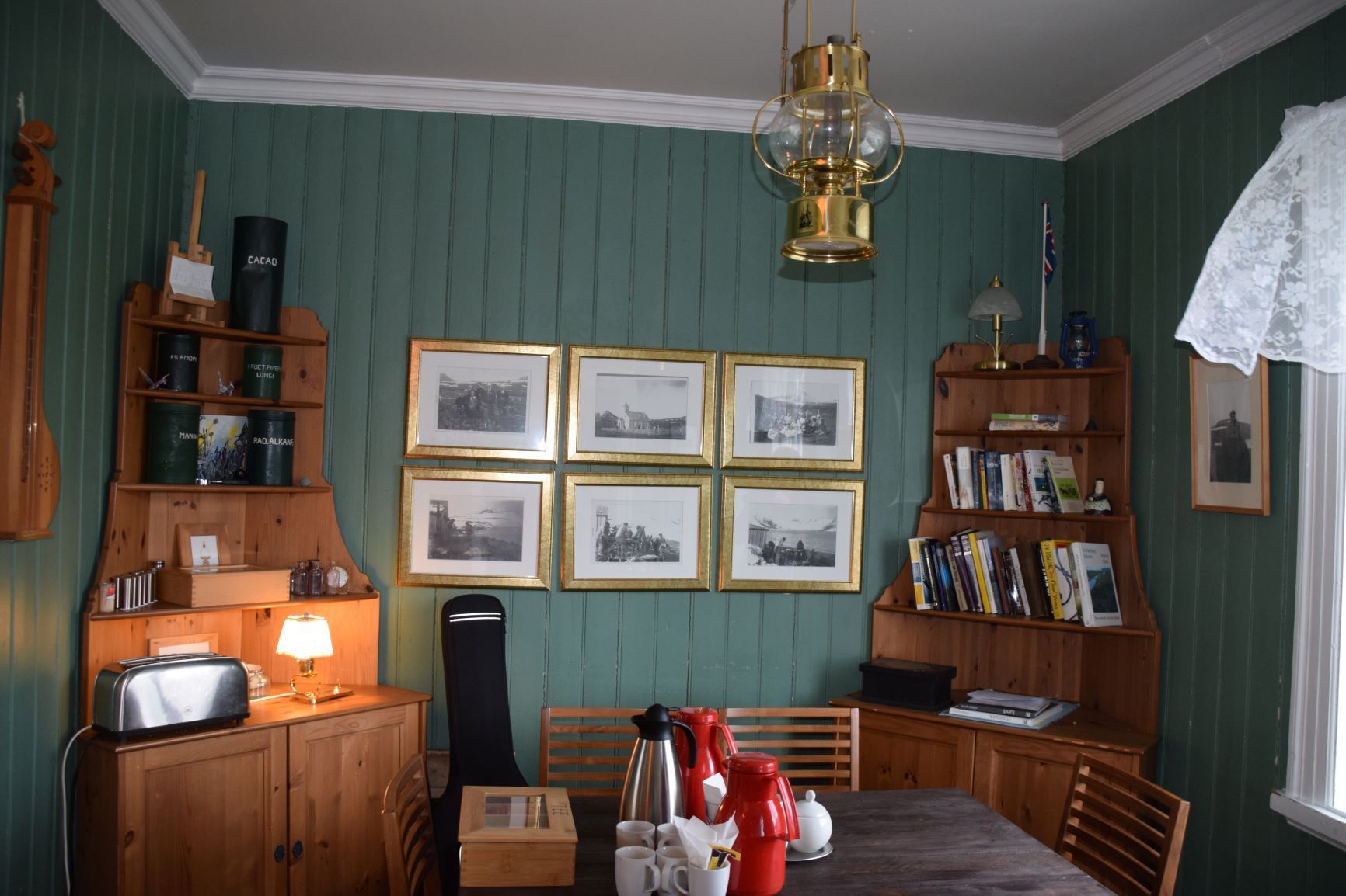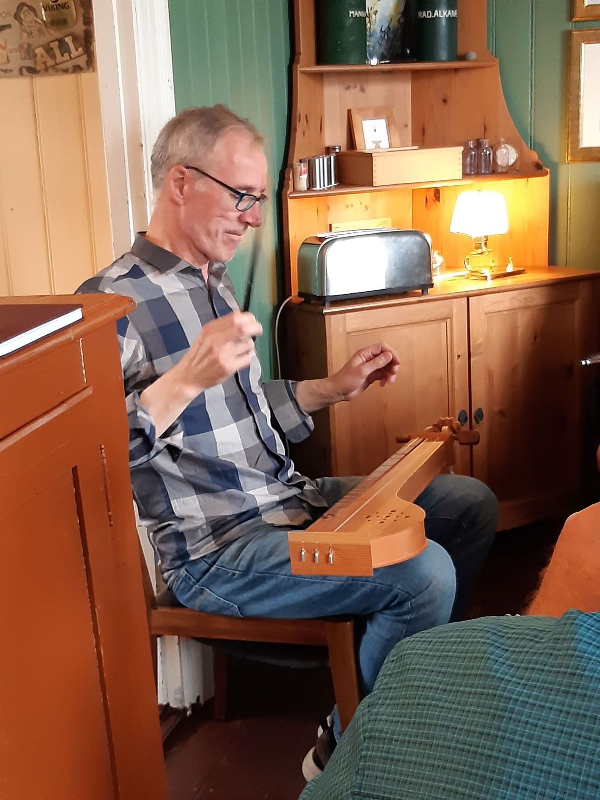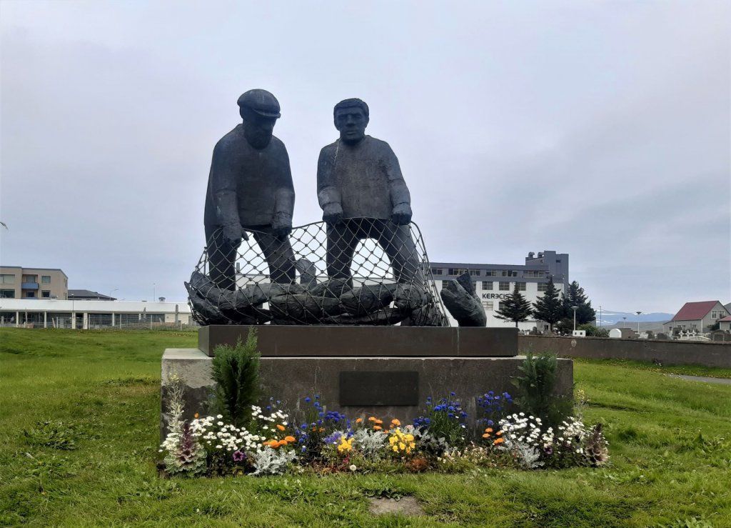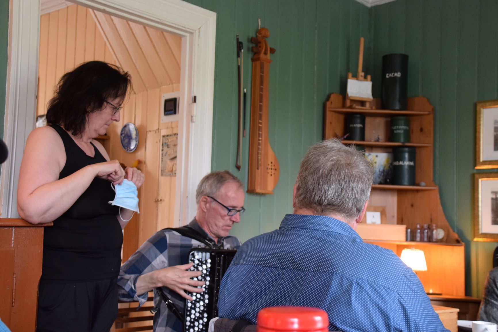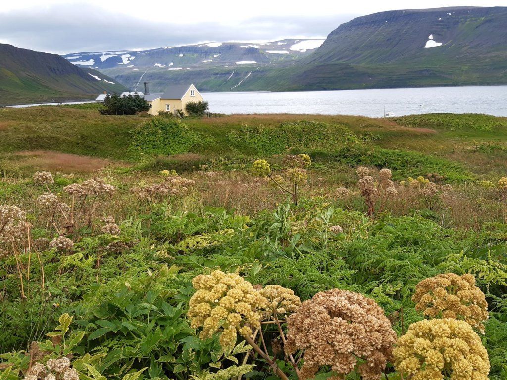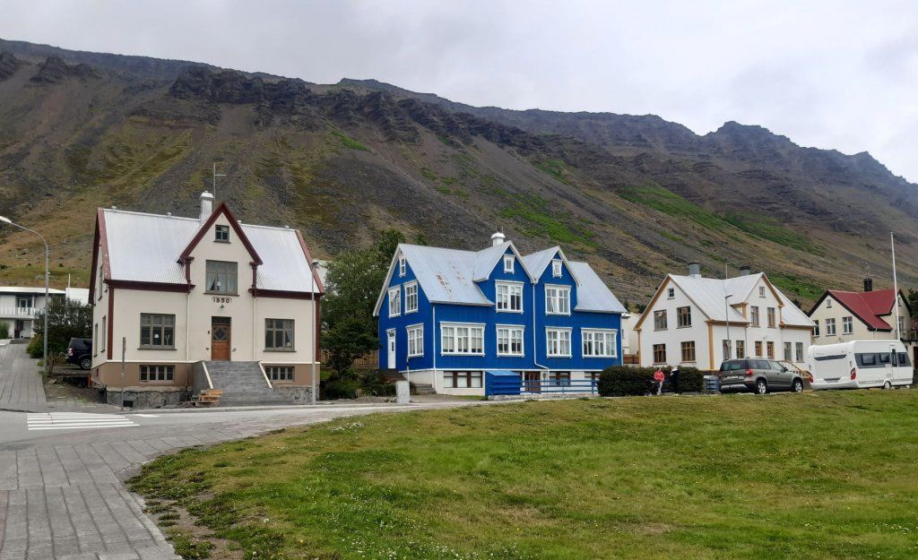 Eines dieser Häuser ist das ehemalige Doktorhaus. Dort erhalten wir einen Teller mit kleinen lokalen Häppchen wie Lachsbrötchen, Pancakes und Kuchen. Zur Unterhaltung singt die Hausherrin ein melancholisches isländisches Lied, begleitet von ihrem Ehemann am Akkordeon. Anschliessend demonstriert er uns ein spezielles Saiteninstrument, die „Langspil“ (lang ist das gleiche Wort wie in Deutsch und spil heisst Spiel).