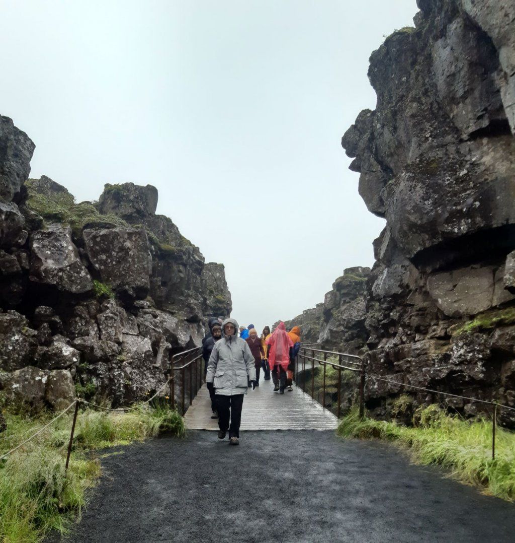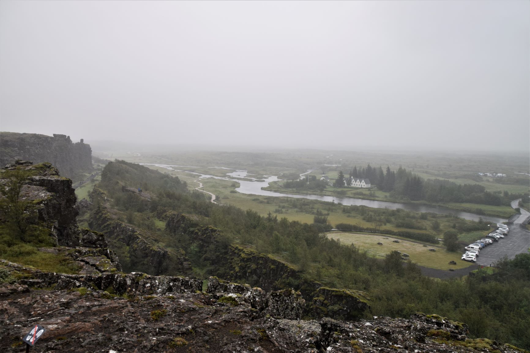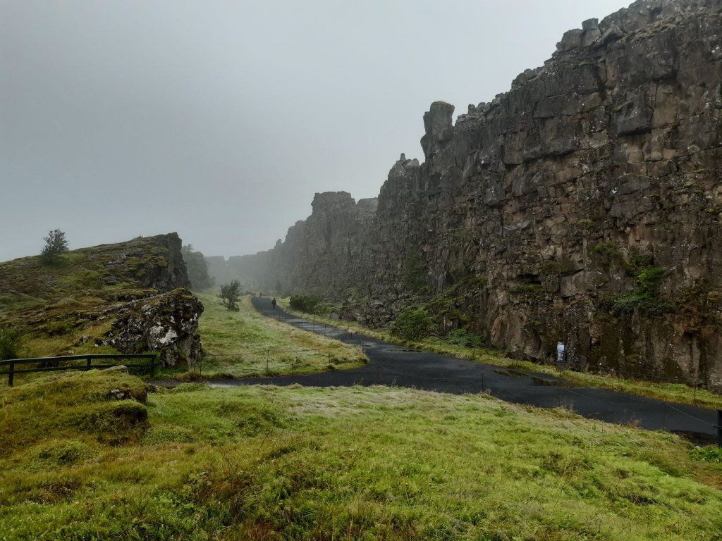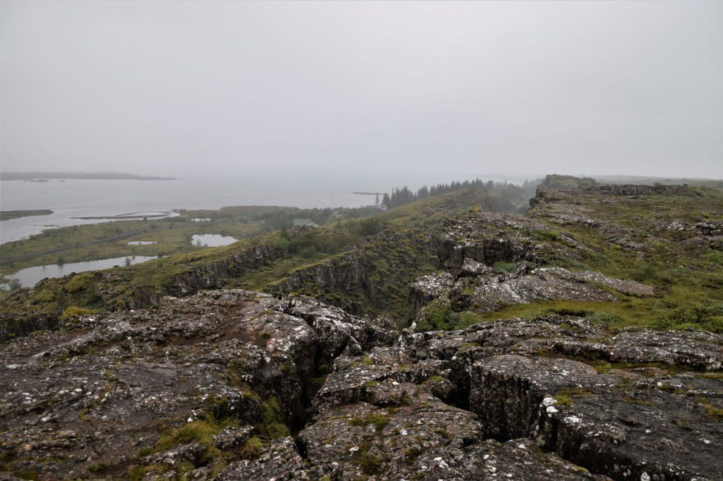Einmal mehr nisten wir uns auf „unserem“ Stellplatz am Hafen von Reykjavik ein. Wenn wir schon hier sind, erledigen wir ein paar Dinge wie Wäsche, skypen, einkaufen etc. Als alles erledigt ist, ziehen wir bei Regen und Nebel los. Zuerst besuchen wir Thingvellir, der für Isländer bedeutendste Ort des Landes. Hier kommen sie seit der Ausrufung des Freistaates 930 hin, wenn besondere Ereignisse wie die Gründung der Republik Island 1944 gefeiert werden. Der Ort ist schon seit 1928 Nationalpark und gehört seit 2004 zum Unesco-Welterbe. Besonders interessant für uns ist die Tatsache, dass hier die Fortsetzung des mittelatlantischen Rückens, wo die amerikanische und die eurasische Kontinentalplatte auseinanderdriften, deutlich zu erkennen ist. Messungen haben ergeben, dass sich der Graben, der von Nordosten nach Südwesten verläuft, in Thingvellir jährlich um 8 mm senkt und um 2 cm ausdehnt.