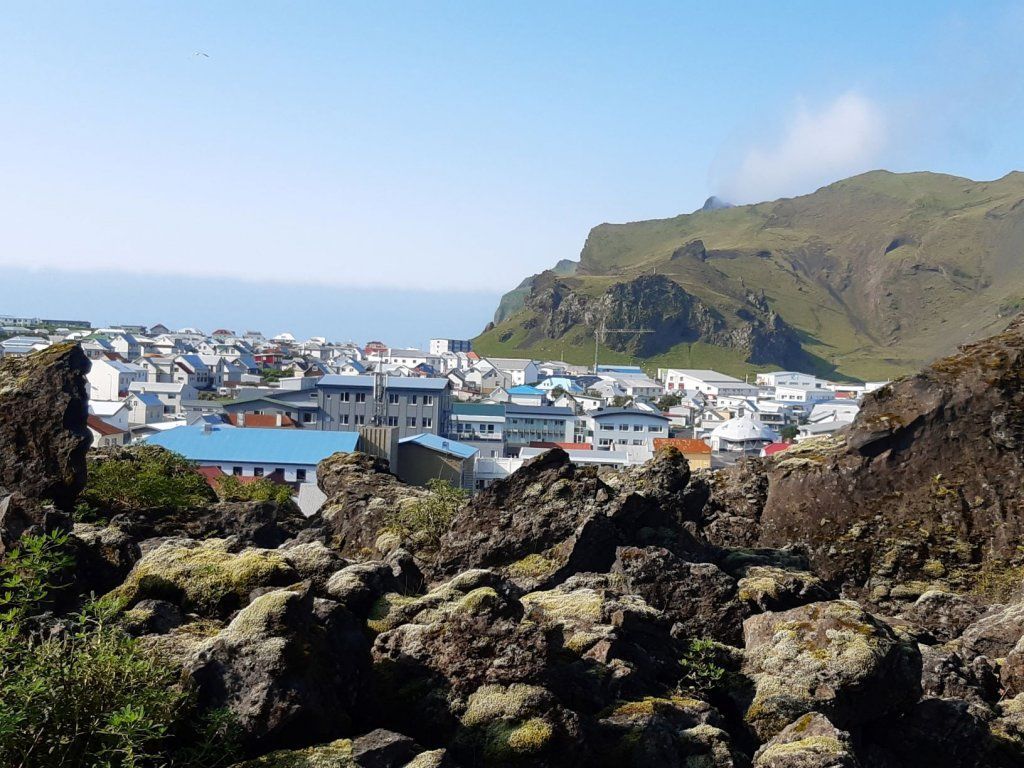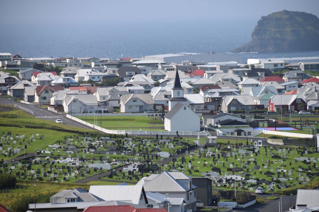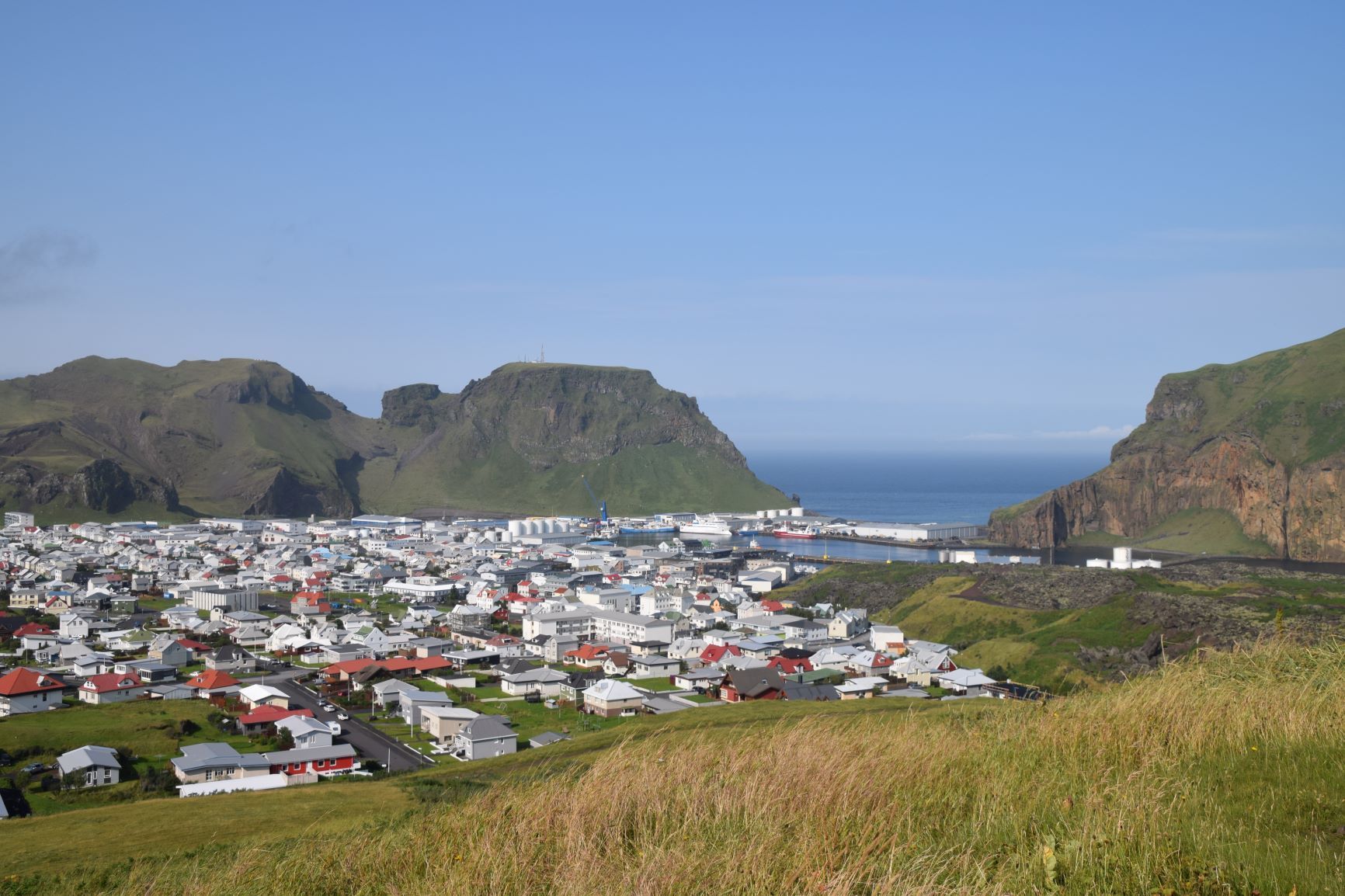 Überraschung am nächsten Morgen: Sonnig, warm, windstill! Wir bleiben noch in der Gegend und fahren ein Stück retour bis Landeyjahöfn. Dort fährt 4-5 mal pro Tag eine Fähre nach Heimaey, die grösste der Vestmannaeyjar-Inseln (Westmänner-Inseln), deren südlichste, Surtsey, erst 1963-67 entstanden ist. Heimaey wurde 1973 berühmt, als während fünf Monaten ein neuer Vulkan ausbrach. Lava und Asche begruben ein Drittel aller Gebäude unter sich und die Insel bekam einen neuen Berg, den Eldfell.