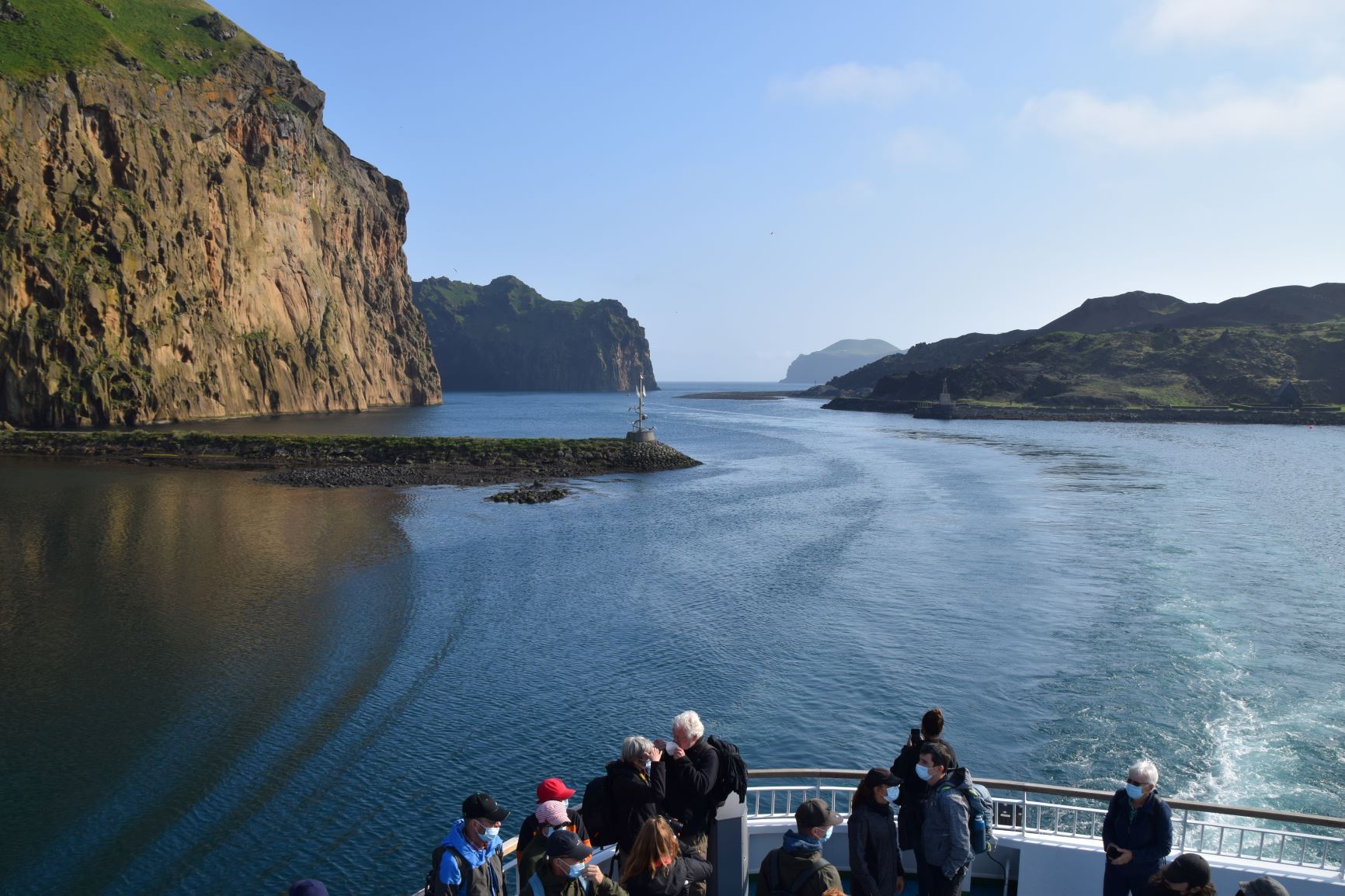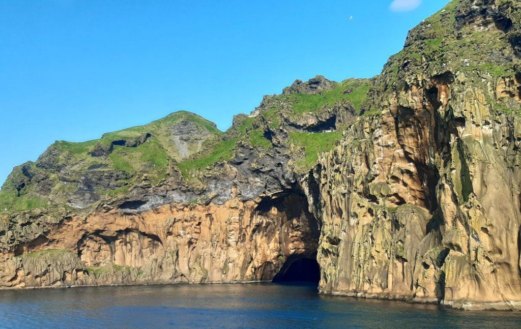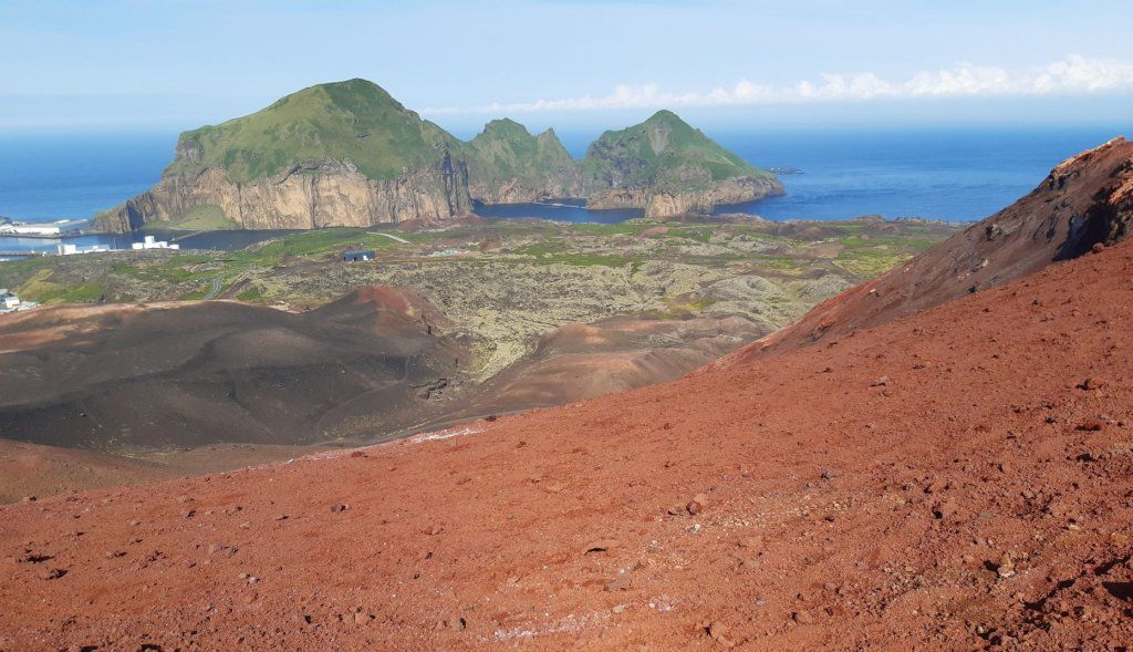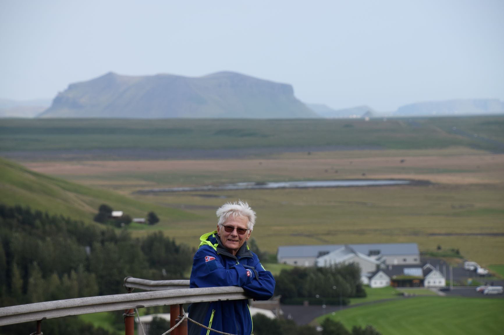 Überraschung am nächsten Morgen: Sonnig, warm, windstill! Wir bleiben noch in der Gegend und fahren ein Stück retour bis Landeyjahöfn. Dort fährt 4-5 mal pro Tag eine Fähre nach Heimaey, die grösste der Vestmannaeyjar-Inseln (Westmänner-Inseln), deren südlichste, Surtsey, erst 1963-67 entstanden ist. Heimaey wurde 1973 berühmt, als während fünf Monaten ein neuer Vulkan ausbrach. Lava und Asche begruben ein Drittel aller Gebäude unter sich und die Insel bekam einen neuen Berg, den Eldfell.