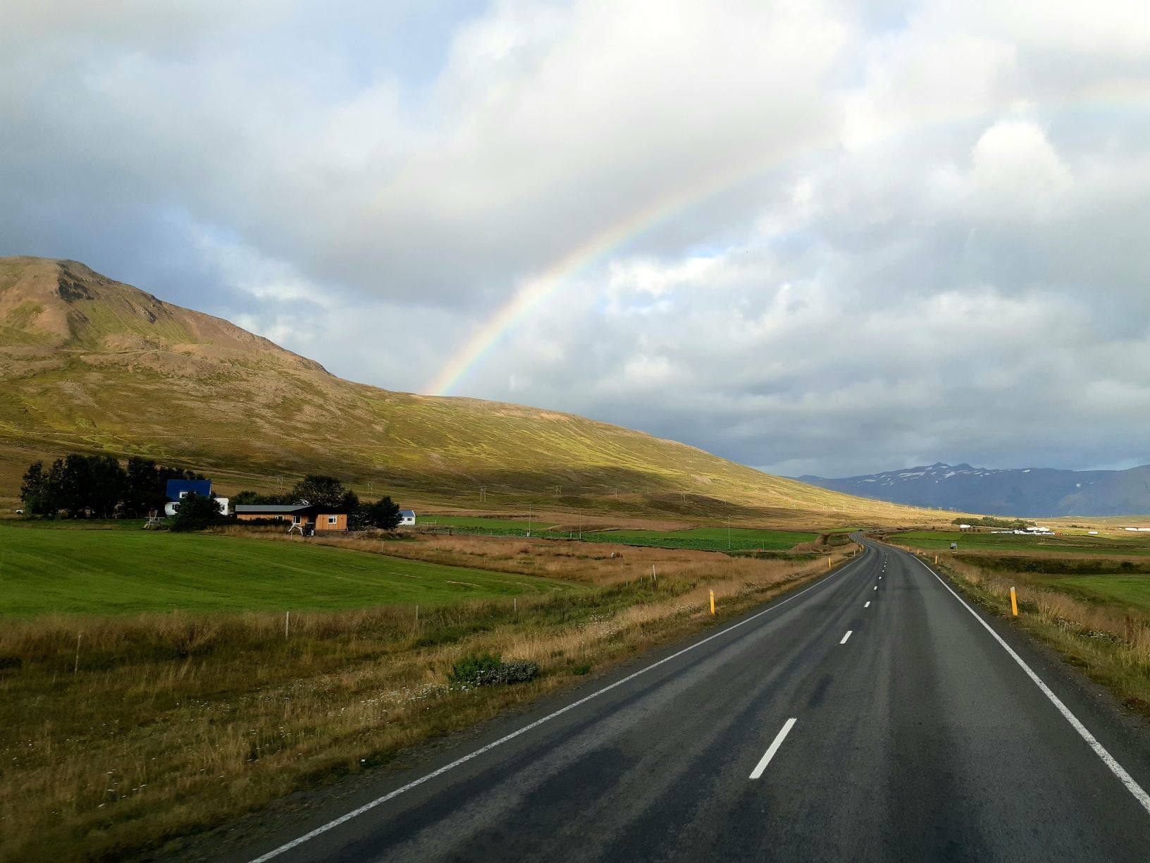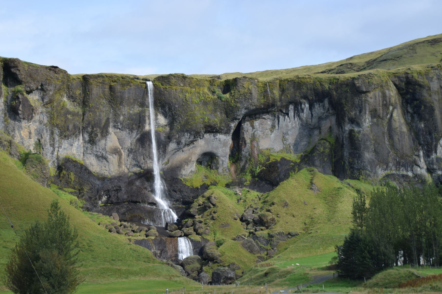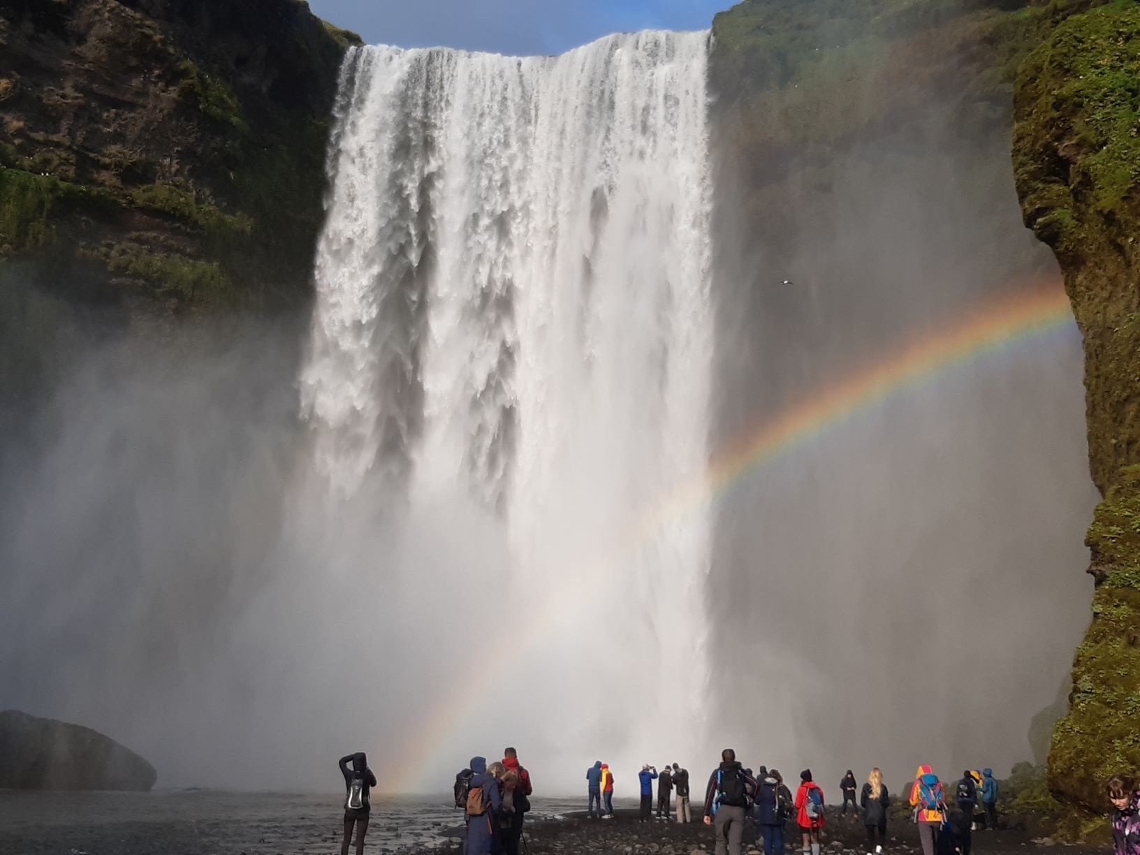 Einen fulminanten Schlusspunkt des Tages setzt der Wasserfall Skogafoss. Sein Wasser rauscht und spritzt 60m in die Tiefe, und heute sorgt sogar die Sonne für den passenden Regenbogen!