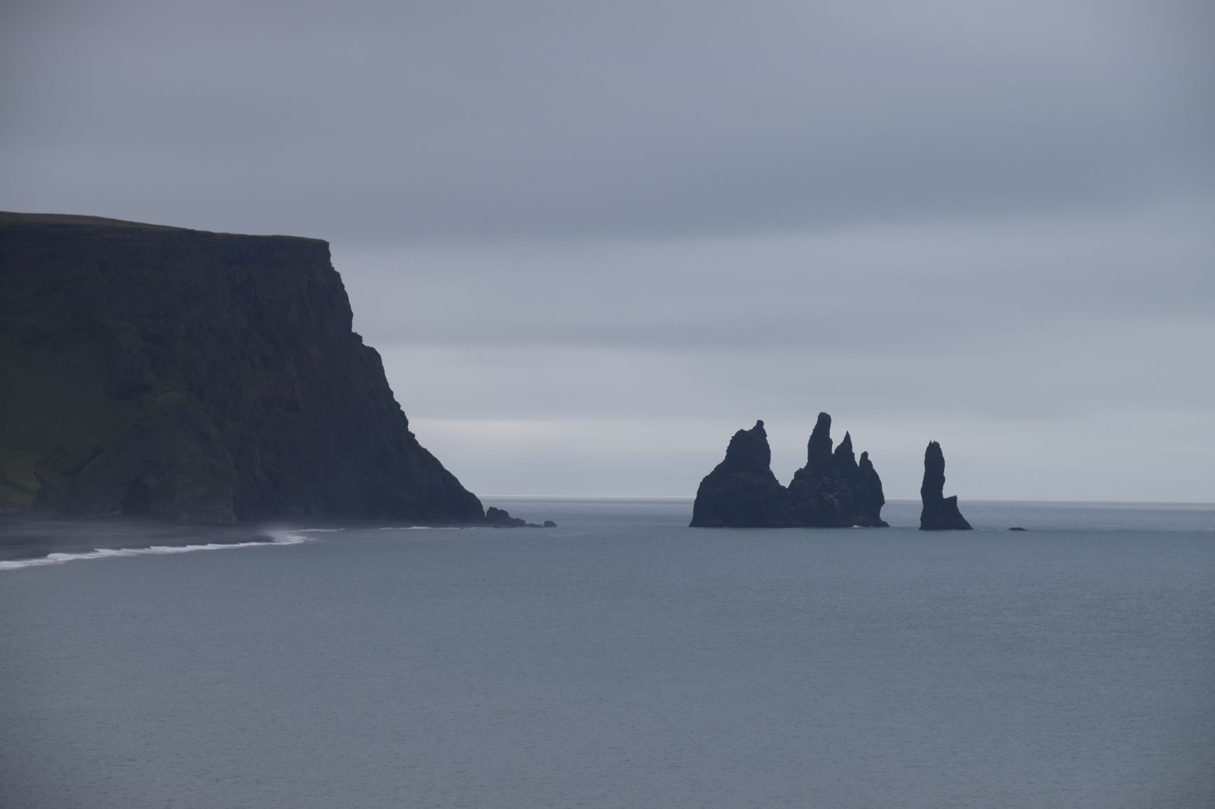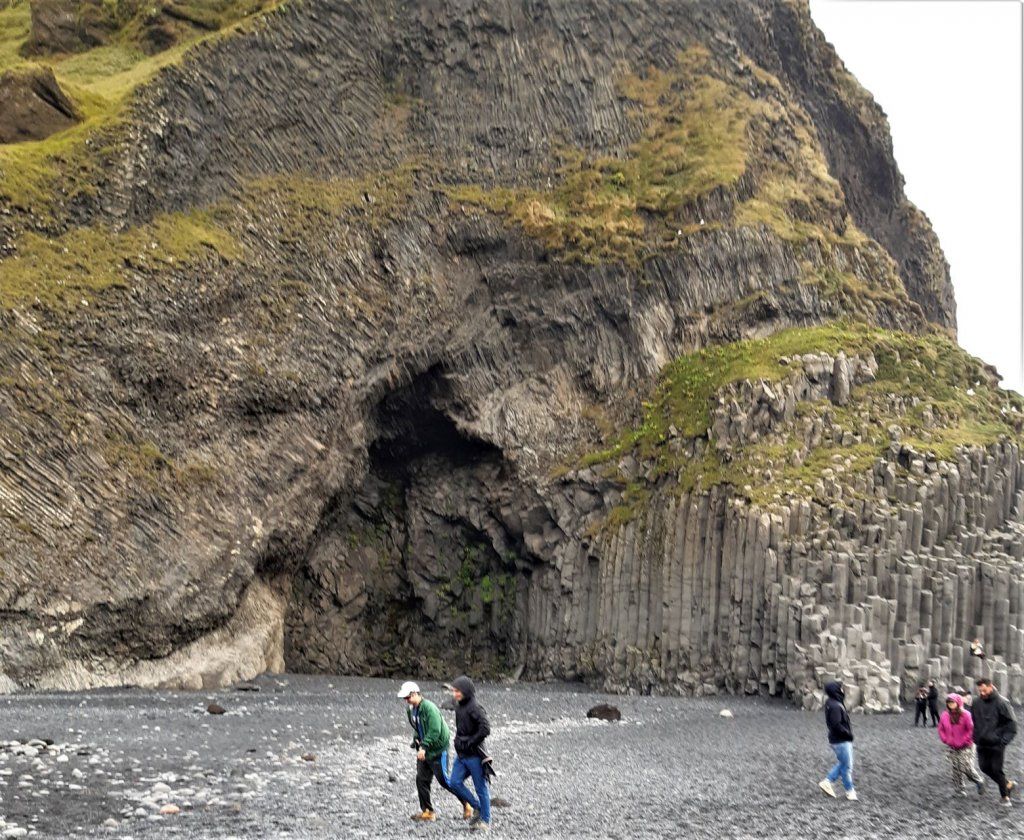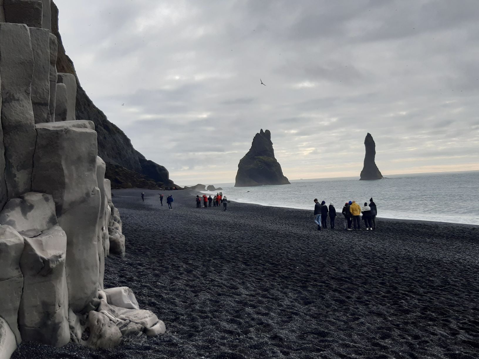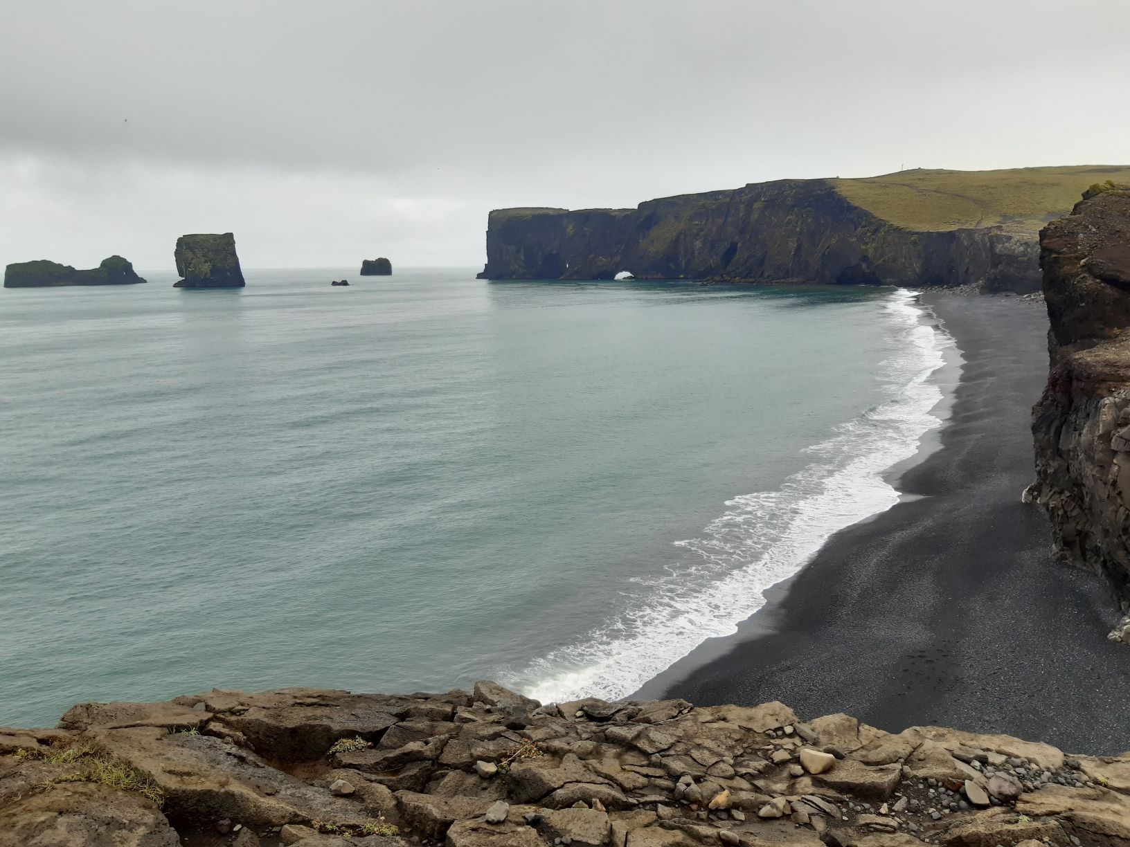 Der nächste Tag beginnt trüb. Wir fahren zur Südspitze Islands. Beim Kap Dyrholaey betrachten wir von oben schwarze Strände und bizarre Felsformationen, in Reynisfjall kommt man auf dem schwarzen Sand an Felsen und Höhlen vorbei, umrahmt von Basaltsäulen. Oberhalb der Säulen nisten unzählige Vögel.