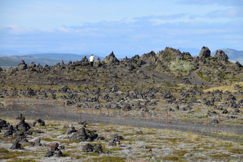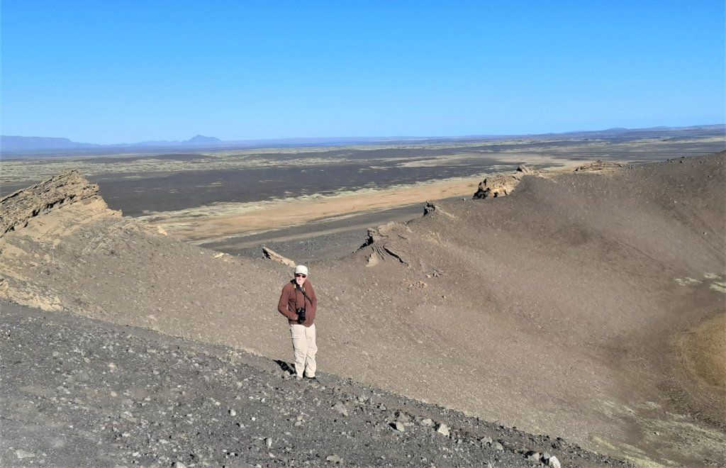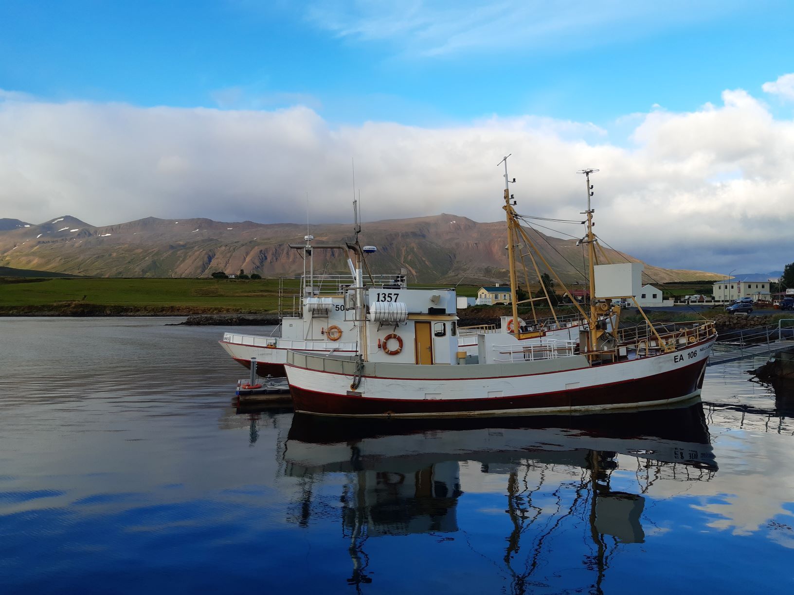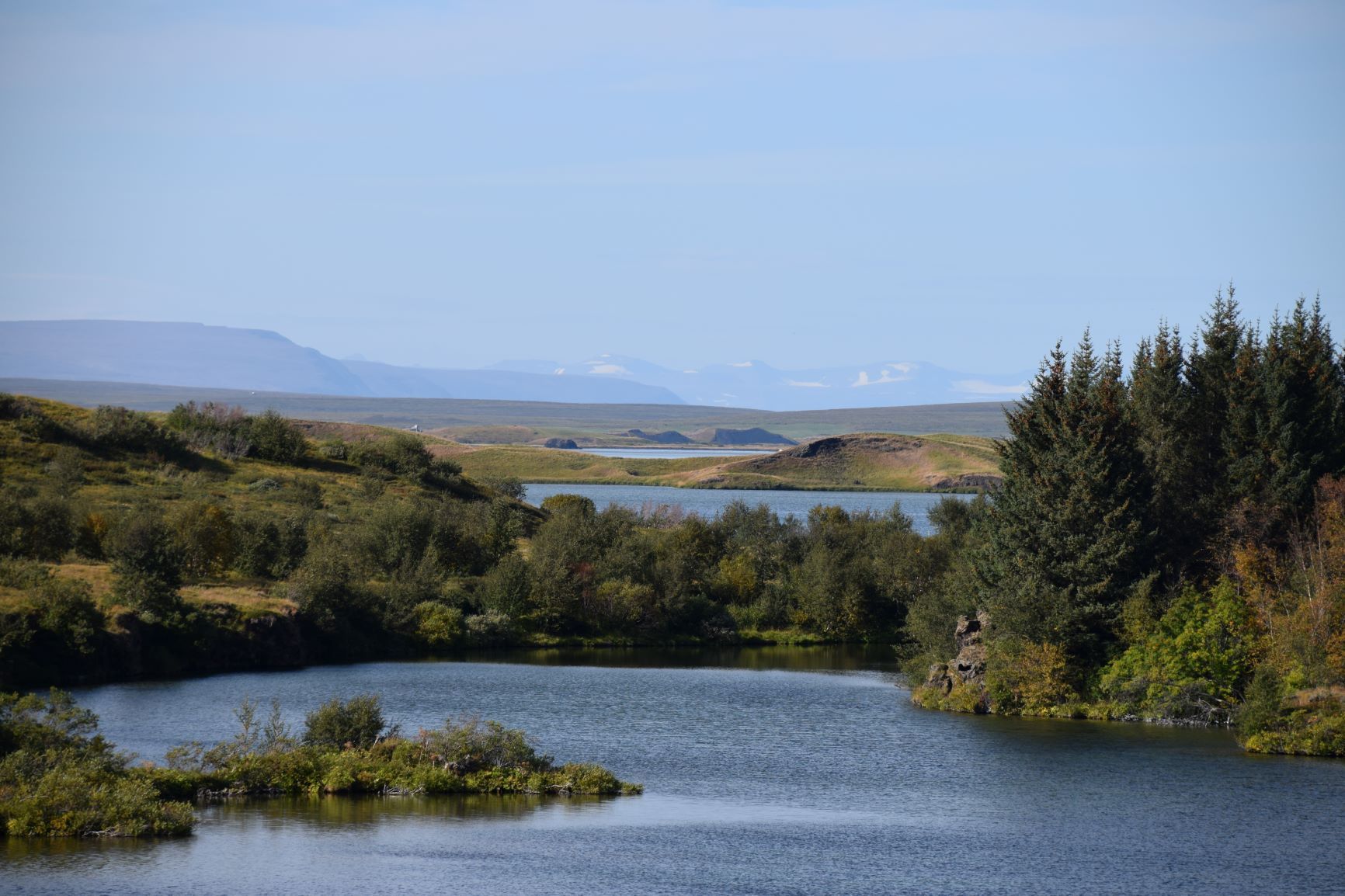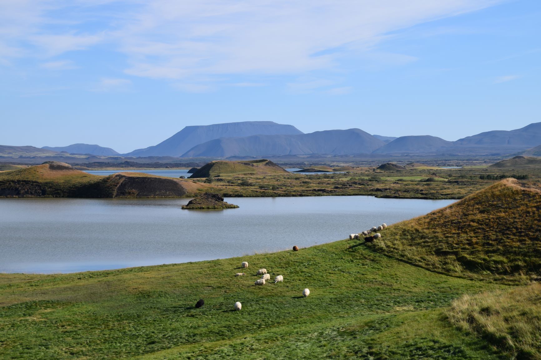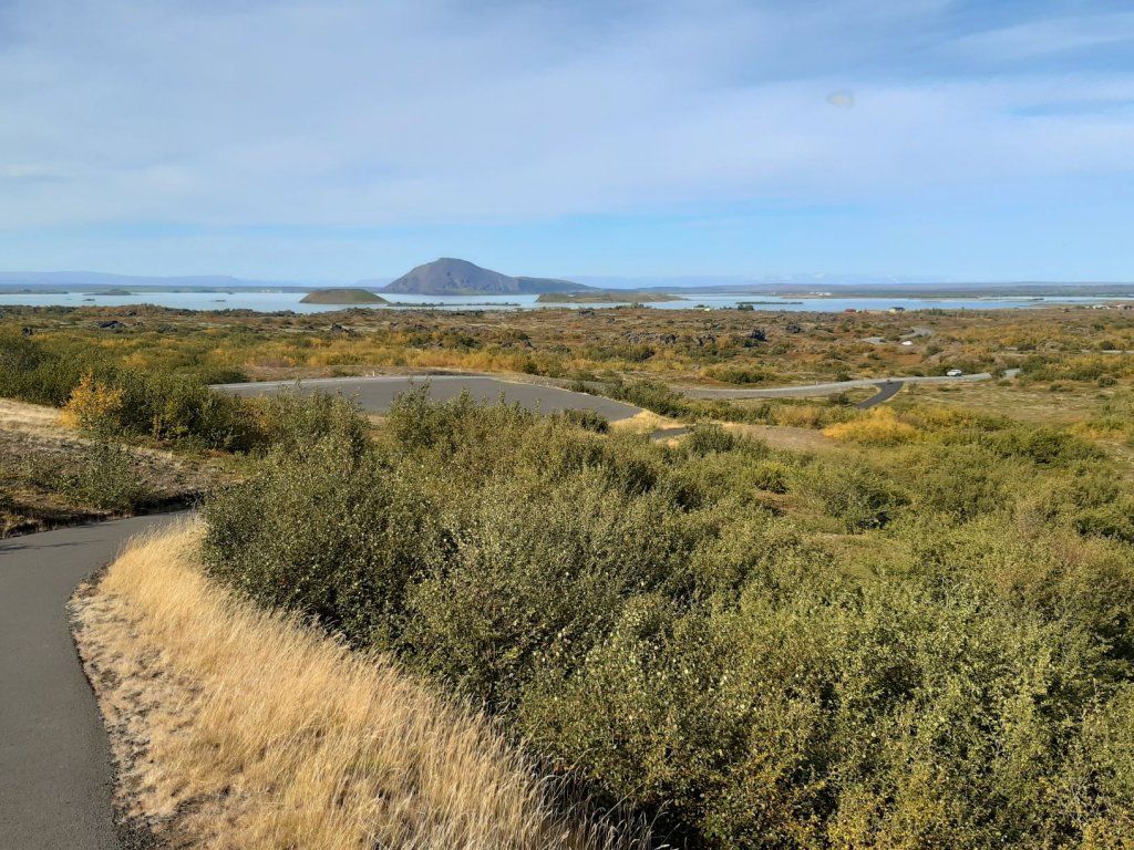 Der folgende Tag ist strahlend. Wir steigen auf „unseren“ Kraterrand, schauen in die Ferne und zum winzig kleinen Wohnmobil, bevor wir Richtung Myvatn weiterfahren. Hier waren wir schon zu Beginn der Reise, damals aber bei Regenwetter. Wir bleiben eine Zeitlang und geniessen die schöne Landschaft und die Sonne. Die Neugierde auf Neues hat aber etwas nachgelassen, der „Schwamm“ ist langsam vollgesogen. So nehmen wir den Tag gemütlich ohne spezielles Programm. Am Nachmittag fahren wir nach Akureyri zwecks Autowäsche und Einkauf und dann dem Eyjafjord nach nordwärts bis Hauganes, wo wir am Hafen ein nettes Plätzchen in Beschlag nehmen.