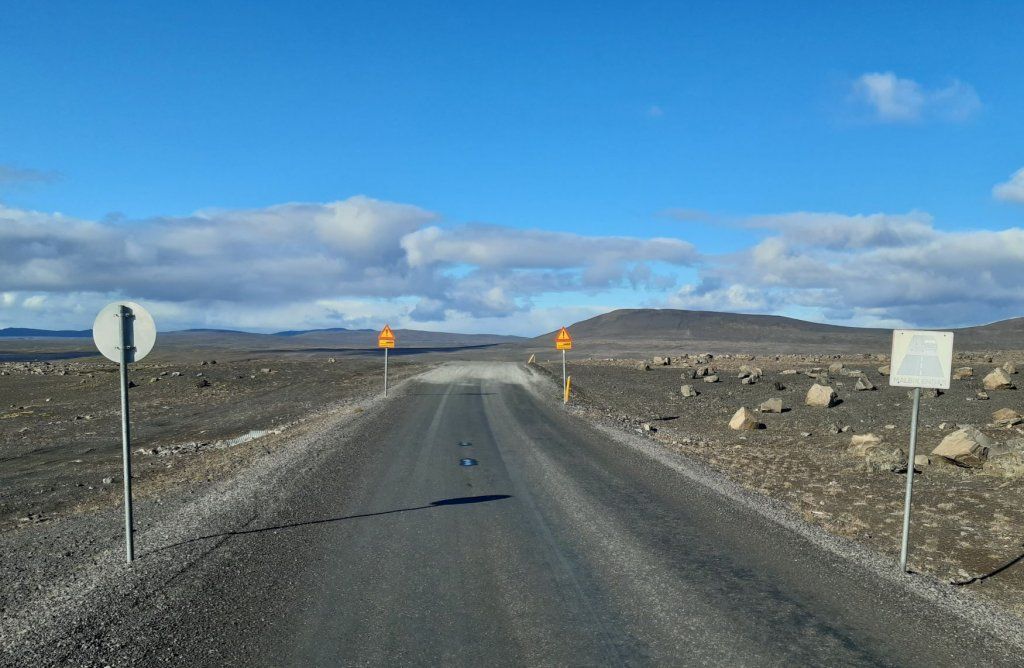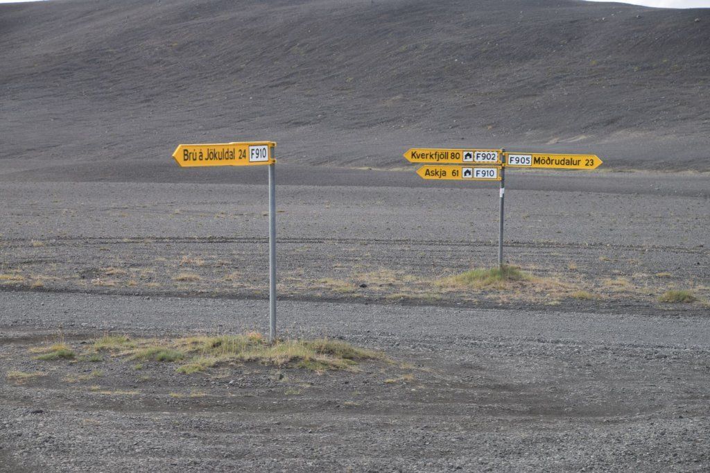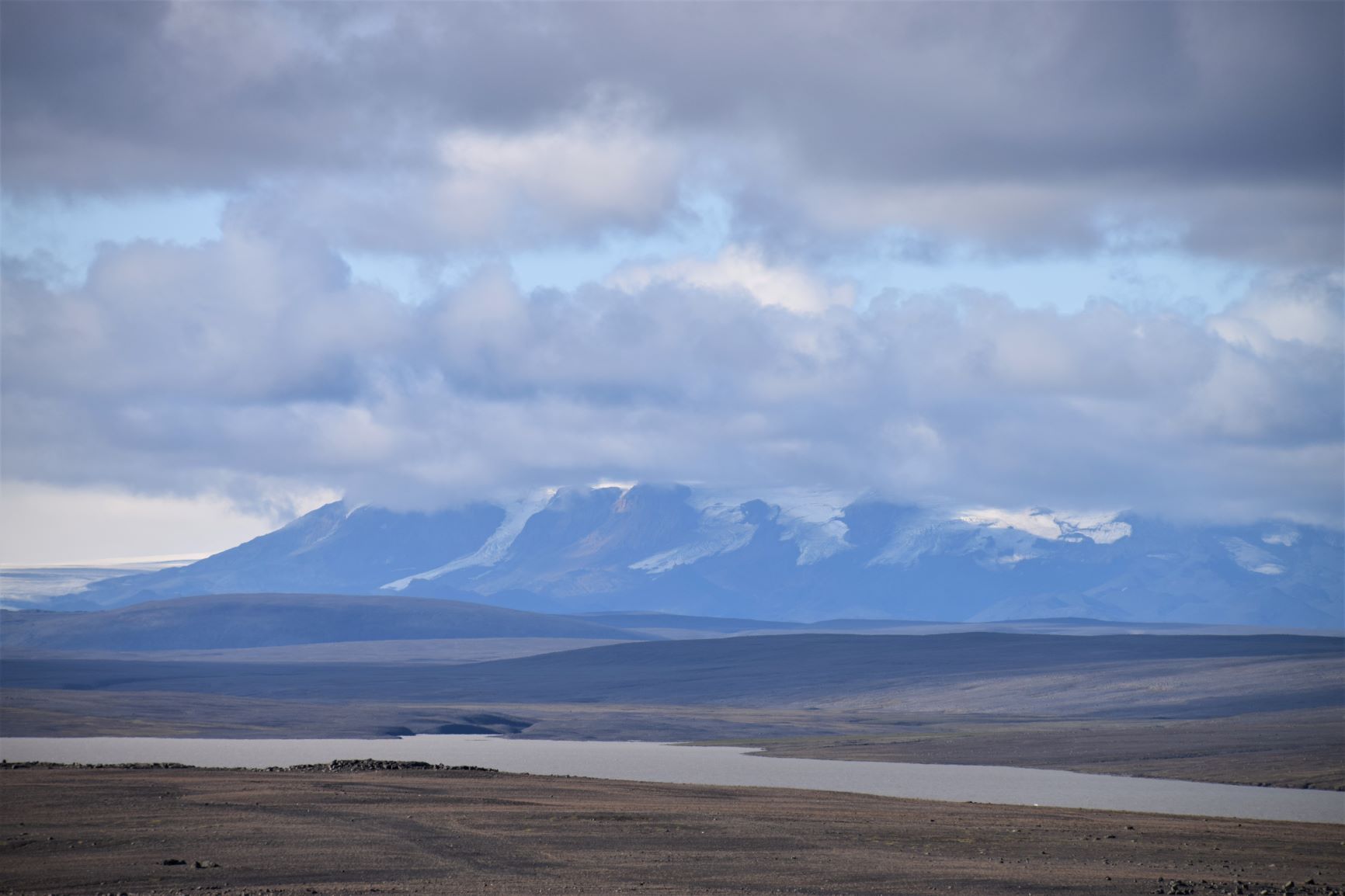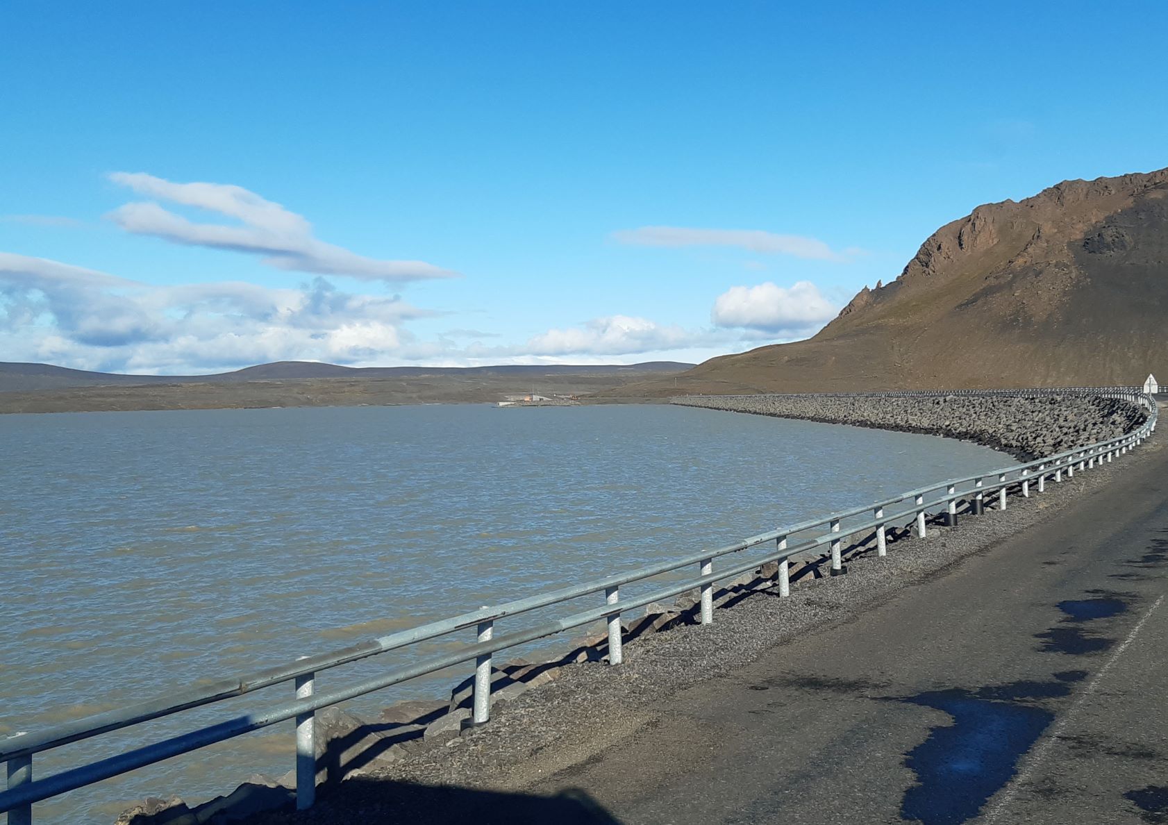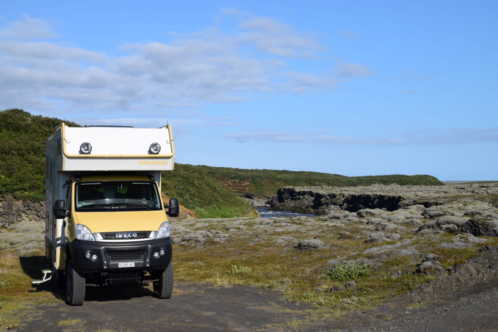 Dem langen See entlang, den der Fluss Lagarfljot gebildet hat, fahren wir südwestlich bis zum Karahnjuka Stausee. Bis hier ist die Hochlandstrasse noch asphaltiert. Dann beginnt die Rüttelpiste F910, über die wir langsam durch die karge Landschaft holpern. Der Blick in die Berge und ab und zu Richtung Gletscher ist fantastisch. Bei einem Tor wird man auf einer Tafel willkommen geheissen im Vatnajökull-Nationalpark, diesmal im Norden. Über unebenes Lavagestein und schwarzen Sand kommen wir noch einen Gang langsamer dem Campingplatz Drekagil näher, wo wir die Nacht verbringen.