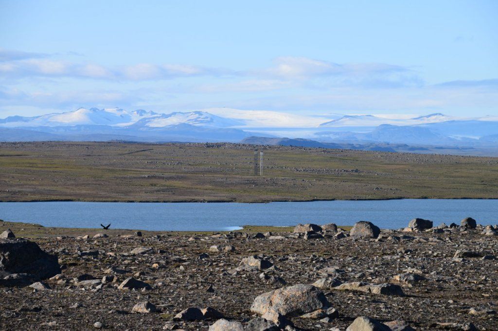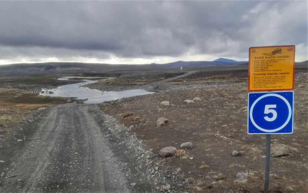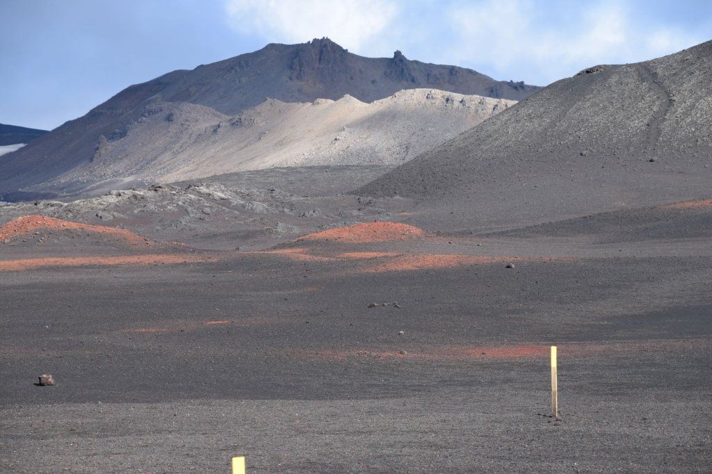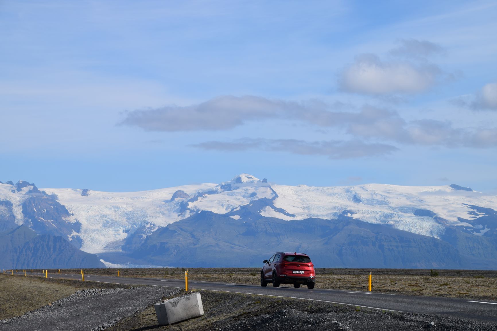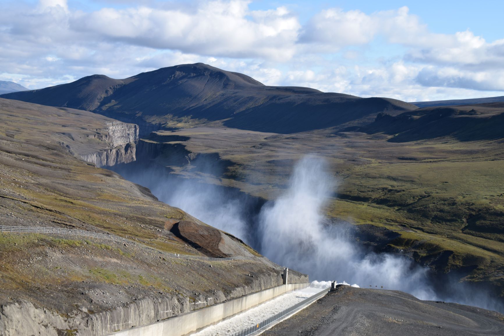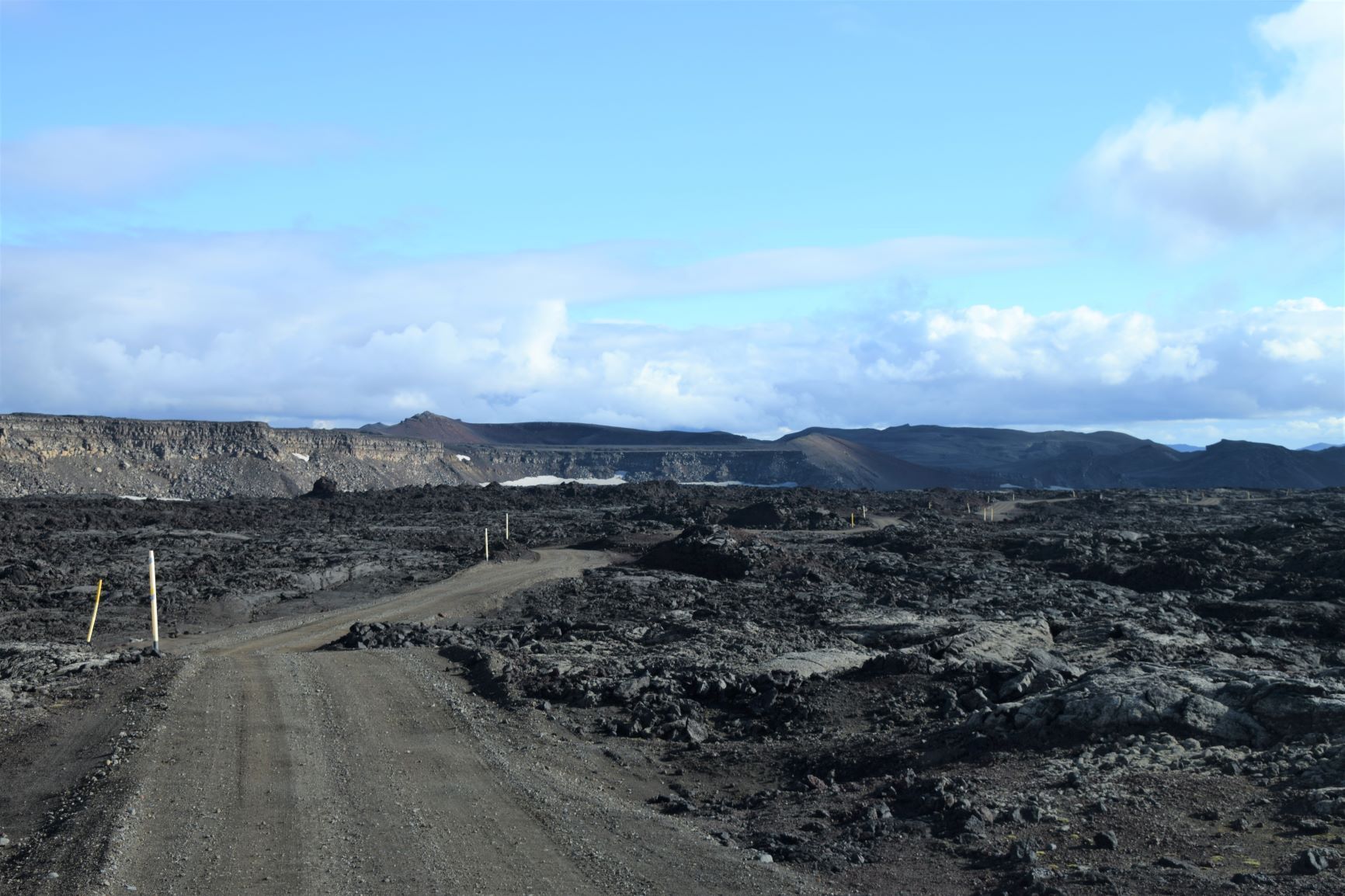 Dem langen See entlang, den der Fluss Lagarfljot gebildet hat, fahren wir südwestlich bis zum Karahnjuka Stausee. Bis hier ist die Hochlandstrasse noch asphaltiert. Dann beginnt die Rüttelpiste F910, über die wir langsam durch die karge Landschaft holpern. Der Blick in die Berge und ab und zu Richtung Gletscher ist fantastisch. Bei einem Tor wird man auf einer Tafel willkommen geheissen im Vatnajökull-Nationalpark, diesmal im Norden. Über unebenes Lavagestein und schwarzen Sand kommen wir noch einen Gang langsamer dem Campingplatz Drekagil näher, wo wir die Nacht verbringen.