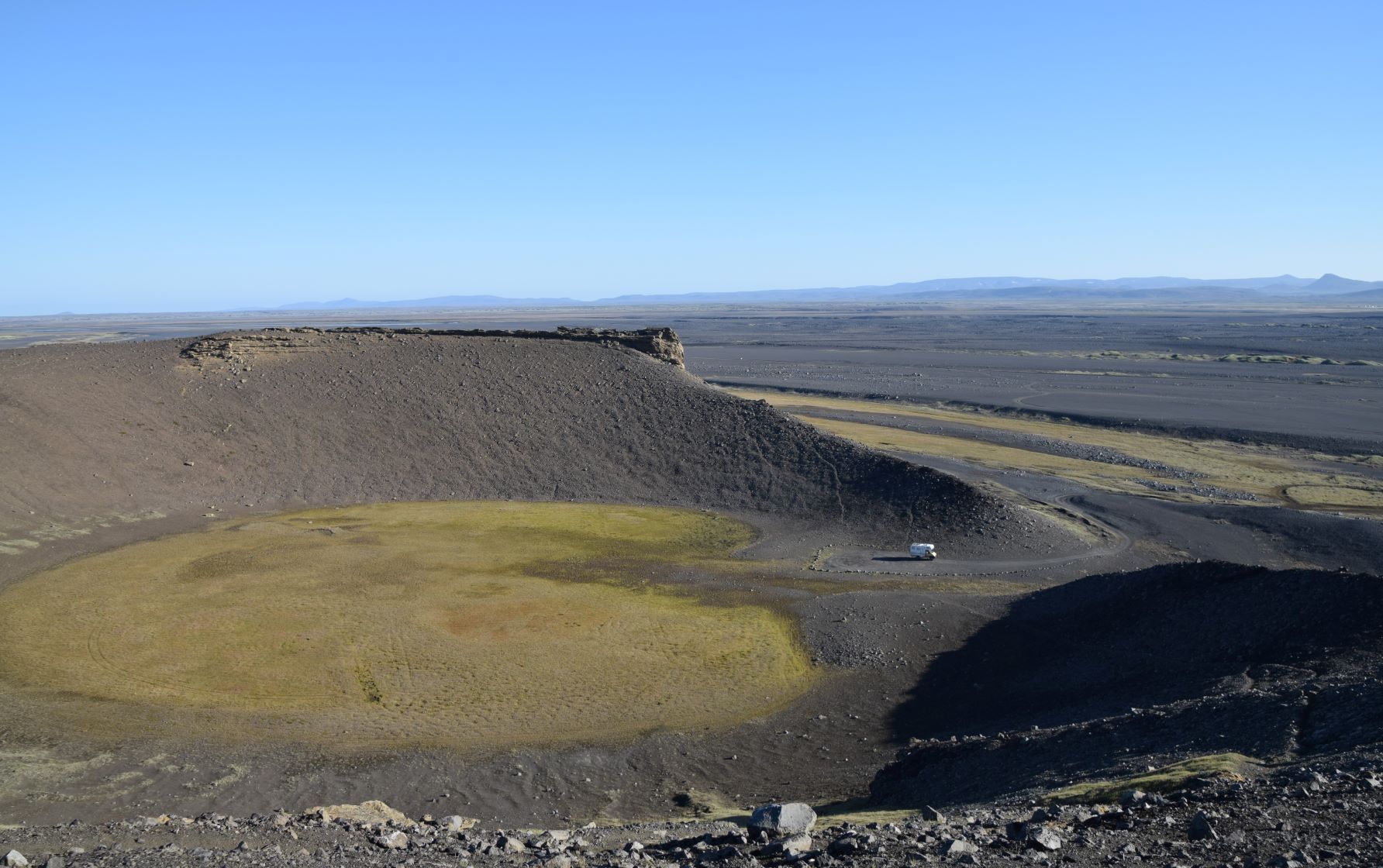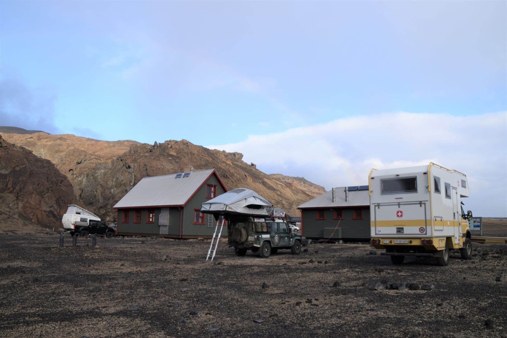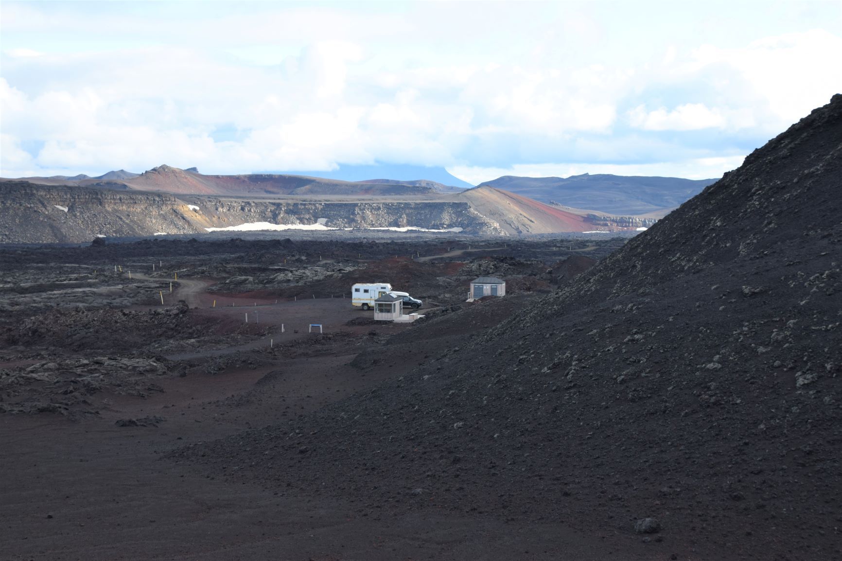 Nun holpern wir wieder den gleichen Weg wie gestern durch den Nationalpark zurück und nehmen dann die F905 nordwärts bis Mödrudalur. Die kleine Siedlung bietet den Touristen köstliche Fotosujets mit ihren nachgebauten Torfhäusern. Ein eisig kalter Wind und eine gewisse Müdigkeit unsererseits stehen aber einem gemütliche Verweilen im Weg. Ein paar Fotos, die Pneus wieder auf Normaldruck aufpumpen und dann weiter Richtung Übernachtungsplatz. Dieser passt thematisch gut zum heutigen Tag, es ist ein kleiner „Privatkrater“, wo man ruhig und ungestört schlafen kann.