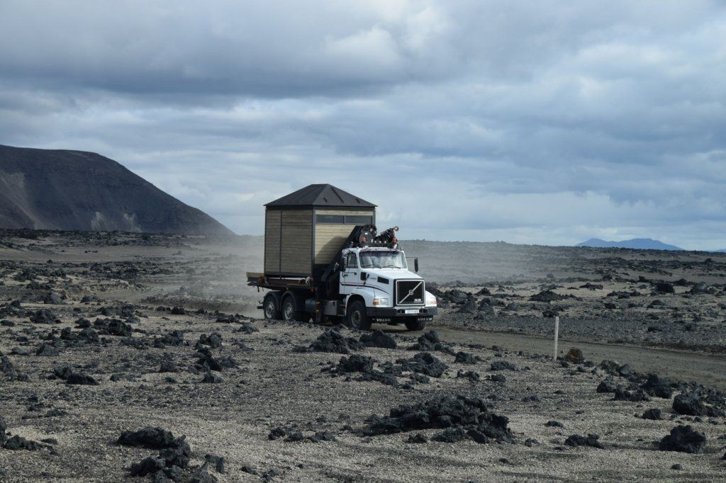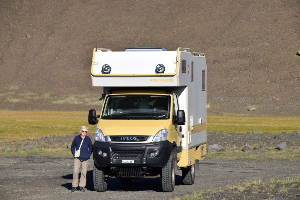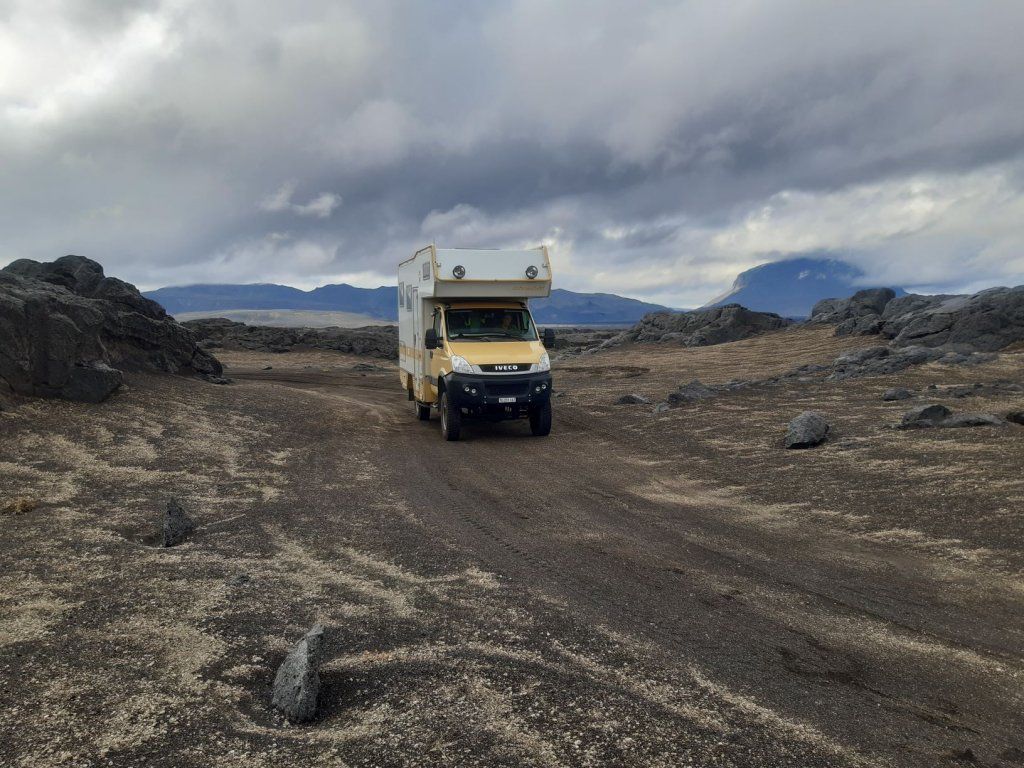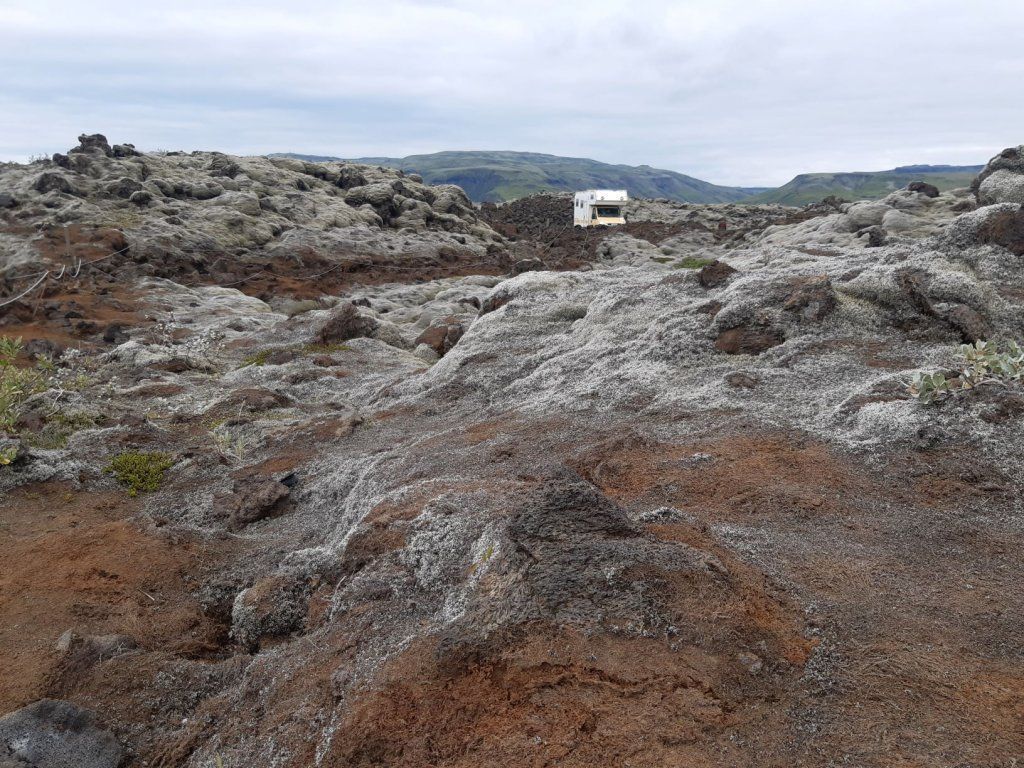 Nun holpern wir wieder den gleichen Weg wie gestern durch den Nationalpark zurück und nehmen dann die F905 nordwärts bis Mödrudalur. Die kleine Siedlung bietet den Touristen köstliche Fotosujets mit ihren nachgebauten Torfhäusern. Ein eisig kalter Wind und eine gewisse Müdigkeit unsererseits stehen aber einem gemütliche Verweilen im Weg. Ein paar Fotos, die Pneus wieder auf Normaldruck aufpumpen und dann weiter Richtung Übernachtungsplatz. Dieser passt thematisch gut zum heutigen Tag, es ist ein kleiner „Privatkrater“, wo man ruhig und ungestört schlafen kann.