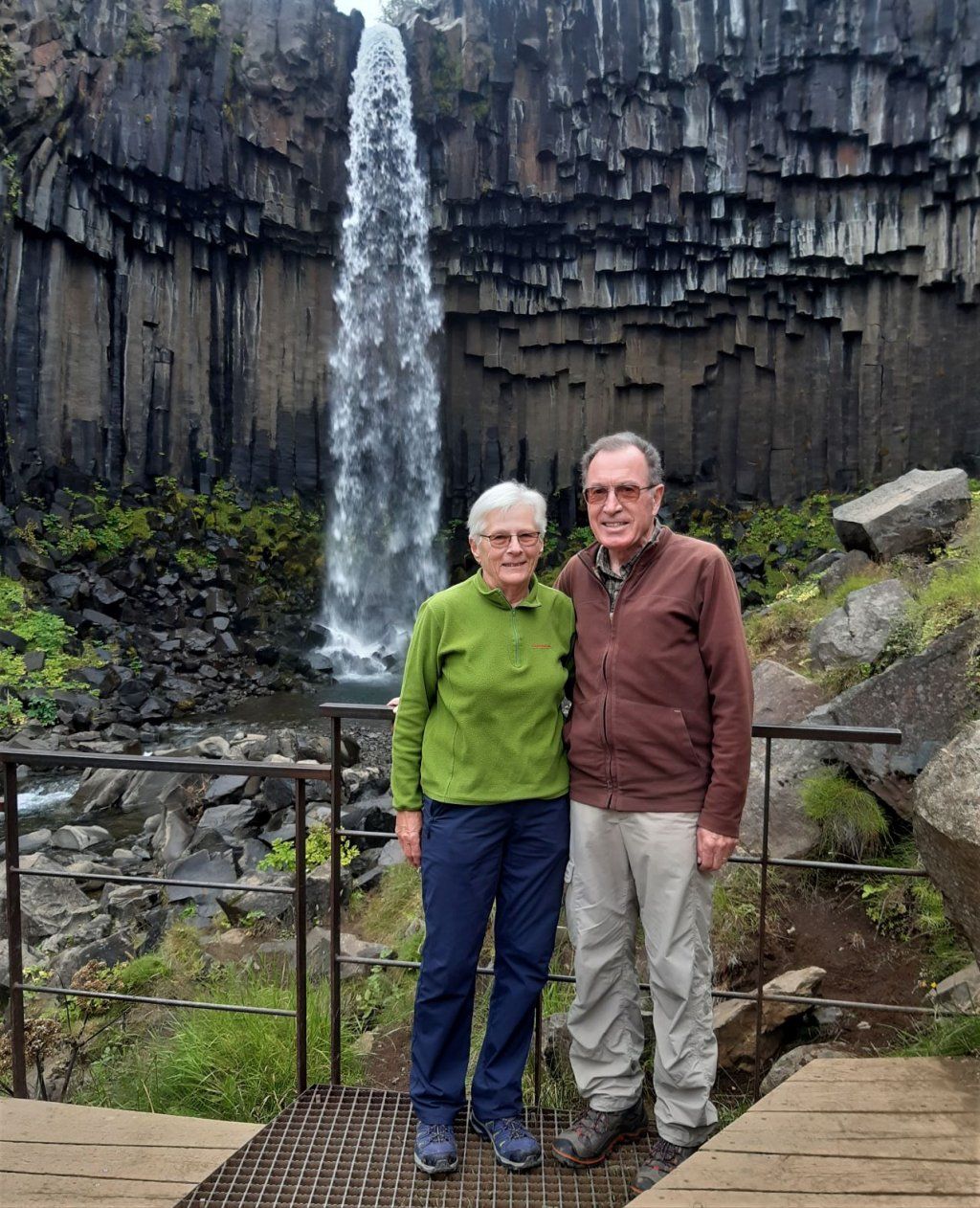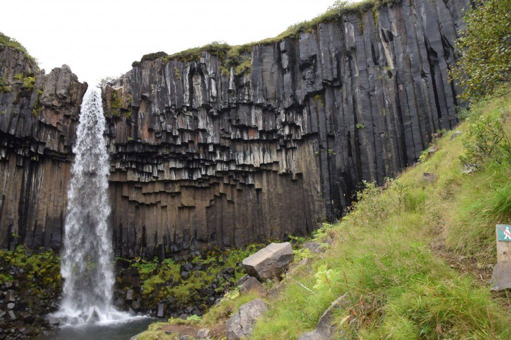 Am folgenden Morgen wandern wir zu viert in die Höhe zum Aussichtspunkt Sjonasker, dessen Aussicht über das endlose Schwemmgebiet und zum Gletscher wegen des trüben Wetters minimal ausfällt, und zum Wasserfall Svartifoss, umrahmt von Basaltsäulen.