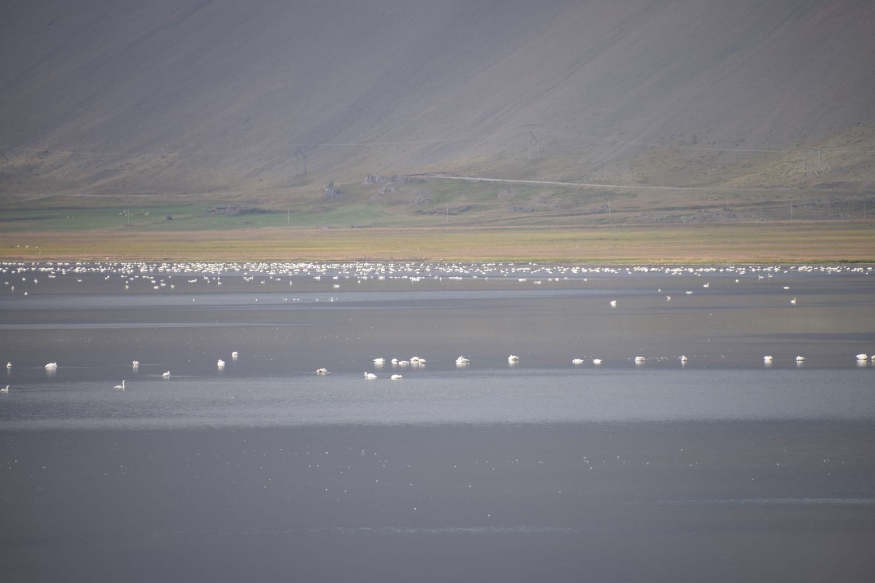Später meldet sich die Sonne zurück und spendet angenehme Wärme. Im Vorbeifahren sehen wir eine enorm grosse Anzahl Singschwäne, doch ausgerechnet da hat es keinen Parkplatz. Vom nächst möglichen Platz aus sehen wir sie noch in der Ferne. Ein paar weitere schwimmen auch etwas näher und laut „singend“ vorbei. Ihr Gesang gehört aber eher in die Kategorie Lärm, so wie bei einigen Menschen auch. Zehn Minuten später, beim Leuchtturm Hvalnes, bläst bereits wieder ein garstiger, kalter Wind.