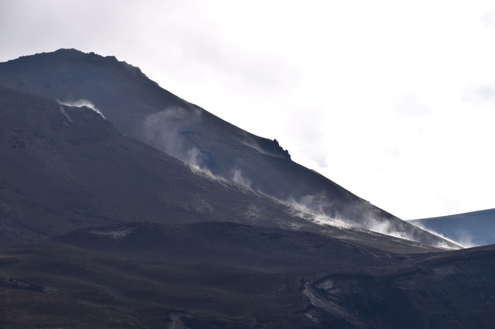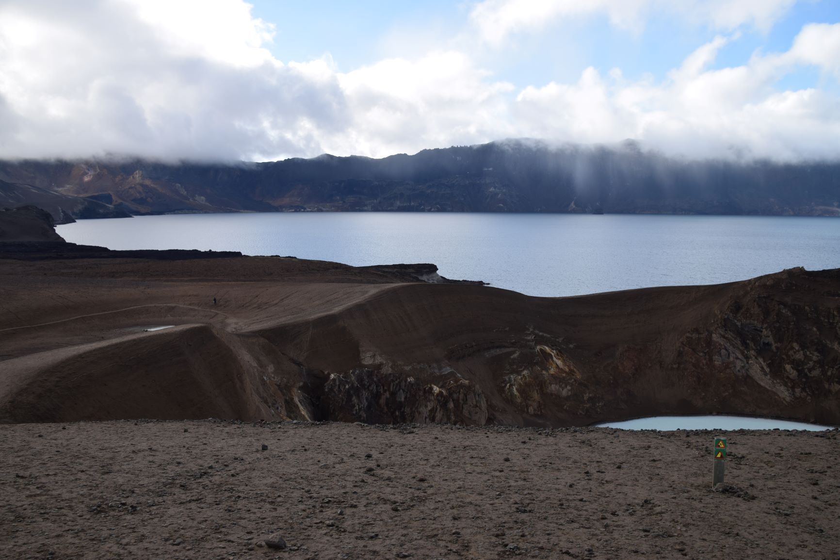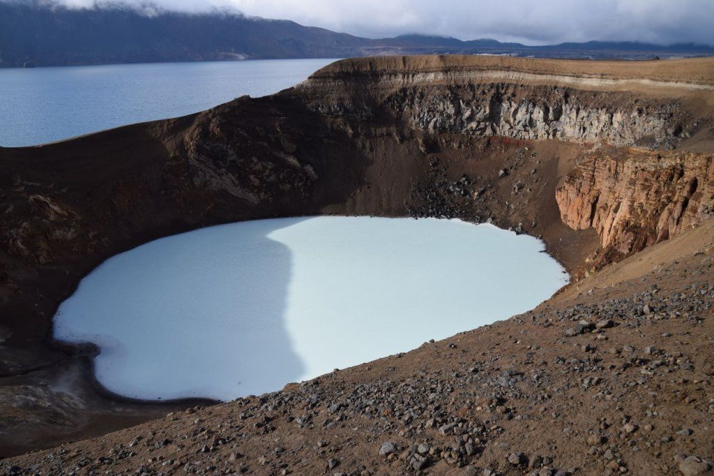Warm eingepackt machen wir uns am frühen Morgen auf in Richtung Krater, die ersten paar Kilometer mit dem Auto, die folgenden 3 zu Fuss. Die Caldera Askja mit dem See Öskjuvatn ist vor rund 6000 Jahren entstanden, es ist ein fast kreisförmiger Einsturzkessel mit einem Durchmesser von 8 km. Am Nordrand des Sees liegt der Kratersee Viti mit seinem milchigen, grünblauen Wasser. Hier könnte man ein warmes Bad nehmen, was in dieser Kälte durchaus willkommen wäre. Aber: Es geht steil hinunter und es riecht extrem übel...