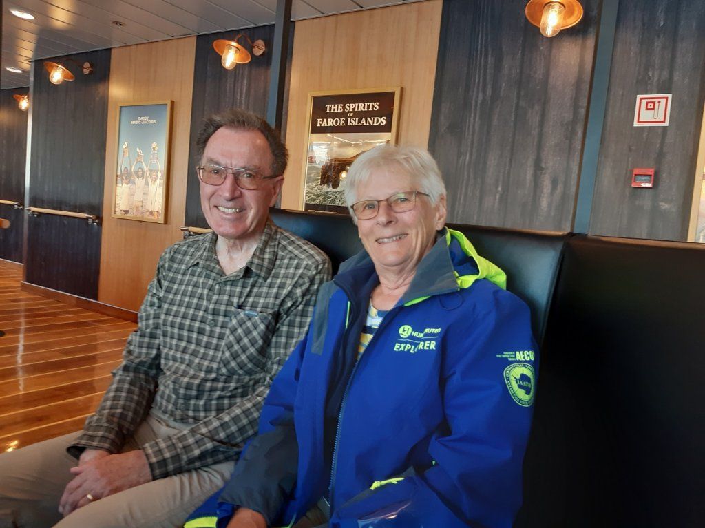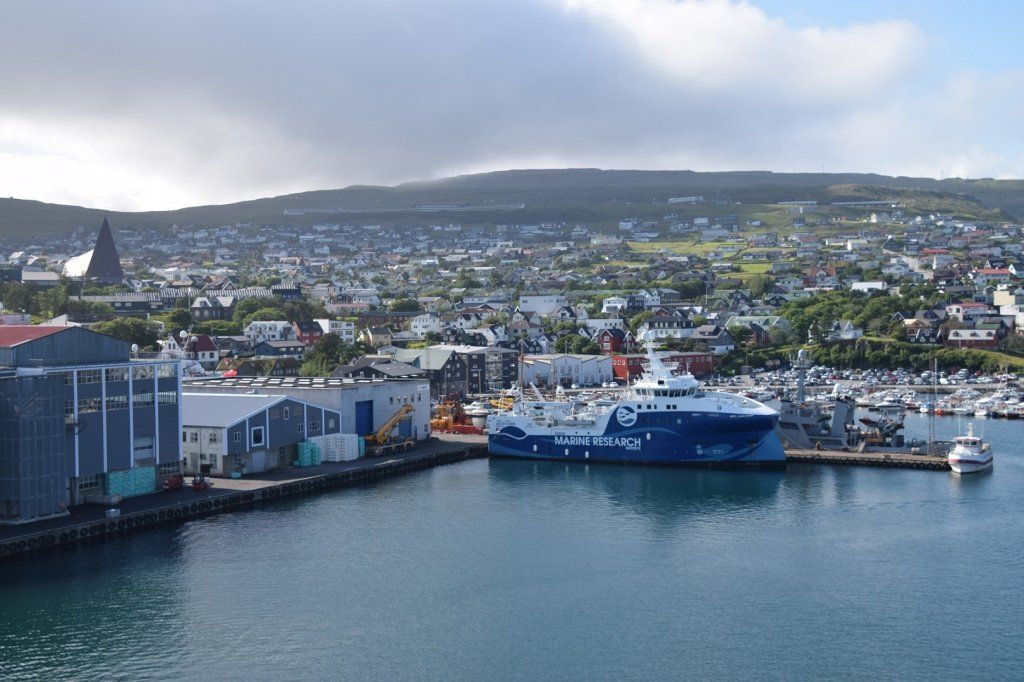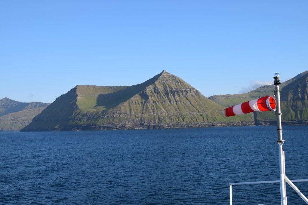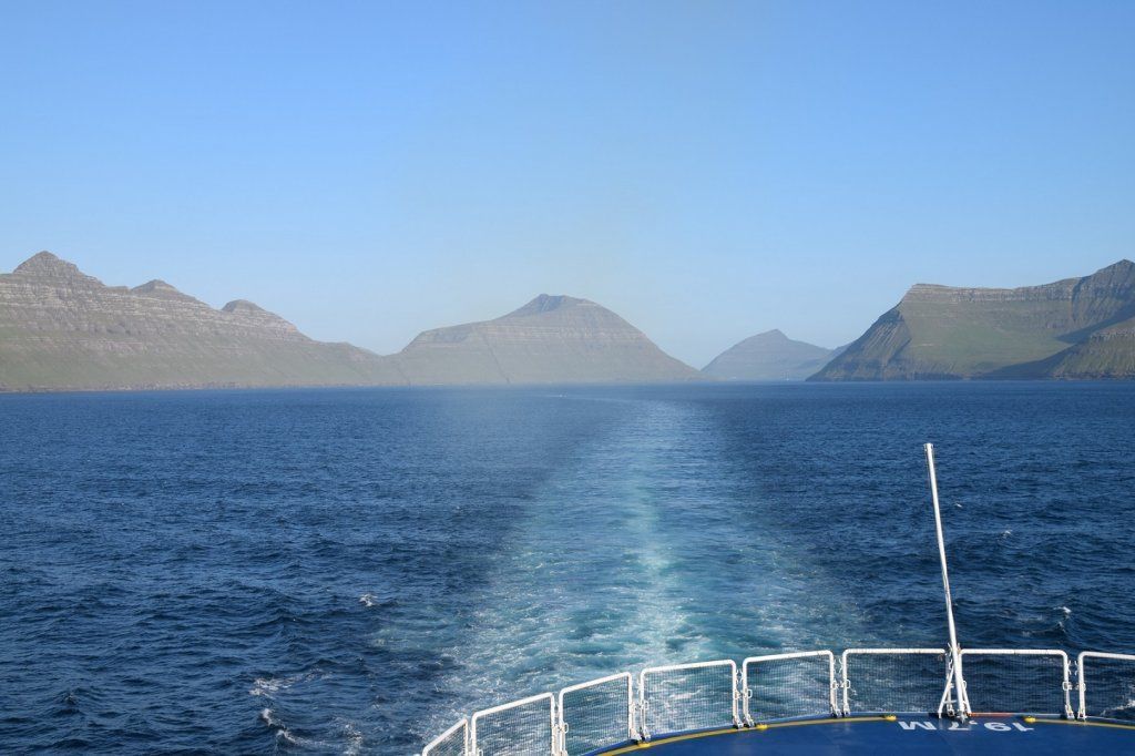 Im norddänischen Hirtshals können wir am Dienstag, 20. Juli nach geduldiger Wartezeit in den Bauch der riesigen Fähre Norröna fahren und für die zwei Nächte eine der rund 800 Kabinen beziehen. Zu unserer Freude liegt sie auf Deck 8 am Bug mit einem Fenster in Fahrtrichtung. Da sieht man hauptsächlich Wasser bis zum Horizont und im Norden ein paar Stunden lang die norwegische Küste im Dunst. Aufenthalte im Aussenbereich beschränken wir auf ein Minimum, der starke Nordwestwind, dem wir entgegenfahren, weht uns beinahe über Bord. Am Mittwochnachmittag lichtet sich der Nebel, sodass man die Färöerinseln aus dem Meer auftauchen sieht. Die Fähre legt an und nimmt nochmals eine grosse Menge Fahrzeuge und Menschen auf, darunter auch unsere Freunde Beatrice und Hans.