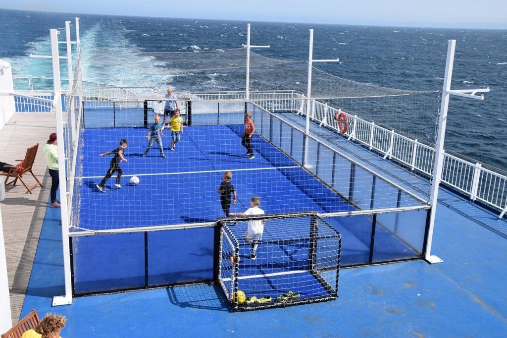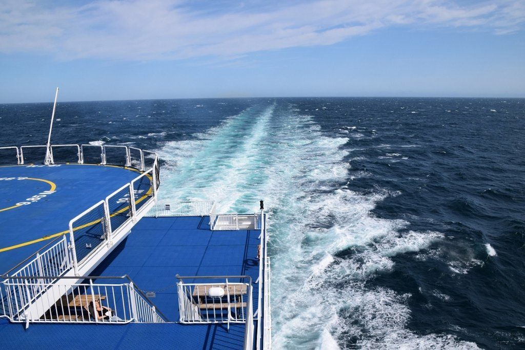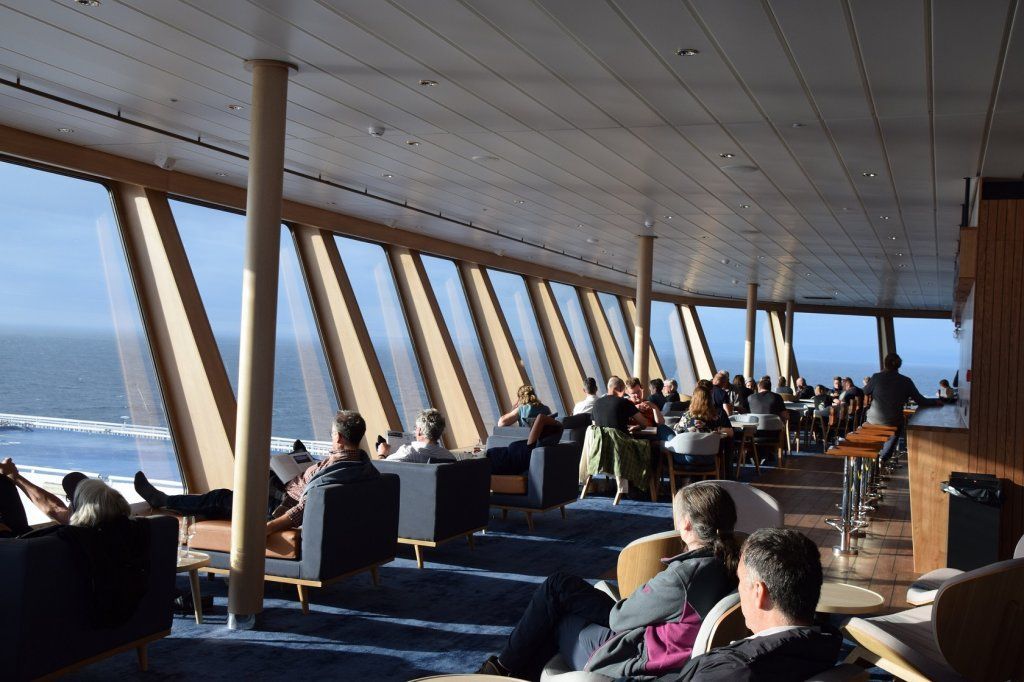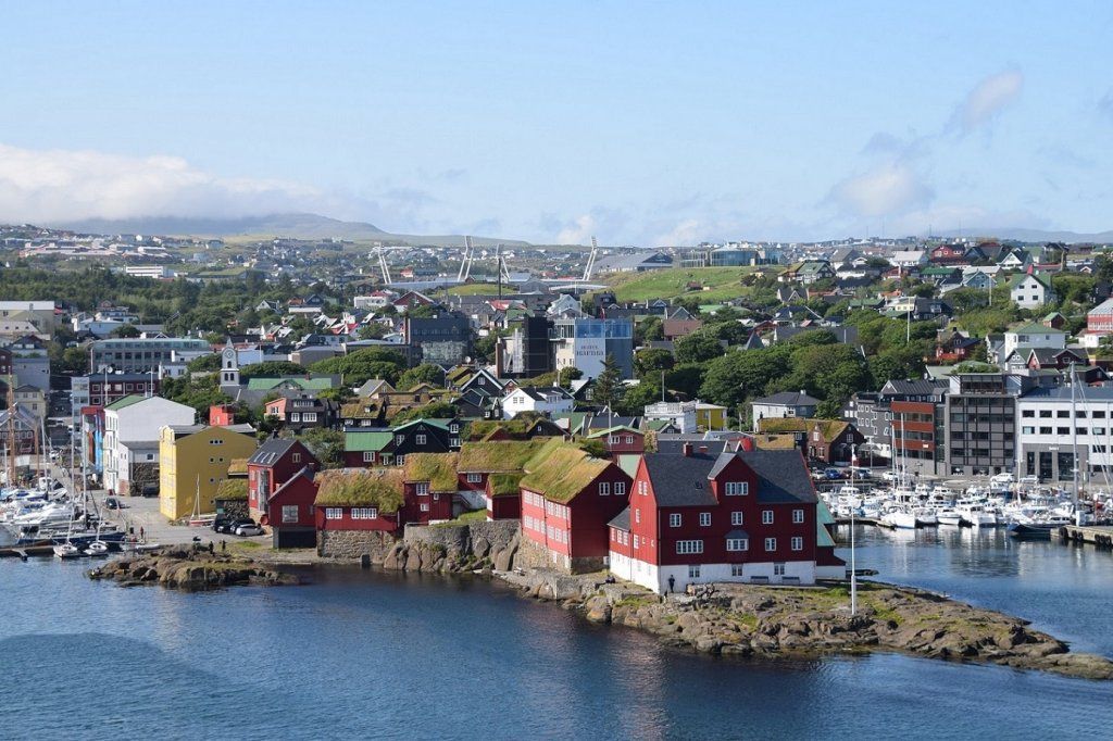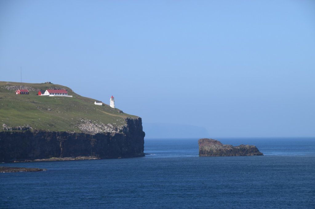 Im norddänischen Hirtshals können wir am Dienstag, 20. Juli nach geduldiger Wartezeit in den Bauch der riesigen Fähre Norröna fahren und für die zwei Nächte eine der rund 800 Kabinen beziehen. Zu unserer Freude liegt sie auf Deck 8 am Bug mit einem Fenster in Fahrtrichtung. Da sieht man hauptsächlich Wasser bis zum Horizont und im Norden ein paar Stunden lang die norwegische Küste im Dunst. Aufenthalte im Aussenbereich beschränken wir auf ein Minimum, der starke Nordwestwind, dem wir entgegenfahren, weht uns beinahe über Bord. Am Mittwochnachmittag lichtet sich der Nebel, sodass man die Färöerinseln aus dem Meer auftauchen sieht. Die Fähre legt an und nimmt nochmals eine grosse Menge Fahrzeuge und Menschen auf, darunter auch unsere Freunde Beatrice und Hans.