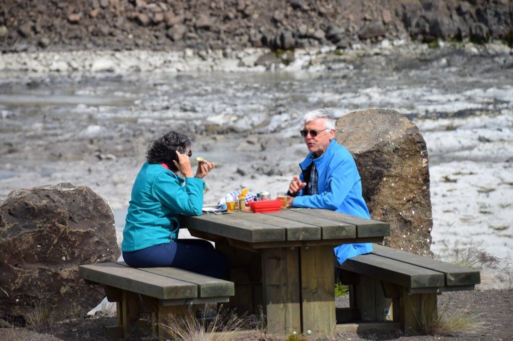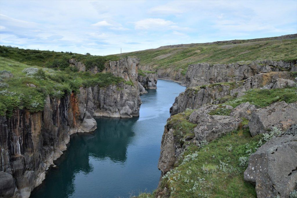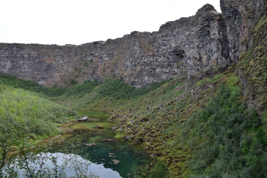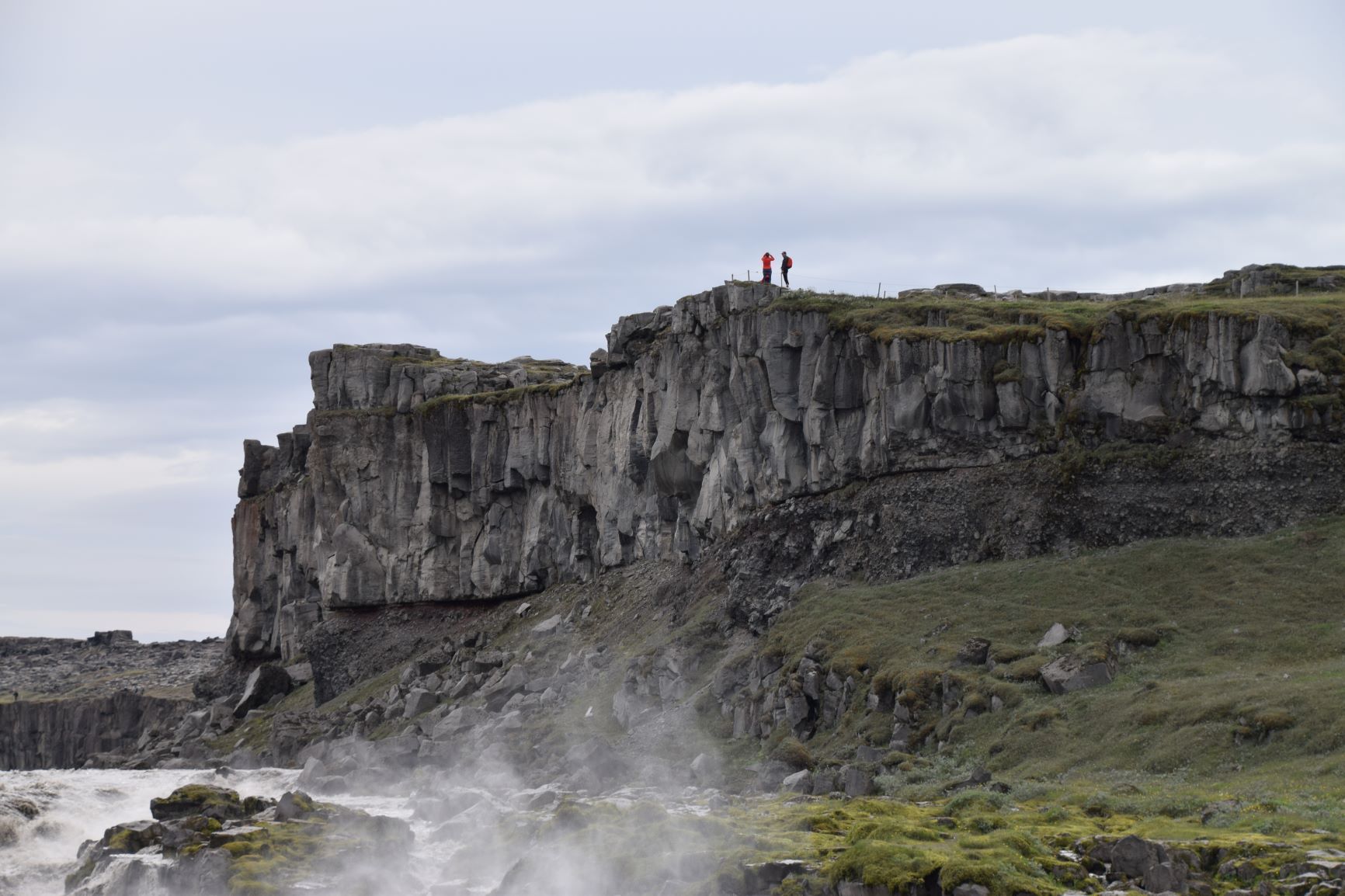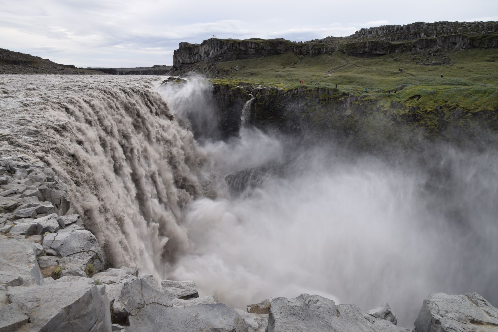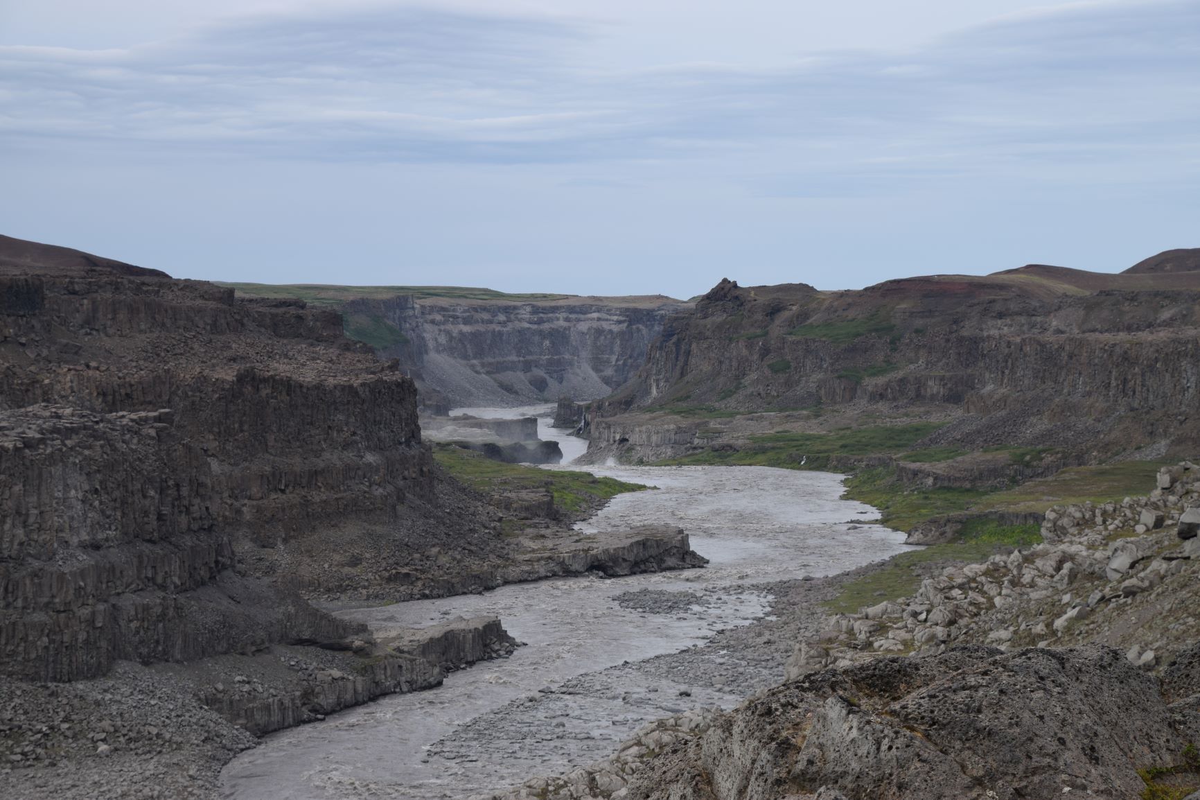 Heute besuchen wir den Jökülsargljufur-Nationalpark (wer sich den Namen nicht merken kann, sei entschuldigt!) Beeindruckend ist der 25 km lange und bis zu 120 m tiefe Canyon, der von mehreren Wasserfällen gespiesen wird. Der berühmteste ist der 100 m breite Dettifoss mit einer Fallhöhe von 44 Metern. Leider ist der Himmel bewölkt, die Sonne bringt es nicht fertig, die berühmten Regenbögen in die Sprühregenwolke zu malen.