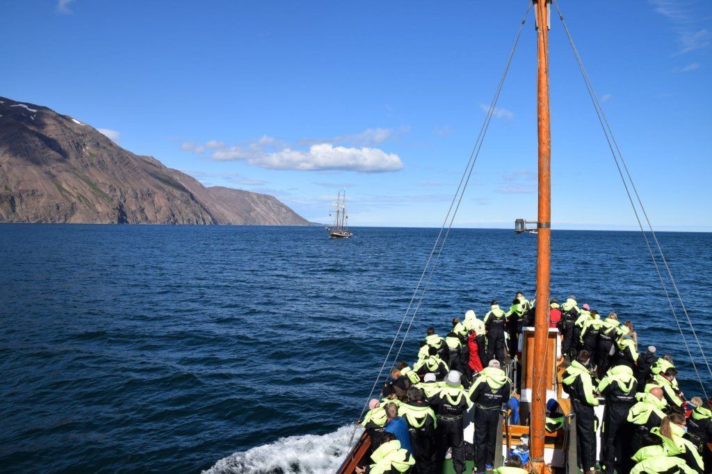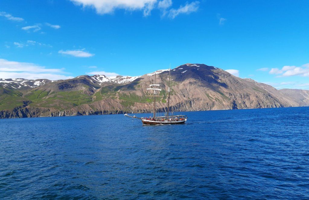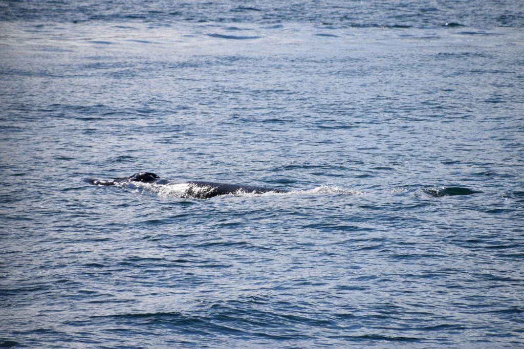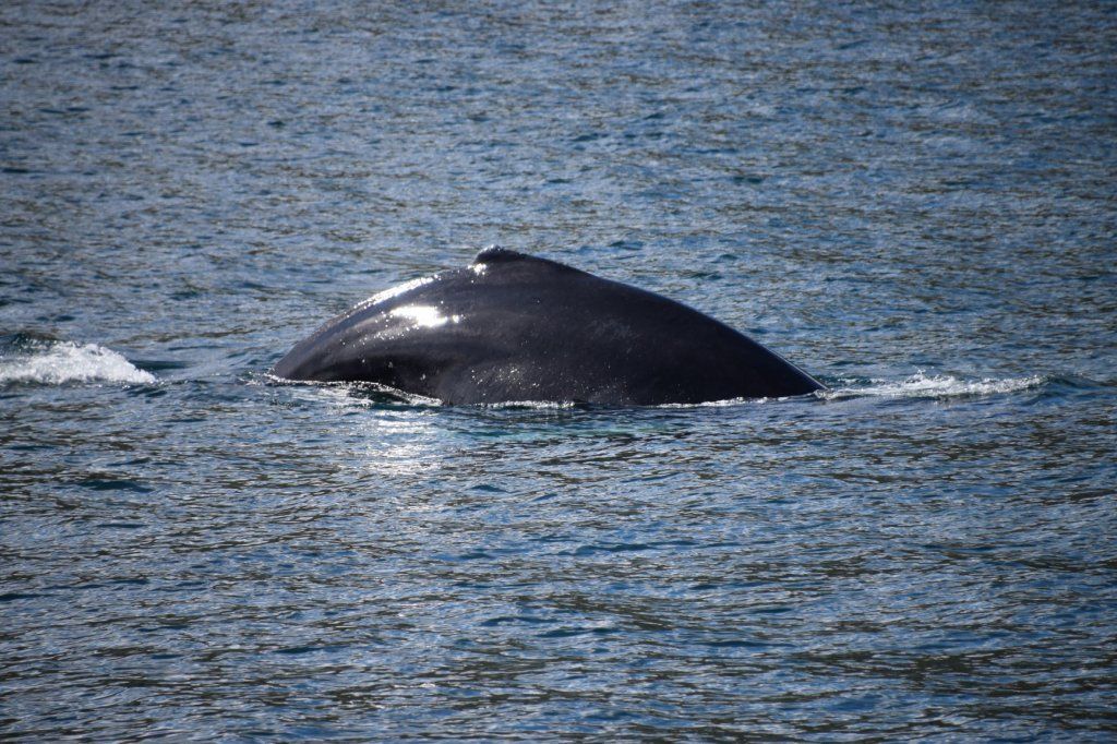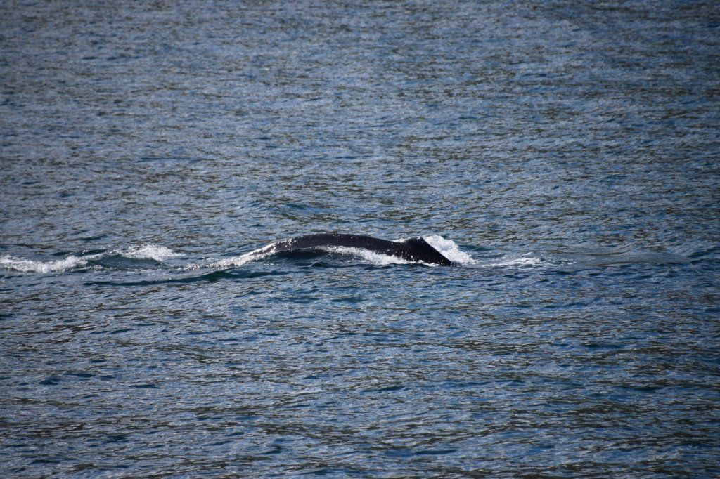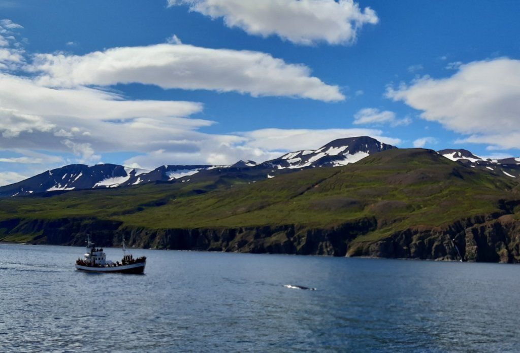 Strahlender Sonnenschein, gerade richtig für die Whale Watching Tour. Von 10 - 13 Uhr werden wir auf einem kleinen Holzschiff durch die Bucht von Husavik im Nordatlantik geschippert. Tatsächlich sichten wir ein paar springende Delphine und zwei Buckelwale, die uns hauptsächlich ihren Rücken zeigen. Ihr Paradestück, die Schwanzflosse, behalten sie konsequent unter Wasser.