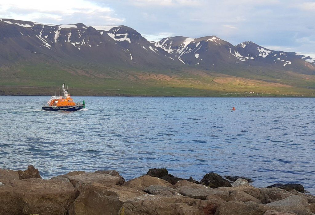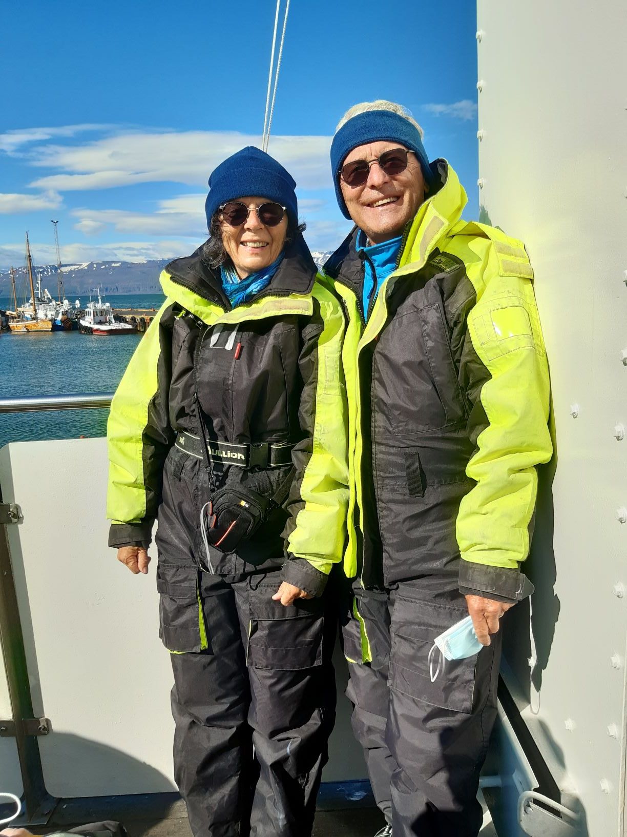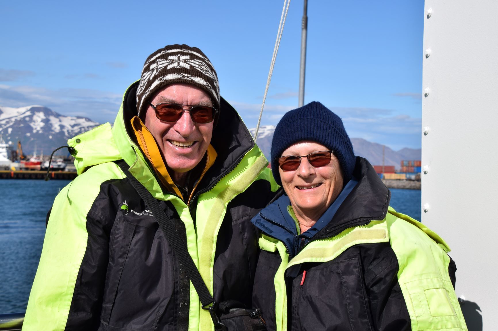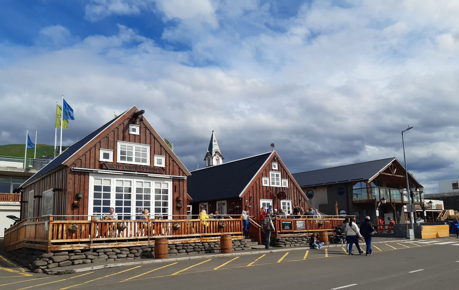 Strahlender Sonnenschein, gerade richtig für die Whale Watching Tour. Von 10 - 13 Uhr werden wir auf einem kleinen Holzschiff durch die Bucht von Husavik im Nordatlantik geschippert. Tatsächlich sichten wir ein paar springende Delphine und zwei Buckelwale, die uns hauptsächlich ihren Rücken zeigen. Ihr Paradestück, die Schwanzflosse, behalten sie konsequent unter Wasser.