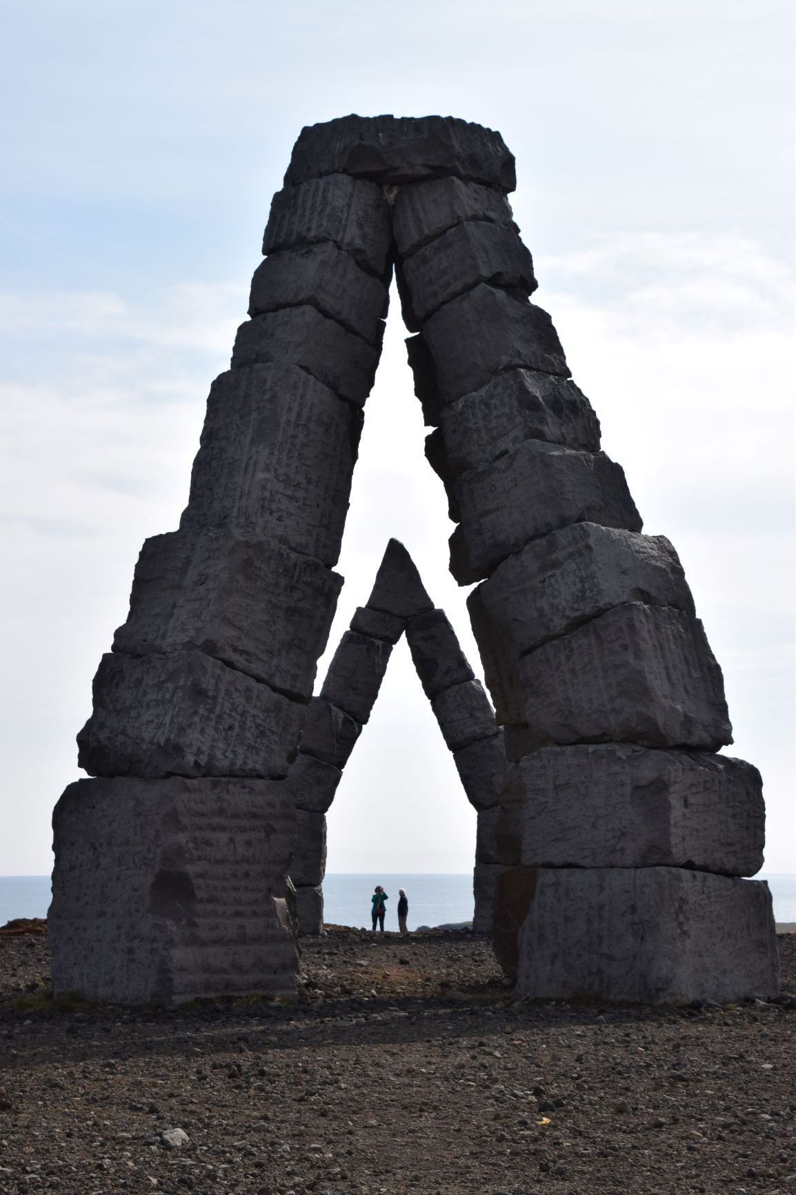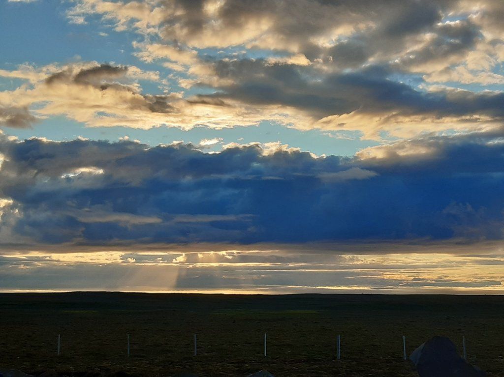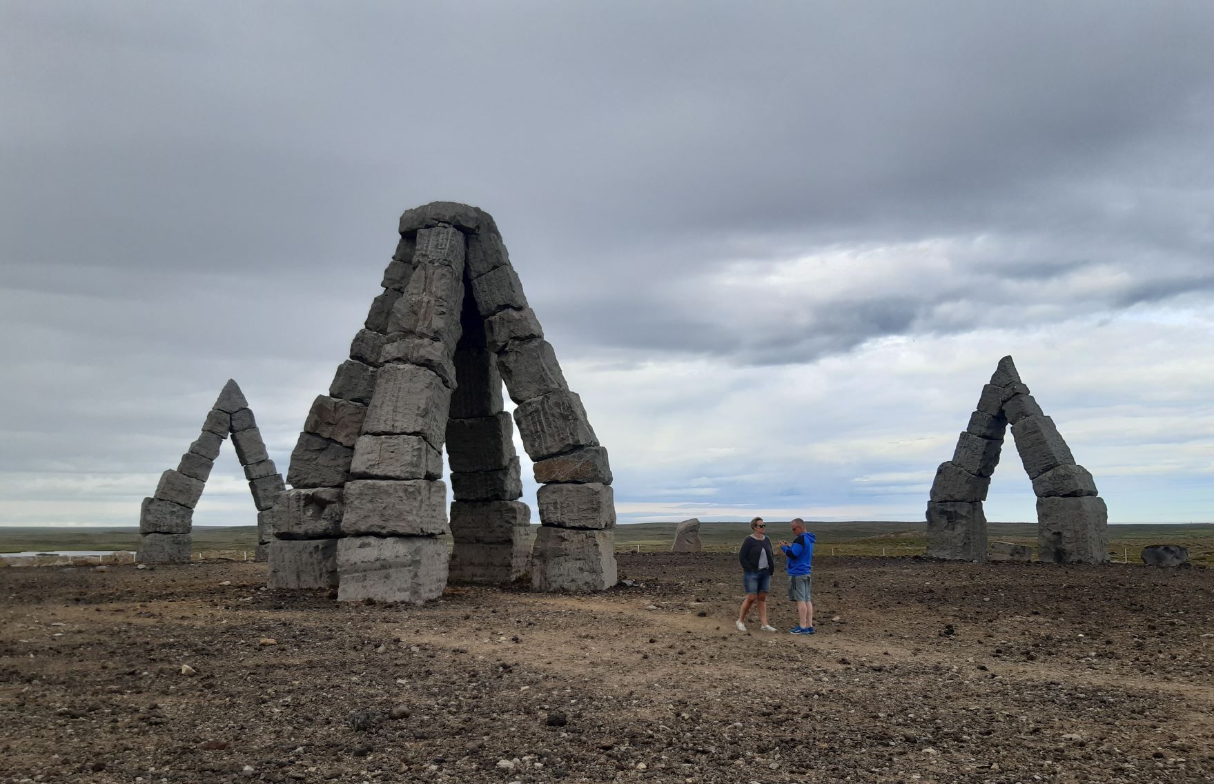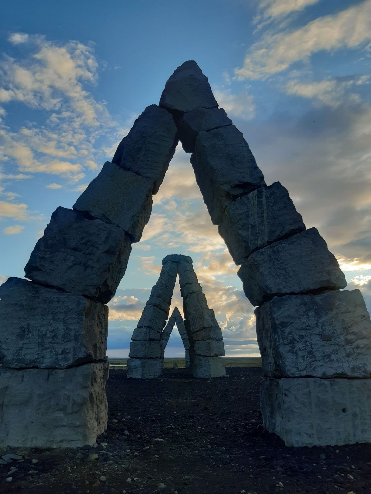Auf dem Parkplatz der Arctic Henge beginnt es heftig zu regnen, sodass wir die Steingebilde vorerst nur kurz betrachten und uns dann ins trockene Häuschen verziehen. Der Abend sieht wesentlich freundlicher aus, die Abendsonne zaubert eine schöne Stimmung an den Himmel. Ein zweiter Besuch bei den Steinbögen lohnt sich nun doppelt. Sie nennen sich Polarsonnenkreis, weil von diesem Hügel aus eine 360° Sicht auf den Horizont möglich ist. Zudem spielen Zwerge und Feen bei dieser noch im Bau befindlichen Konstruktion eine Rolle, die wohl nur für Isländer nachvollziehbar ist.