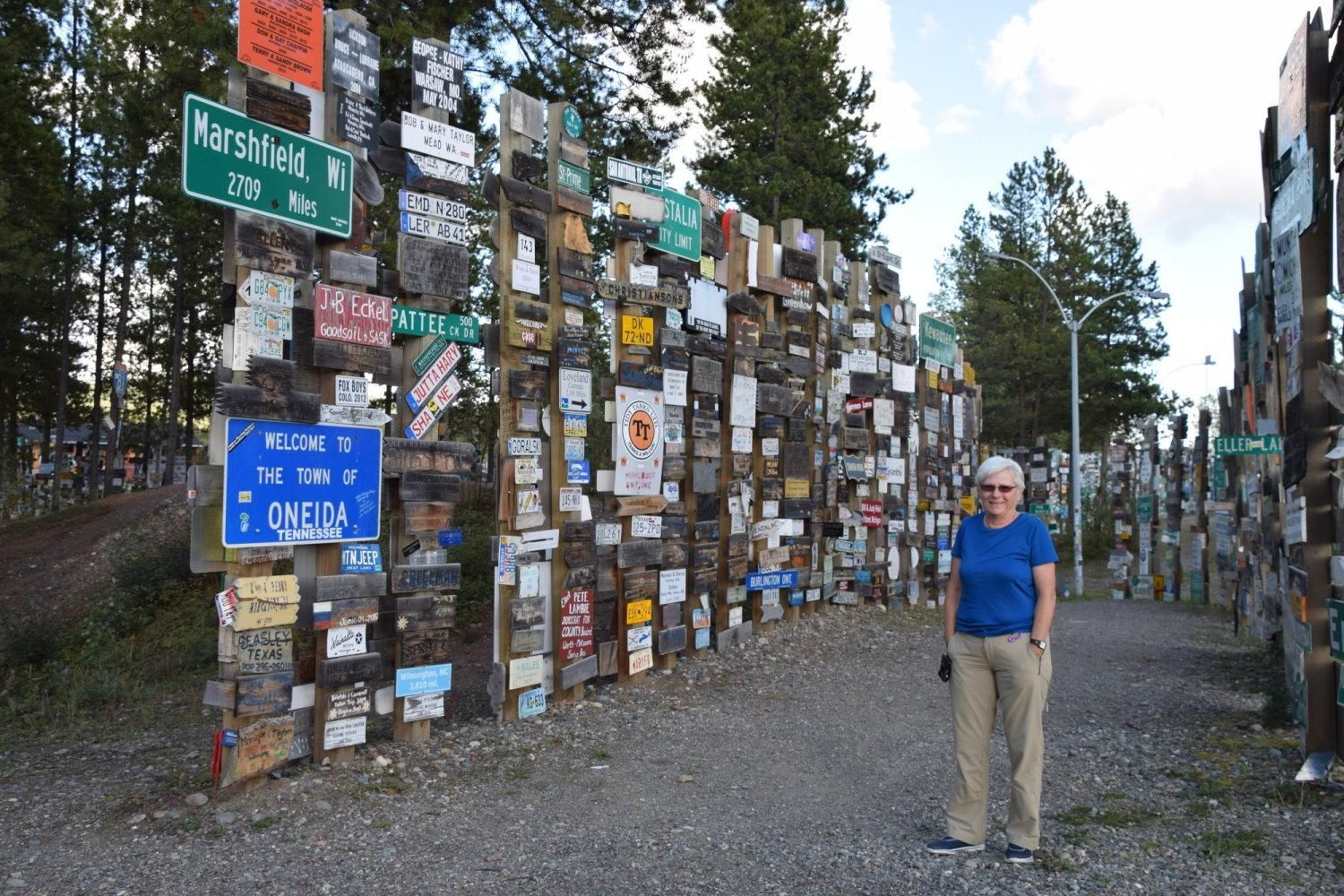 Kurz vor Watson Lake wechseln wir in die Provinz Yukon. Die Attraktion von Watson Lake ist der „Sign Post Forest“, ein Täfeliwald mit über 76‘000 Ortstafeln, Autonummern und anderen Schildern aus aller Welt. Den Anfang machte 1942 ein heimwehkranker amerikanischer Soldat, der am Bau des Alaska Highways mitwirkte. Er stellte die Tafel seiner Heimatstadt auf: Danville, Illinois, 2835 miles.