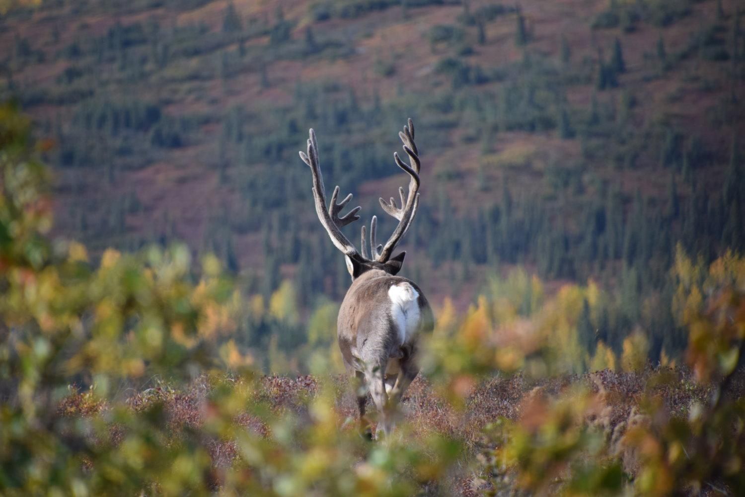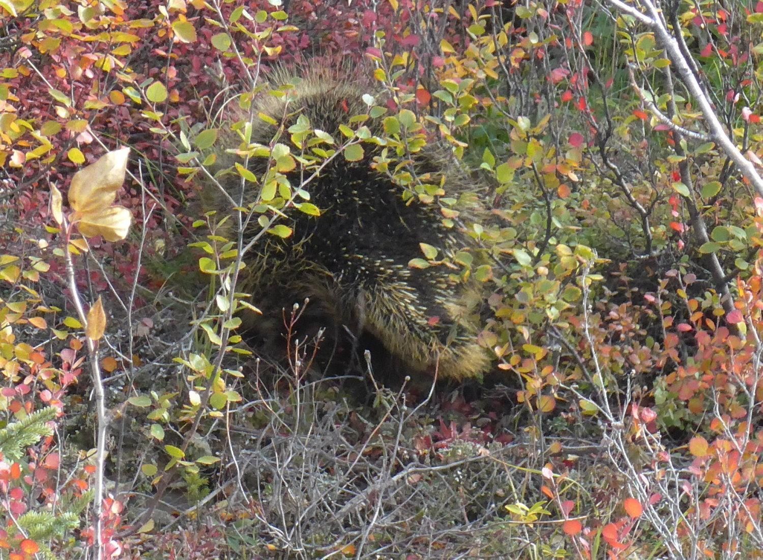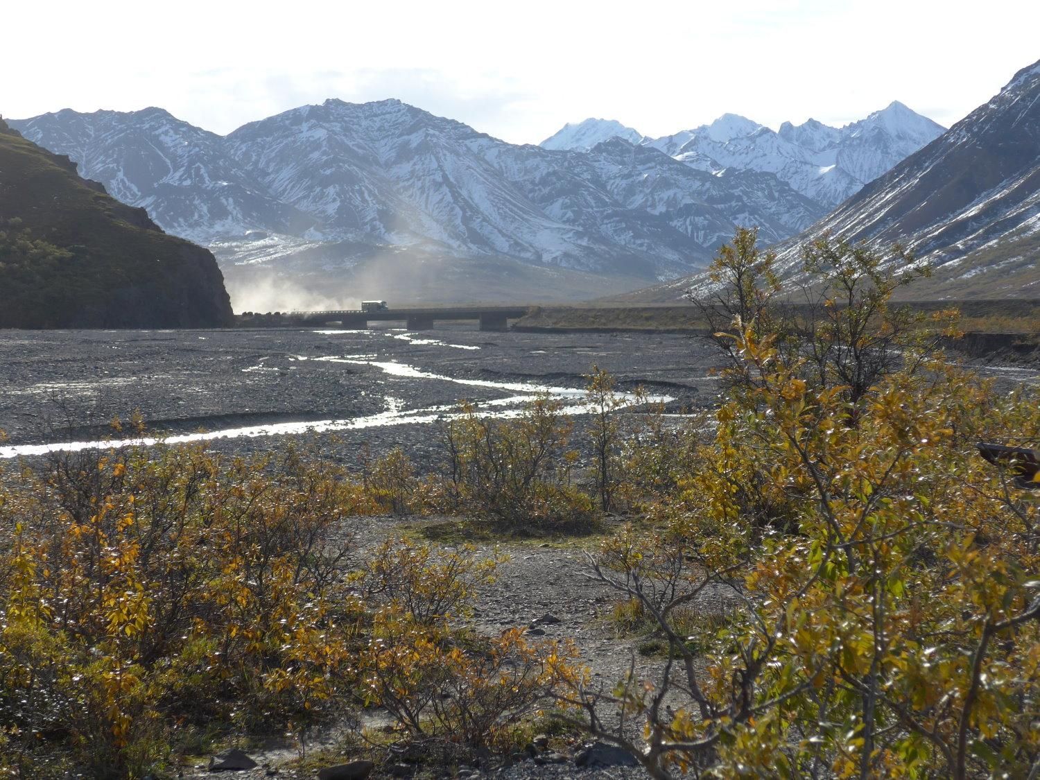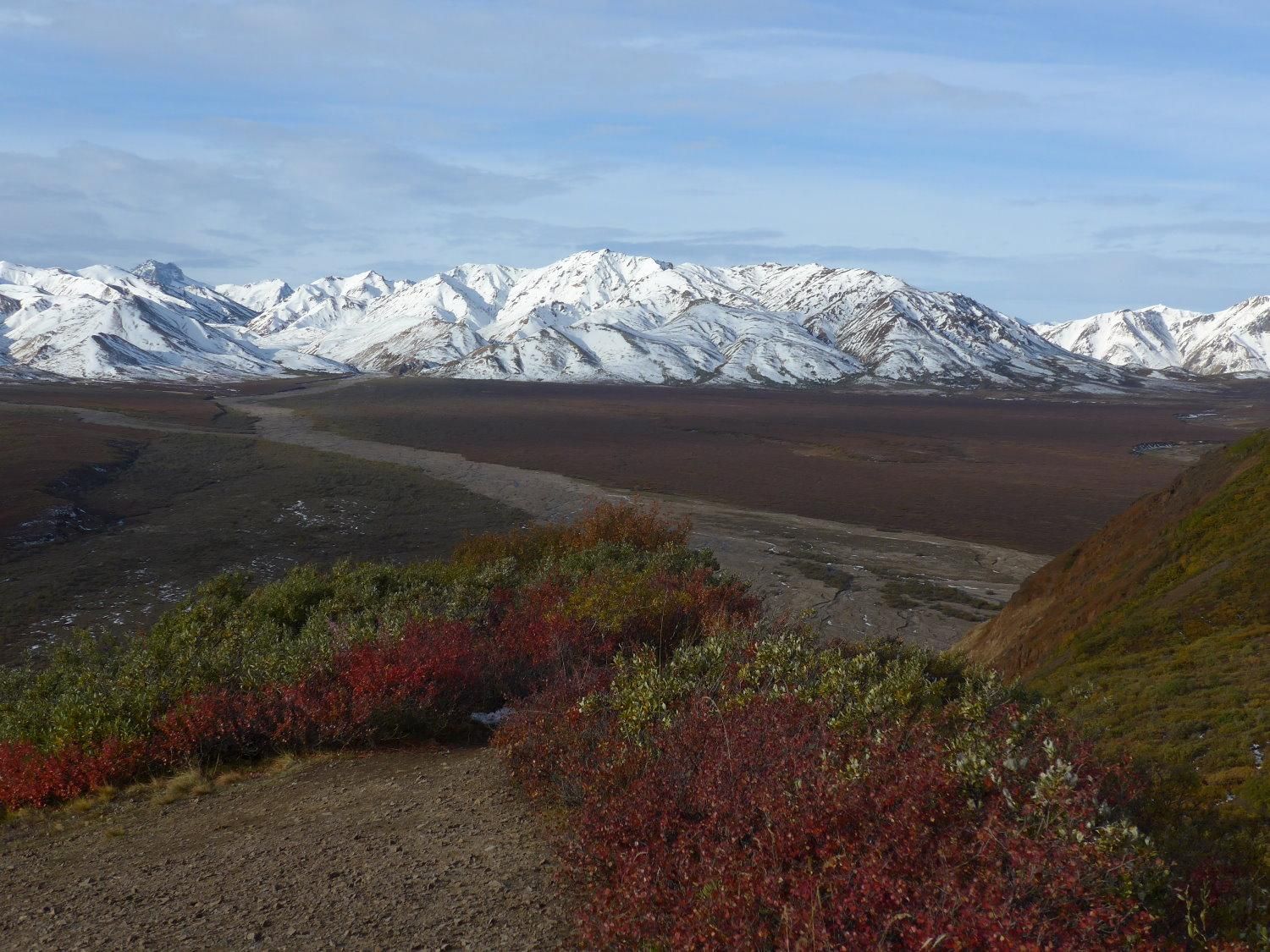 Schlaftrunken machen wir uns am nächsten Morgen auf den Weg und ergattern je einen Fensterplatz im alten Bus. Der Tag ist traumhaft, die alpine Parklandschaft ebenfalls, die Herbstfarben sowieso. Ab und zu hält der Bus und lässt die Passagiere aussteigen, fotografieren, die Beine vertreten. Und selbstverständlich wird angehalten, wenn es „etwas“ zu sehen gibt. Das tut es auch, nur leider meist ausserhalb vernünftiger Fotodistanz. Tier-Bilanz: 5 Elche, ein paar Karibus, 2 Grizzlybären, ein paar Dallsheep (Alaska Schneeschafe), 1 Adler, 2 Falken und diverse Kleintiere.