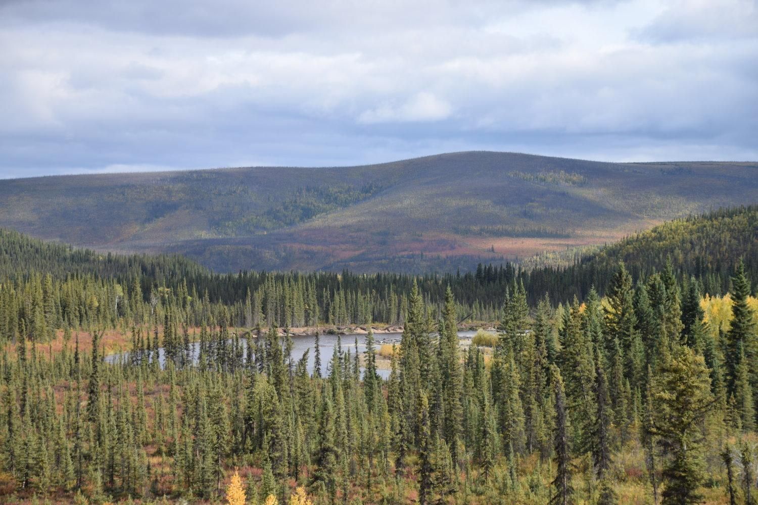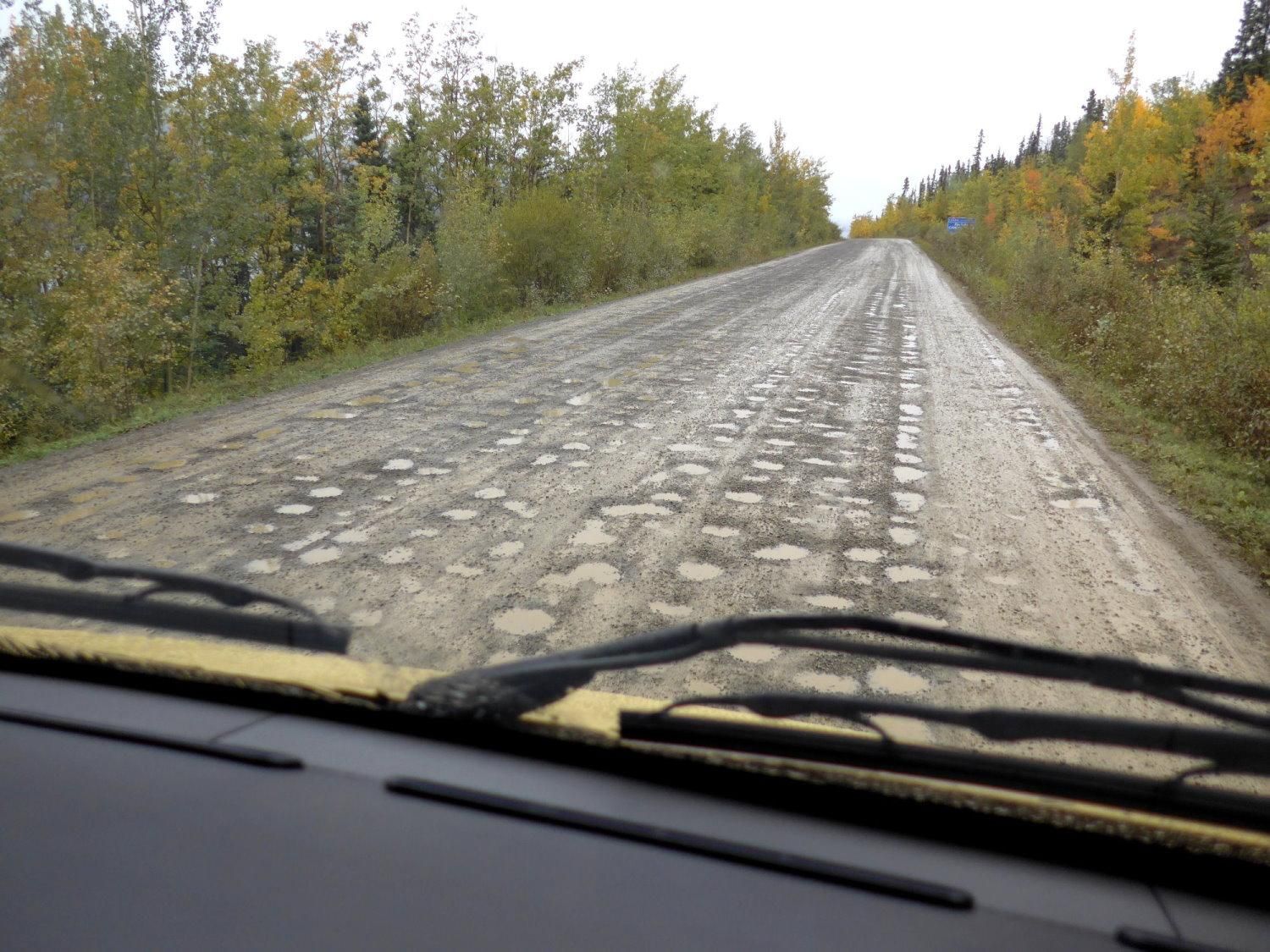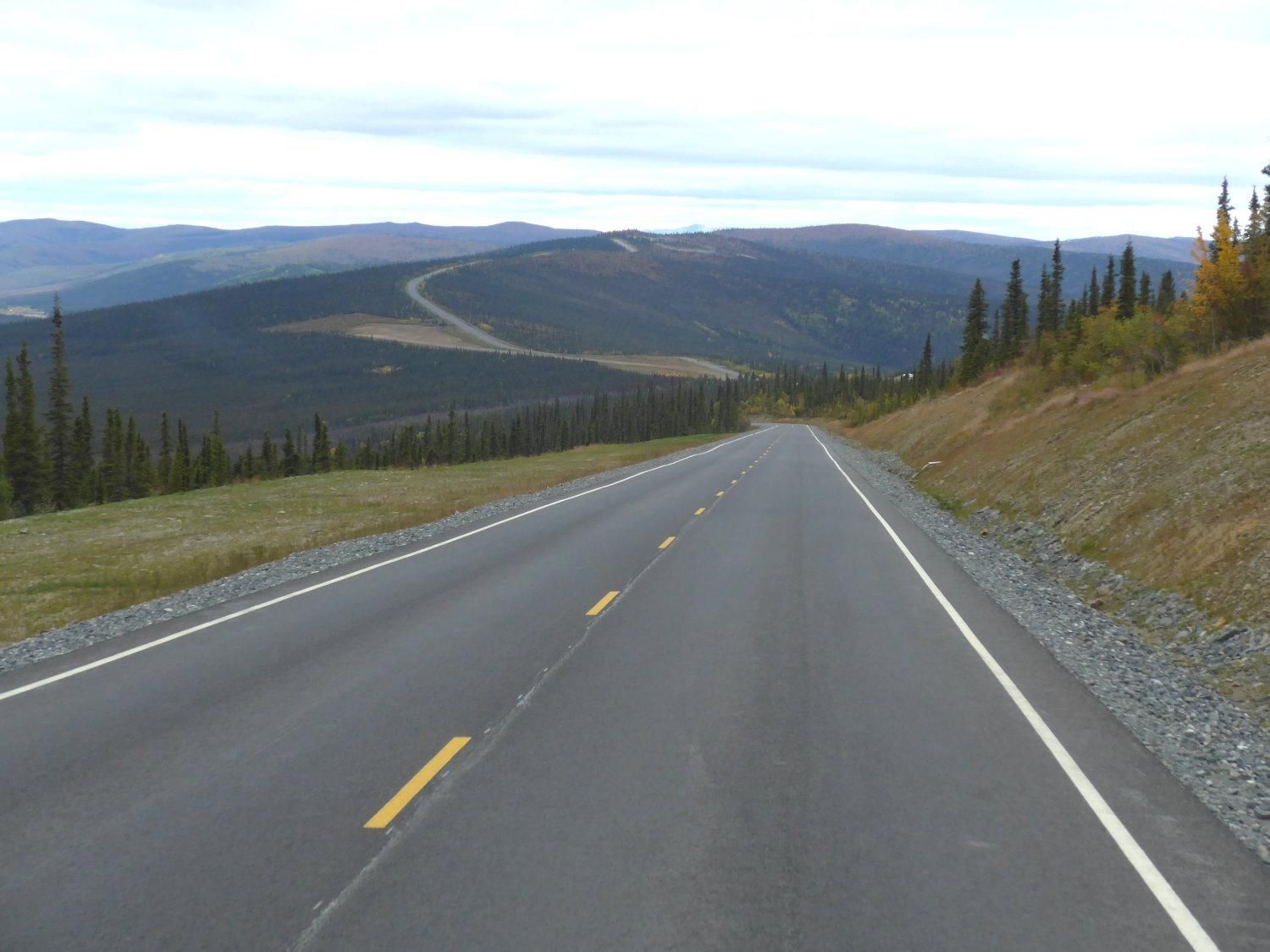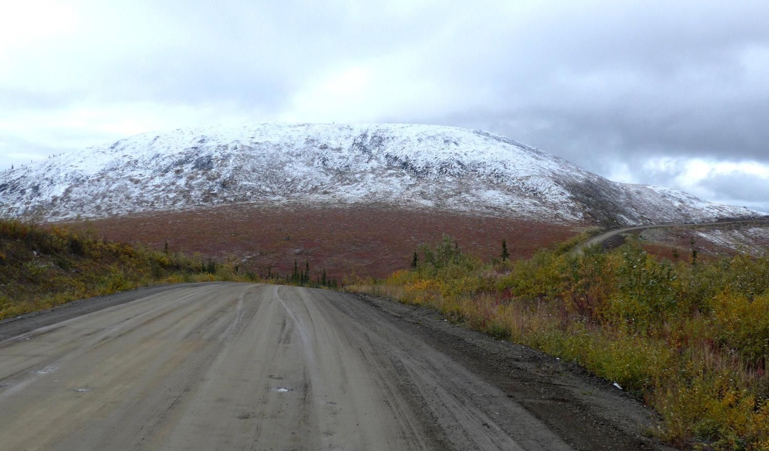 Was uns auf dem Top-of-the-World-Highway bis zur US-Grenze erwartet, ist schlichtweg atemberaubend. Die zeitweise etwas löchrige Naturstrasse schlängelt sich über weite Hügel mit traumhaften Aussichten, die Herbstfarben sind umwerfend. Nach jeder Kurve sieht alles wieder anders und noch schöner aus. Die Berggipfel sind weiss und wir kommen bis an die Schneegrenze, es weht ein eiskalter Wind. Immer wieder piepst unsere Glatteiswarnung am Armaturenbrett. Aber so schlimm ist‘s dann doch nicht.