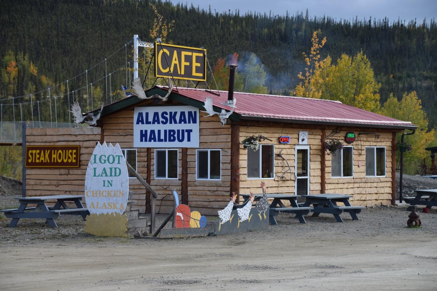 Nun kommen wir am kuriosen Ort Chicken vorbei. Die ersten Bewohner der kleinen Siedlung waren Goldgräber. Weil es so viele Schneehühner in der Gegend gab, wollten sie den Ort nach ihnen benennen. Aber: Die Hühner heissen auf Englisch Ptarmigan und das war den Männern zu kompliziert. So einigte man sich auf den einfachen Namen Chicken. Heute wird der Ort im Sommer von 25 Personen bewohnt, wovon 3 auch im Winter hier bleiben. Es gibt eine Tankstelle, einen Souvenirladen, ein Beizli, einen Campingplatz und ein paar Hüttchen, die man zum Übernachten mieten kann. Und natürlich kann man immer noch sein Glück mit Goldwaschen versuchen. Wir trinken einen Latte Macchiato und stellen fest, dass das der beste Kaffee ist, den wir in den vergangenen sechs Wochen in Nordamerika aufgetischt bekamen.
