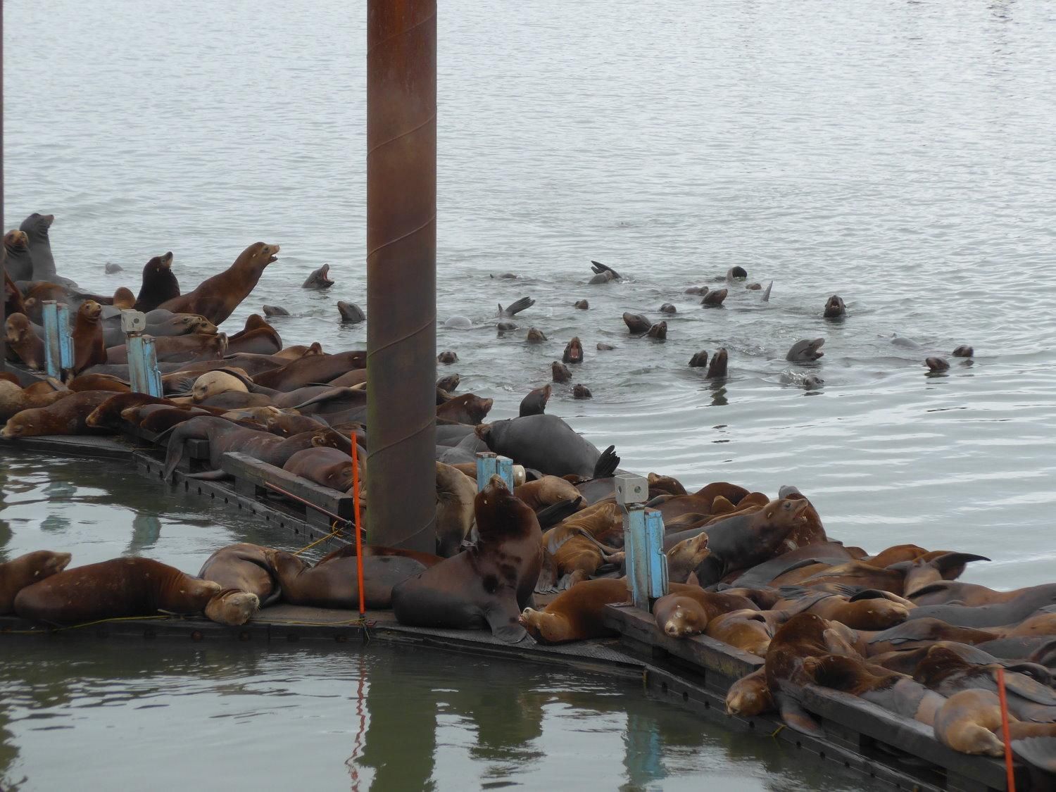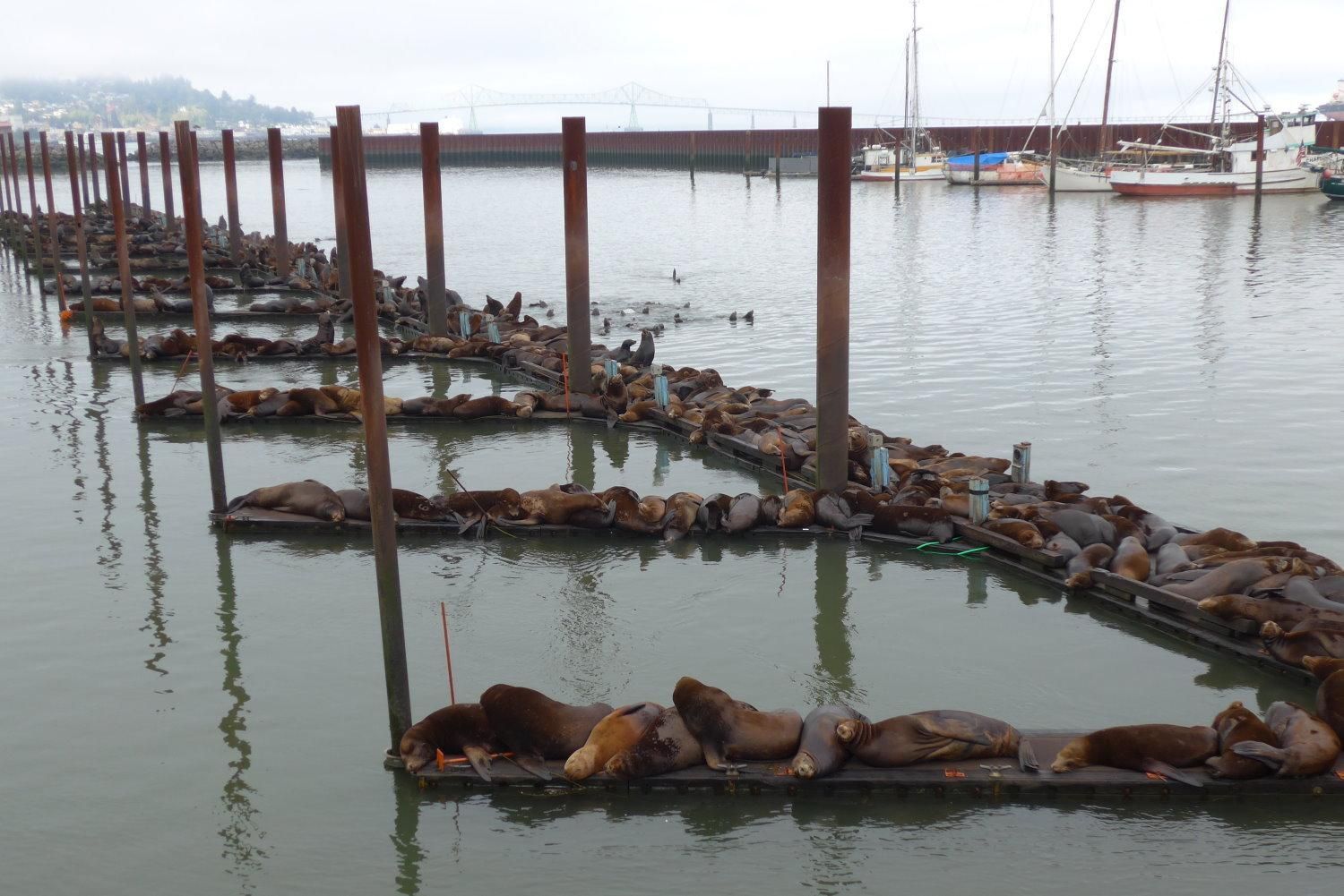 Vor Astoria treten wir in den Bundesstaat Oregon ein und passieren eine imposante 6,5 km lange Brücke über den Columbia River. Wir übernachten in der Stadt und wundern uns über einen konstanten Lärm, der wie ein ständiges Geschimpfe tönt. Am Kai hat sich eine grosse Seelöwenkolonie etabliert. Es sind so viele Tiere, dass sie fast keinen Platz auf den Stegen haben. Und da wird dauernd gebrüllt und gestritten, Tag und Nacht, das ganze Jahr hindurch. Wir finden es lustig, haben aber eine unruhige Nacht wegen des Klamauks und fragen uns, wie die Ortsansässigen wohl damit umgehen.