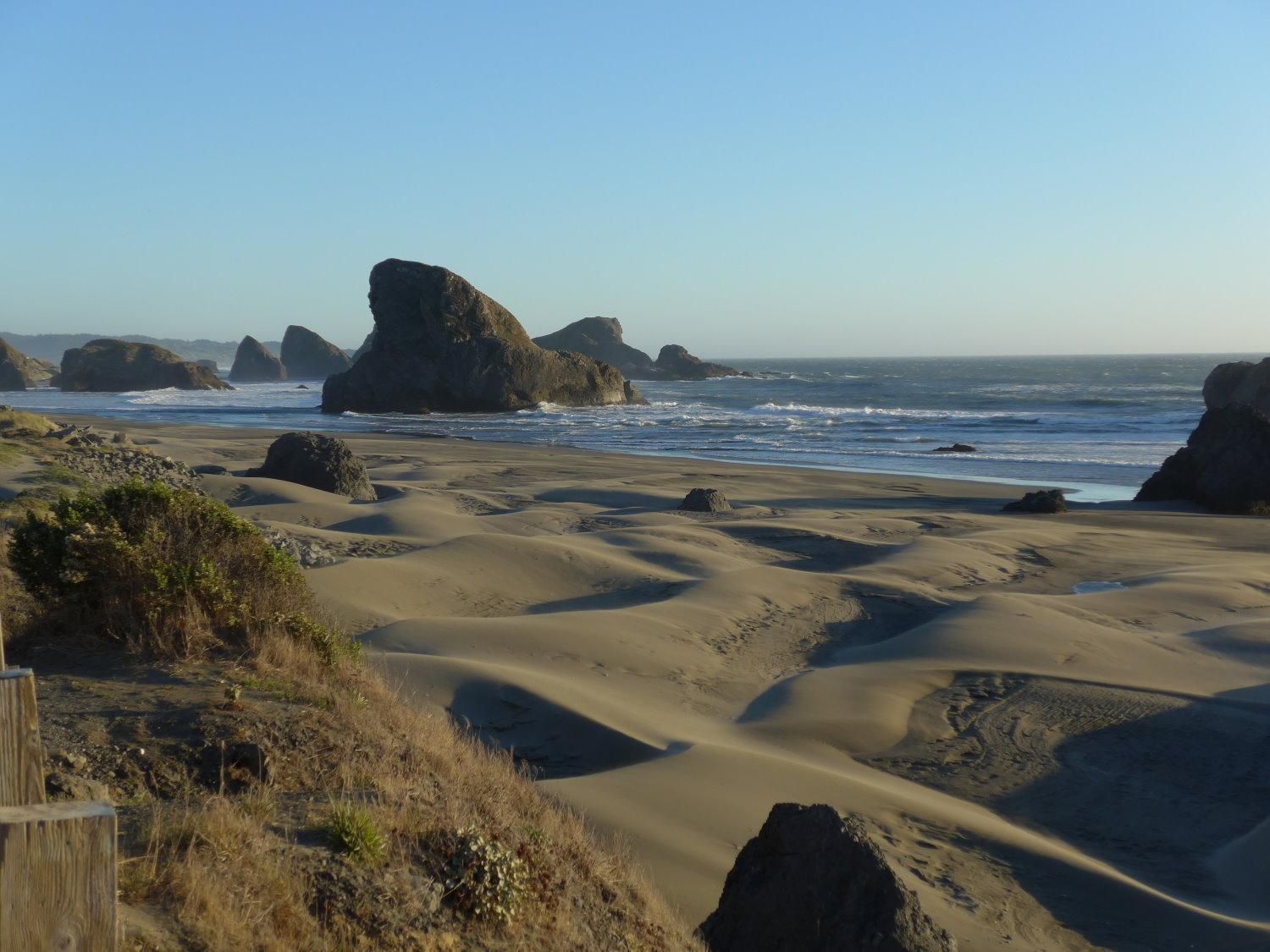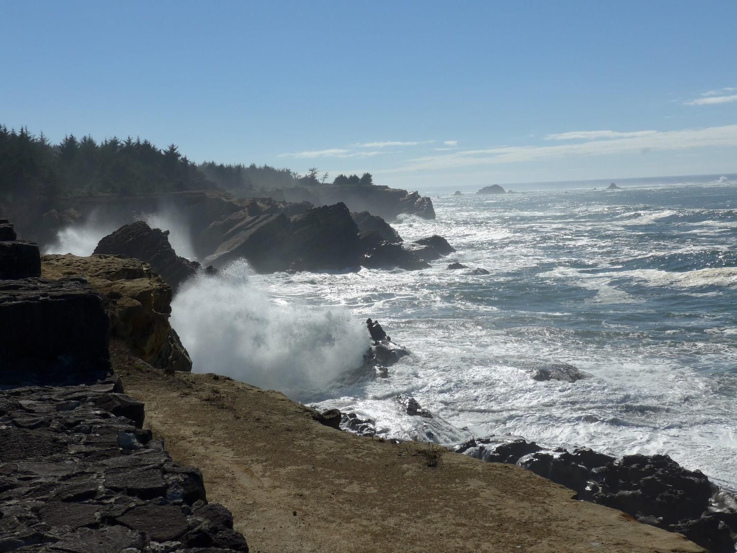 Südlich von Florence (nicht dem italienischen) beginnt eine langgezogene, faszinierende Dünenlandschaft, die Oregon Dunes. Später sehen wir von einem Park aus auf steile Klippen hinab, die von wilden, schäumenden Wellen umspült werden. Die ganze Reise bis zur kalifornischen Grenze ist ein einziges, fantastisches Schauspiel.