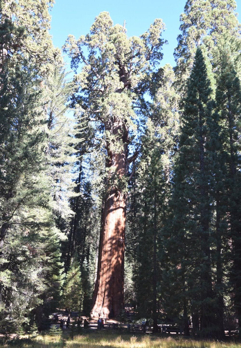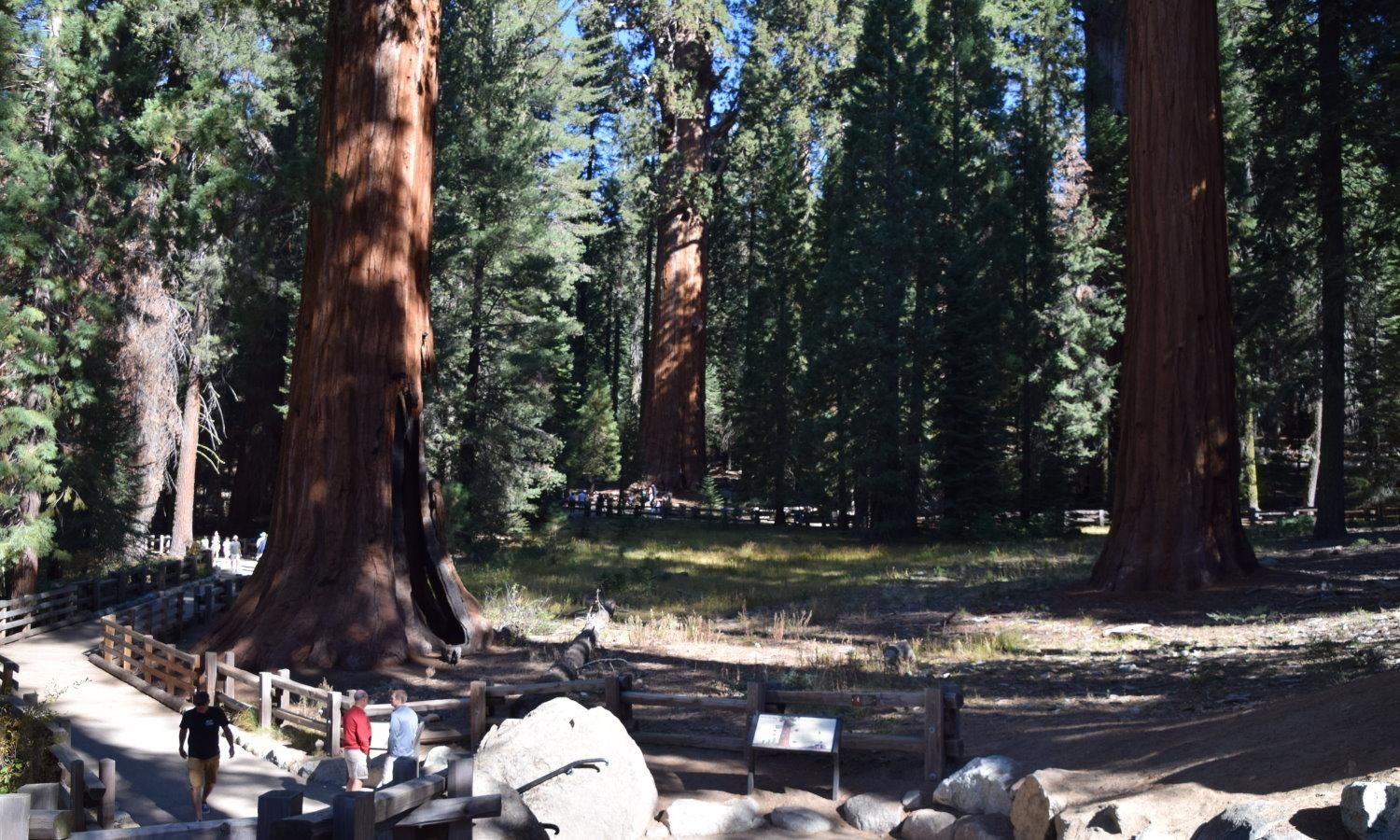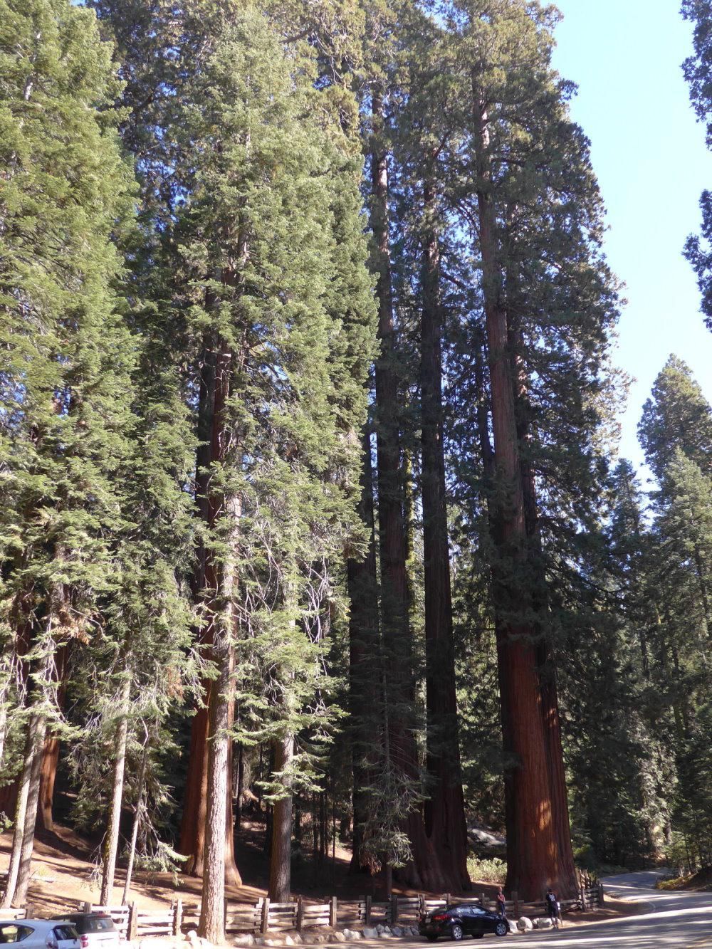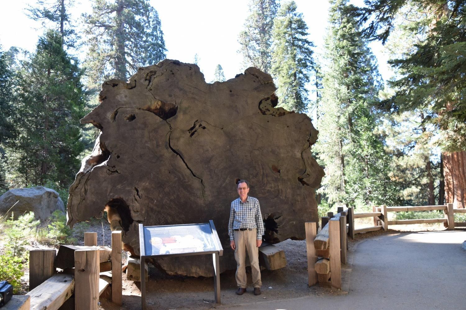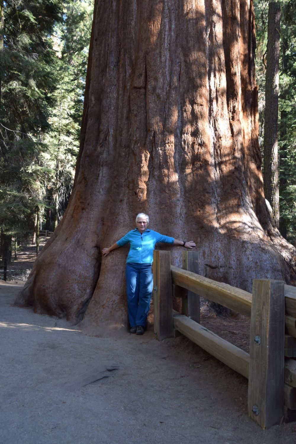 Nach einer wunderbar kühlen Nacht statten wir als Erstes dem General Sherman einen Besuch ab. Diesen noblen Namen trägt der grösste Baum der Welt, was sich auf die Gesamtmasse Holz bezieht. Wir sind uns ja von den Küsten-Redwoods einiges gewöhnt, aber diese Bäume hier hauen einen fast um. Es gibt natürlich nicht nur den Mr. Sherman, er ist einfach der grösste unter den Monstern. Sein Alter wird auf 2100 - 2300 Jahre geschätzt, sein Durchmesser auf Brusthöhe 8,25m, die Höhe 90m. Die Stämme dieser Sequoias sind fast zylindrisch, das heisst auf der ganzen Länge ungewöhnlich dick. Der Westhang der Sierra Nevada auf einer Höhe zwischen 1500-2100m ist der einzige Ort der Welt, wo solche Bäume wachsen. Interessanterweise sind sie resistent gegen Krankheiten, Schädlinge und vor allem gegen Feuer. Viele Bäume weisen schwere Brandspuren auf, die ihrem Leben nichts anhaben konnten. Hingegen ist das Wurzelsystem der Riesen-Mammutbäume flach. Feuchter Boden, Wurzelschäden und starke Winde können einen Baum zum Umkippen bringen. Das Foto mit Heinz zeigt den Querschnitt eines ca. 2‘210 Jahres alten Baumes, bei dem mindestens 80 Feuer Narben hinterlassen haben.