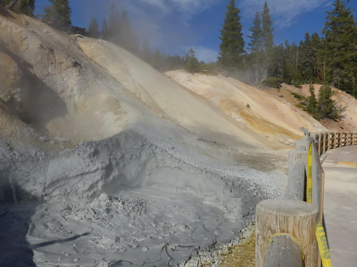 Ab Redding peilen wir den Lassen Volcanic Nationalpark in der Sierra Nevada an. Eine Bergstrasse schlängelt sich durch den schönen Park, der höchste Pass liegt auf 2,500m. Selbst hier oben ist es immer noch warm, und das anfangs Oktober! Es gibt verschiedene prächtige Aussichtspunkte und es fehlen auch nicht die dampfenden, brodelnden und nach Schwefel riechenden Blubberfelder. Der Park ist so etwas wie der kleine Bruder vom Yellowstone, den wir vor 40 Jahren besucht hatten. Der Lassen Peak, 3‘187m hoch, hat ein wenig Schnee und sieht nicht wie ein klassischer Vulkan aus, sondern wie ein normaler Dreitausender. Nach einem schönen Abendfährtchen westwärts kommen wir zum Campingplatz in Susanville.
