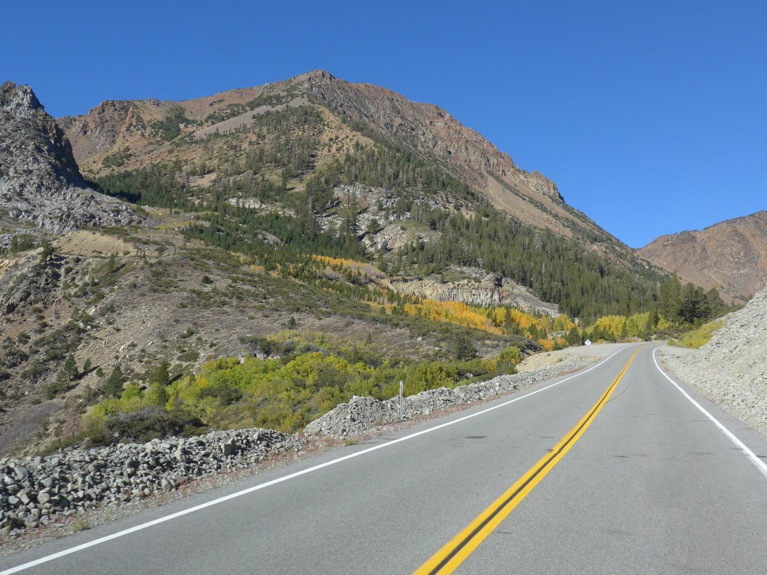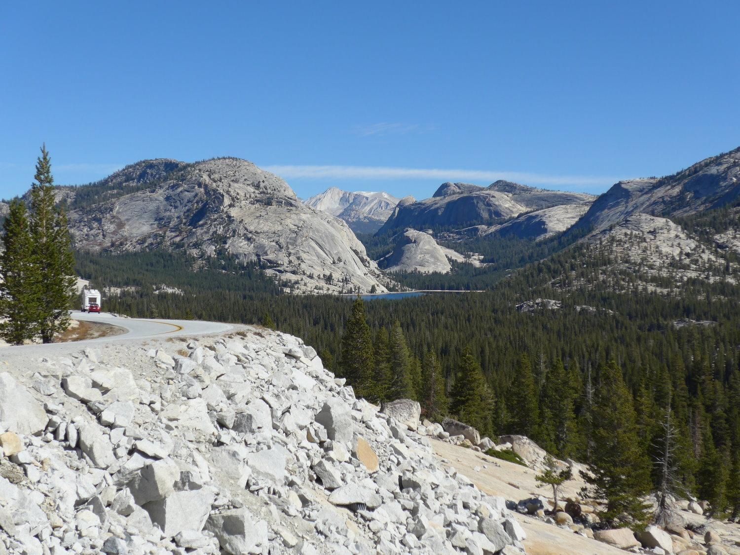 Wieder geht’s in die Berge der Sierra Nevada, diesmal von der Ostseite her. Die Strasse Nr. 120 windet sich durch den Yosemite Nationalpark hinauf zum höchsten Punkt, dem 3‘000m hohen Tioga-Pass. Die erhoffte Abkühlung tritt nur ansatzweise ein, es herrschen auch auf dieser Höhe sommerliche 25°C! Ebenfalls erstaunt die Waldgrenze, der Tannenwald erstreckt sich bis über 3000m hinauf.
