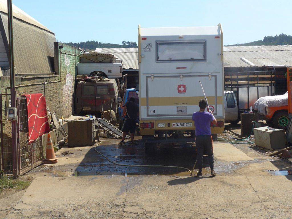 Nun sind wir gezwungen, die liebliche Seen- und Waldregion zu verlassen und nach Temuco zu fahren, weil wir dort eine Iveco-Servicestelle aufsuchen müssen. Von den 30°C würden wir gerne 10 in die eisige Schweiz schicken. Erhitzt suchen wir die Firma mit der Adresse Panamericana Sur Km 4. Unser Navi hat kein Verständnis für solche Adressen und wo genau ist denn Km 4? So fragen wir uns durch, bis wir das Ziel gefunden haben.