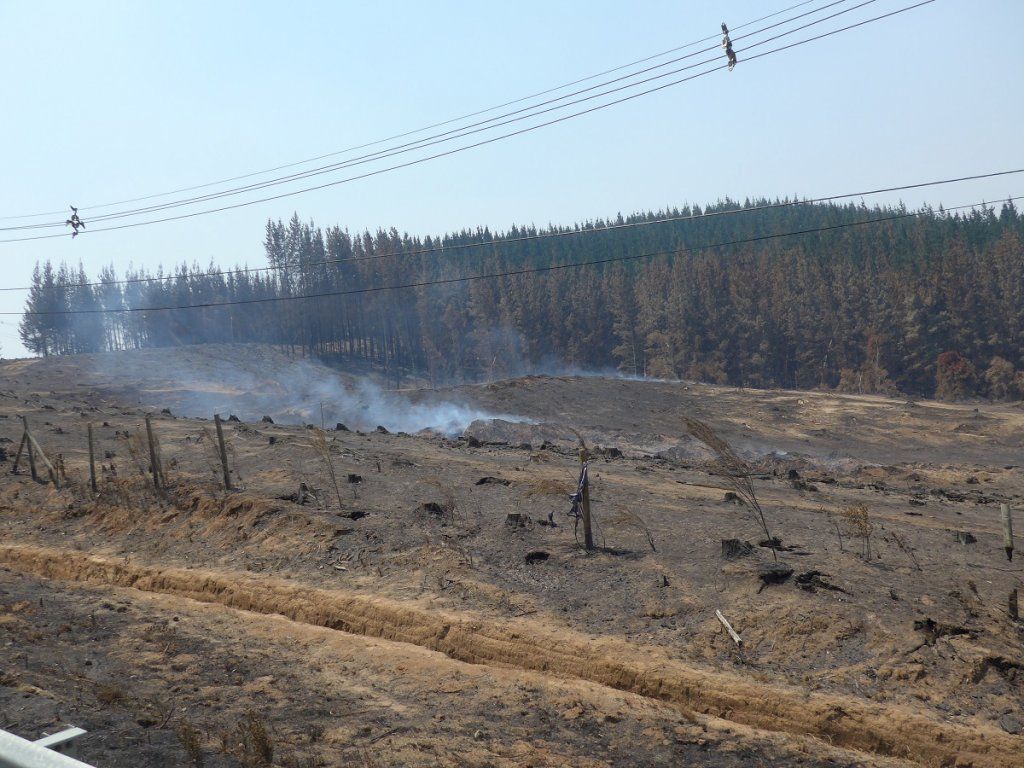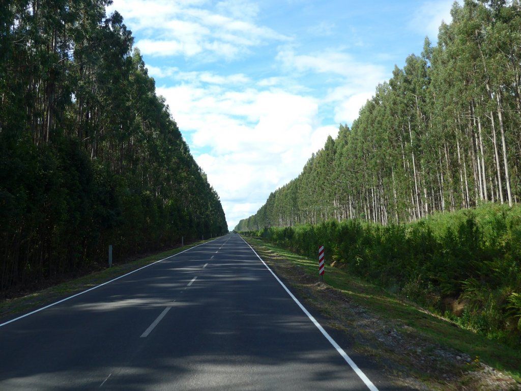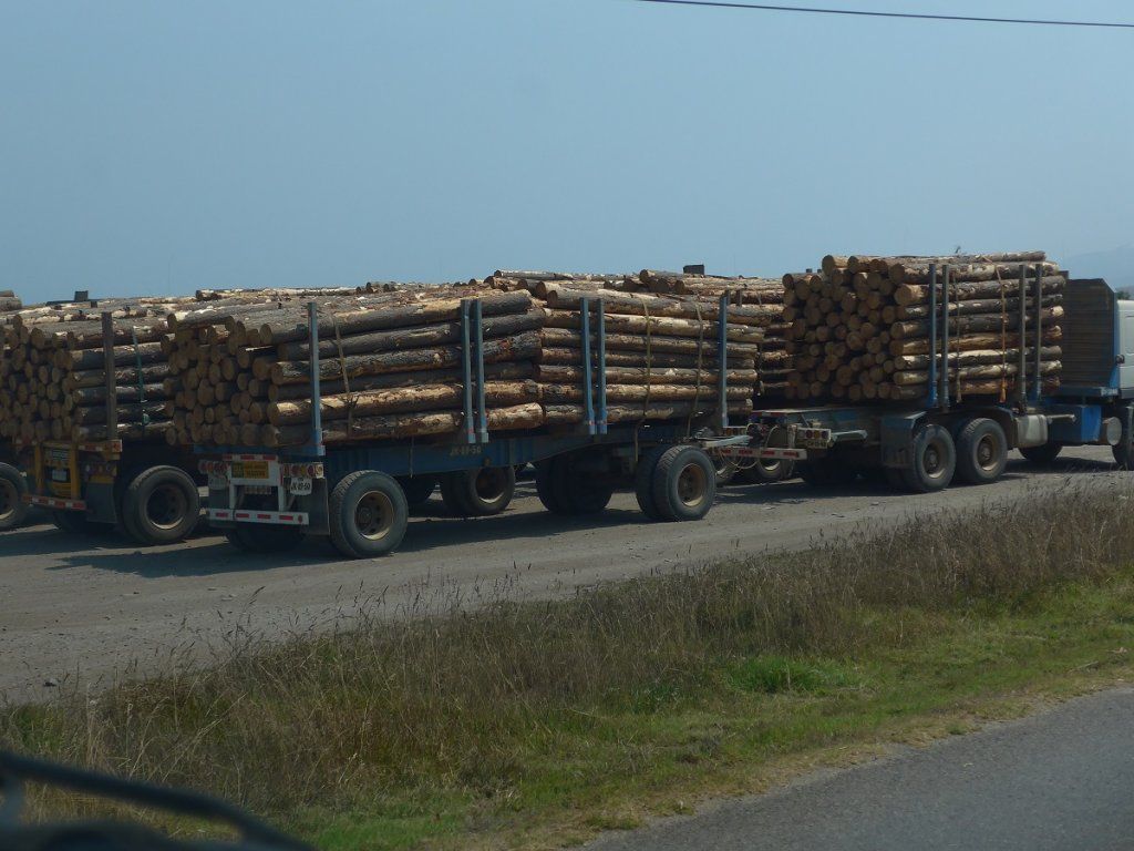 Fluchtartig verlassen wir die Stadt und ziehen weiter nordwärts der Küste nach. Die Route führt an endlosen Kiefernplantagen in jedem Grössenstadium vorbei. Grosse Sägewerke werden im Viertelstundentakt mit holzbeladenen Lastwagen beliefert, Zellulosefabriken qualmen vor sich hin. Jahr für Jahr wüten Waldbrände und richten enorme Schäden an. Wir kommen kilometerlang an vernichteten Wäldern vorbei und sehen auch da und dort noch Rauch aufsteigen.
