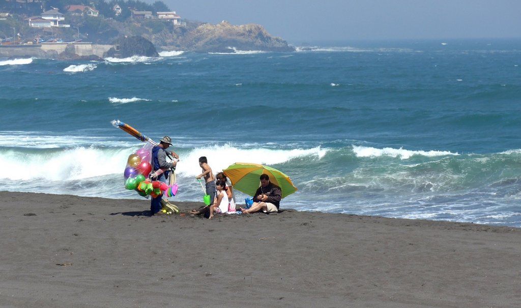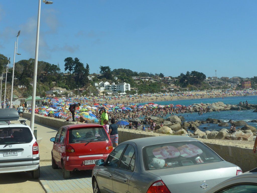 Während wir ein Glacé lutschen, beschliessen wir, so schnell wie möglich wieder an die Küste zu fahren. Nur hat natürlich ganz Santiago am heutigen Sonntag dasselbe beschlossen. Komplett überfüllte Strände und ebensolche Strassen erwarten uns. Heinz kämpft sich der schmalen Küstenstrasse entlang, an rechts parkierten Autos vorbei und gleichzeitig entgegenkommenden Fahrzeugen ausweichend. Es ist furchtbar. Selbstverständlich gibt es keinen freien Parkplatz, und wenn es einen gäbe, würden wir ihn nicht nehmen. Wir sind nur noch auf der Flucht!