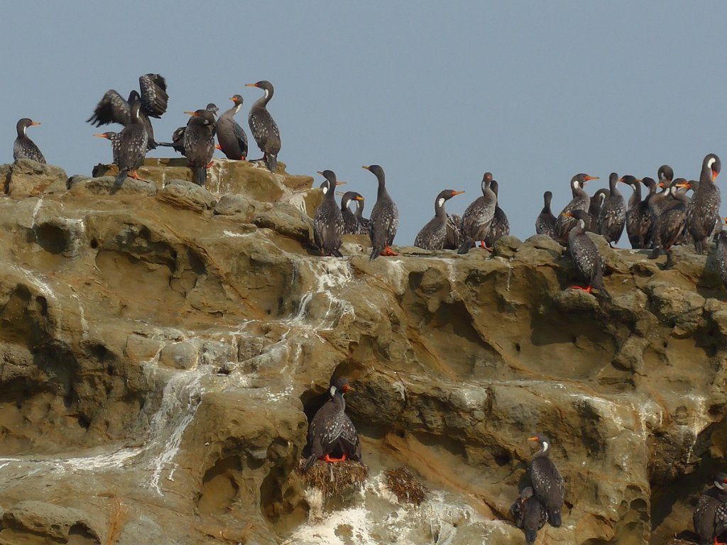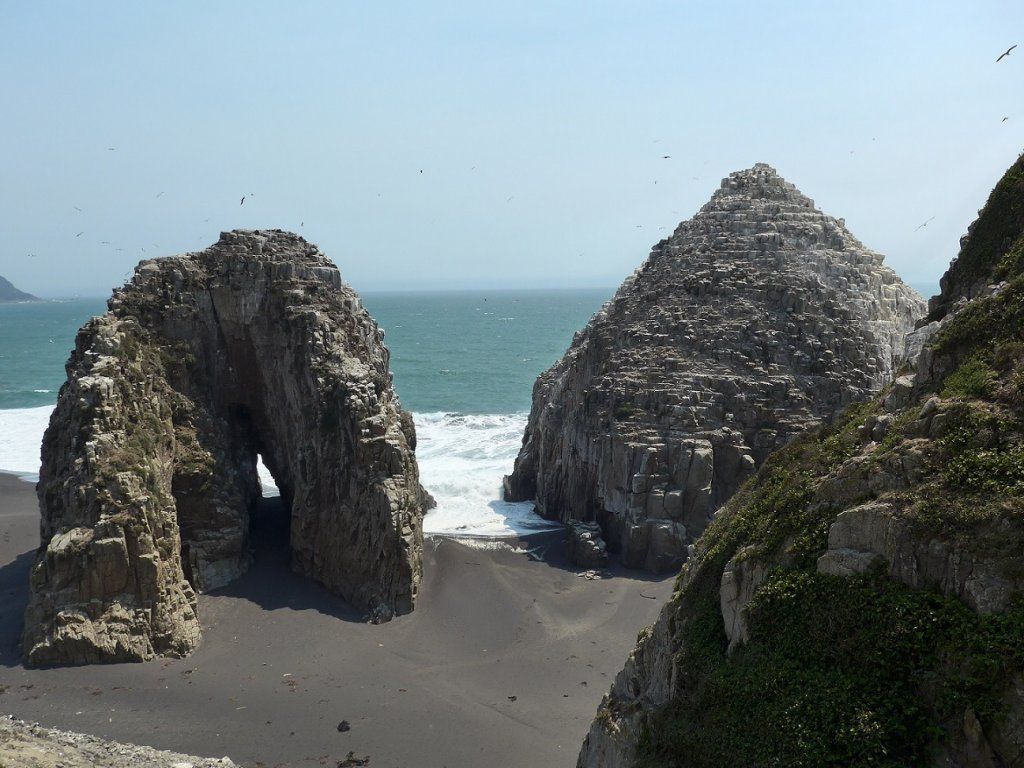 Inzwischen sind wir wählerisch geworden, was Übernachtungs- und auch Mittagspauseplätzchen anbelangt. Nachts haben wir gerne eine Ecke für uns allein, die möglichst ruhig sein sollte - mit Ausnahme des Lärms, den der ‚Stille Ozean‘ produziert - und fürs Mittagessen ist ein Minimum an Aussicht Bedingung. Manchmal müssen wir ein Weilchen suchen, aber meistens lohnt es sich. Die bisher exklusivste Mittagspause-Aussicht wird uns in Constitución geboten. Von der erhöhten Küstenstrasse sehen wir auf den schwarzen Sandstrand und dahinter einzigartige Felsformationen. Die Wellen branden an ihnen hoch, darüber kreischen Möwen und Pelikane.