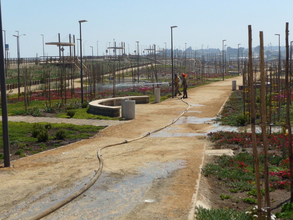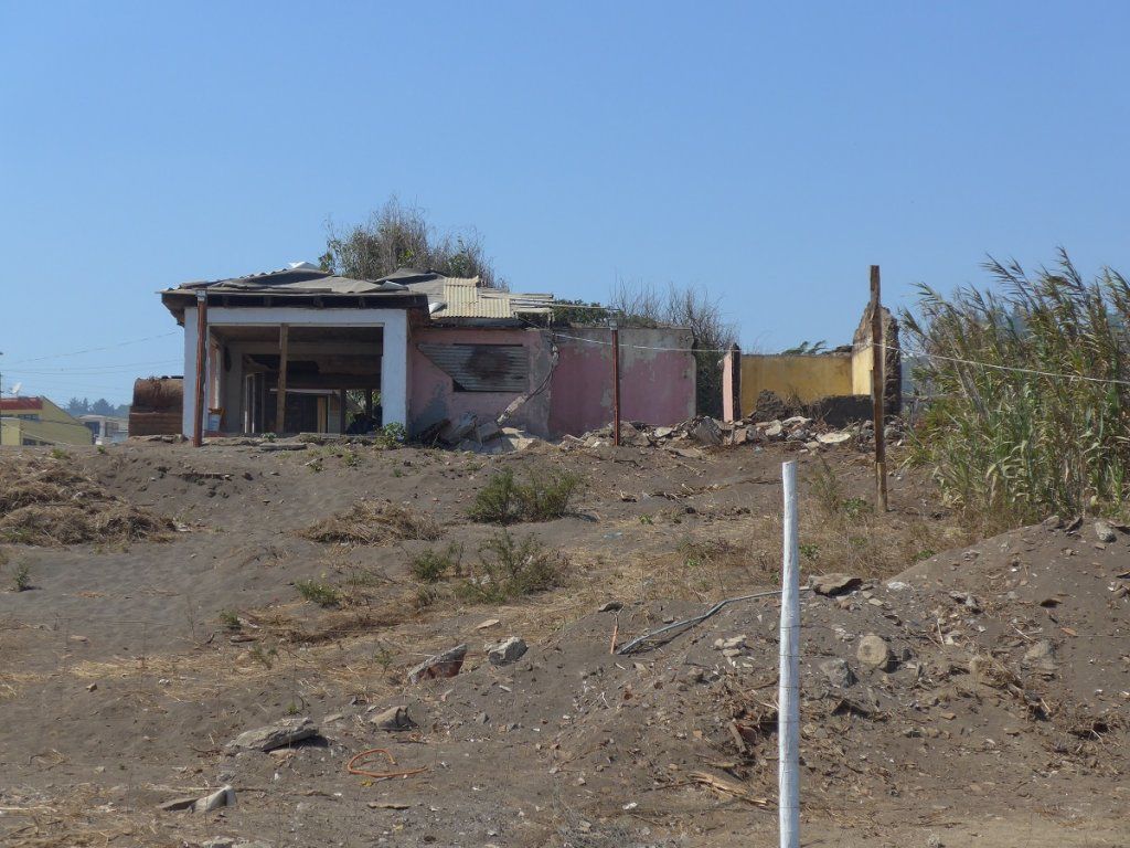 Ein Seebeben im Februar 2010 verursachte eine Tsuami-Welle, der rund 500 Menschen zum Opfer fielen und die enorme Schäden anrichtete. In Pelluhue entsteht nun hinter einem Schutzwall eine neue Park- und Freizeitanlage imposanten Ausmasses. Schön gestaltete Rabatten, Fitnessgeräte für die Grossen, Spielgeräte für die Kleinen, lauschige Sitzgelegenheiten, Spazierwege usw. Wir sind sehr beeindruckt.