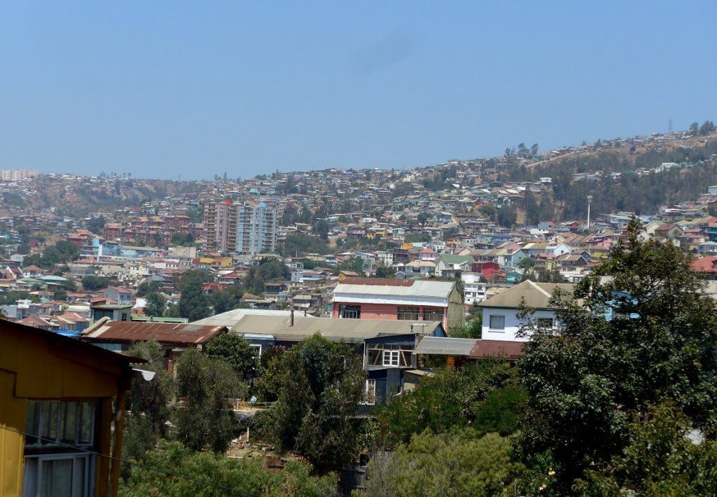 Am nächsten Morgen gibt uns ein Anwohner die Auskunft, es würden Busse nach Valparaίso fahren, man könne sich einfach an die Strasse stellen und einen aufhalten. Den Camper dürfen wir stehen lassen, wo er ist. Nach etwa 20 Minuten kommt tatsächlich so ein Bus. Es ist eine grässliche Klepperkiste und der Fahrer fährt für unsere Begriffe reichlich draufgängerisch. Aber er ist sehr effizient und kann alles Mögliche gleichzeitig erledigen, was wir von unseren Plätzen aus beobachten. Wenn Personen an einer Haltestelle oder am Strassenrand winken, öffnet er schon im Fahren die Tür, um möglichst wenig Zeit zu verlieren. Dann startet er sofort wieder durch, die Billettausgabe und das Geldgeschäft gehen auch fahrenderweise und die Passagiere wissen, dass sie sich gut festhalten müssen, bis sie einen Platz gefunden haben. Einmal fotografiert der fahrende Chauffeur mit seinem Handy den Stau und schickt das Bild irgendwem. Später telefoniert er ausgiebig. Bei einem Halt am Lichtsignal kauft er von einem Strassenhändler einen Früchtebecher und ein Getränk. Die Früchte löffelt er selbstverständlich während des Fahrens.
