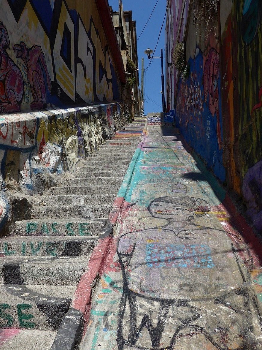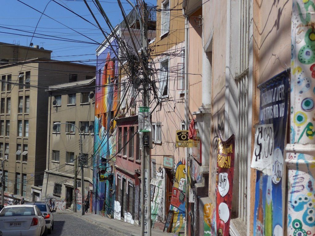 Mit einem ratternden Schräglift lassen wir uns in die Höhe hieven und schlendern durch die Gassen des Stadtteils, der zum UNESCO-Weltkulturerbe gehört. Speziell ist nicht nur die steile Lage, sondern die zahlreichen, von allerlei Künstlern auf die Wände gesprühten Graffitis.