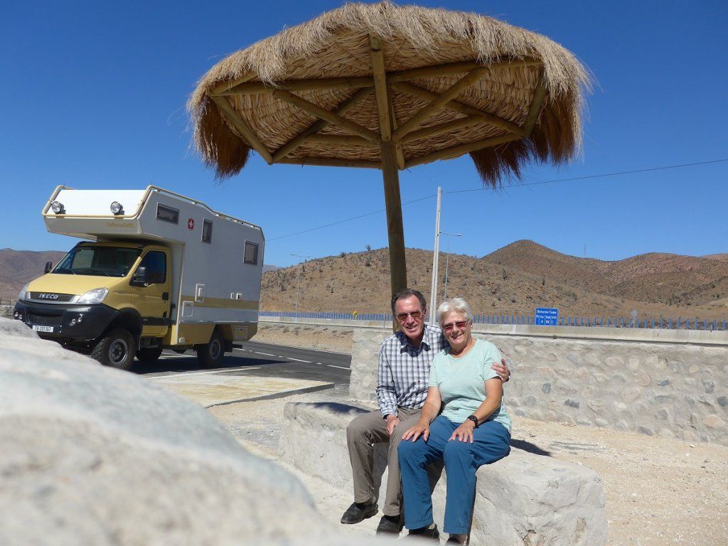 Dass wir am nächsten Tag wieder Richtung Küste streben, muss ich wohl nicht extra erwähnen. Ziel wäre eigentlich die Stadt La Serena, weil sie schön sein soll und weil wir ein paar Dinge erledigen wollen. Aber La Serena liegt am Meer und bildet zusammen mit Coquimbo ein Badeparadies für Tausende. Oder sind es Millionen? Unsere Reaktion ist voraussehbar: Nur weg von hier! Zum Glück bietet sich etwas nördlich eine Tankstelle mit bester Infrastruktur an. Da weiss man, dass man nicht allein ist, aber man findet einen Parkplatz! Im Laufe des Abends verwandelt sich die Tankstelle in einen veritablen Campingplatz, wo sogar Zelte aufgestellt werden. Gleich neben uns quetscht sich eine Frau in die Parklücke sehr nahe an unser Wohnmobil. Sie öffnet ihre Autotür und organisiert das Fahrzeug in ein Schlafzimmer um und wir können unsere Wohnkabinentür nicht mehr öffnen. Heinz - bekannt für sein Talent, sich auf ‚Spanisch‘ durchzuschlagen - öffnet das Fenster und sagt freundlich: „Buenas tardes, chönnted sie bitte ihri Türe zuemache?“ Klar kann sie das, kein Problem!