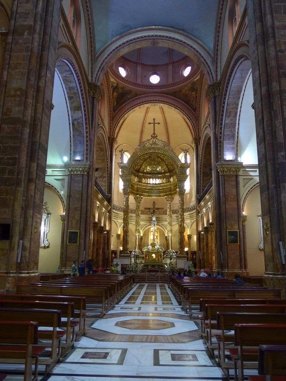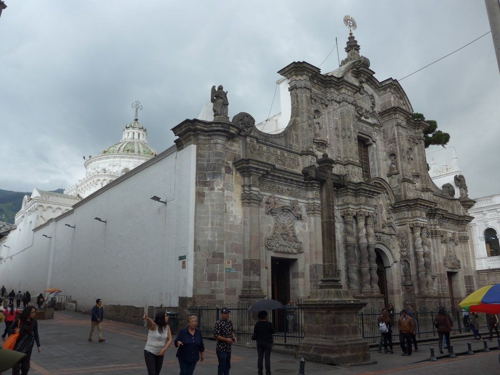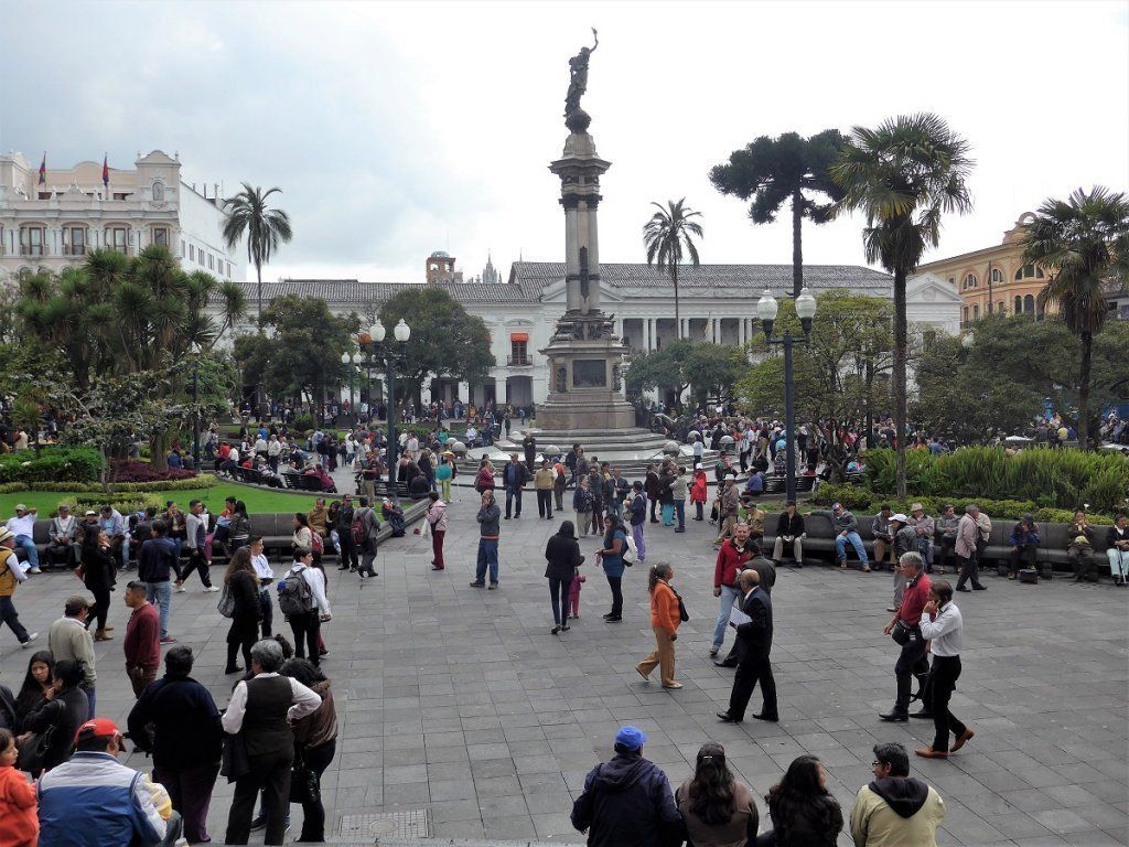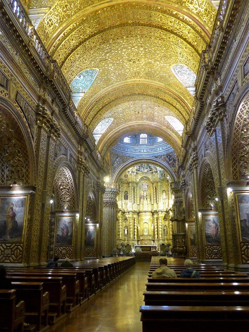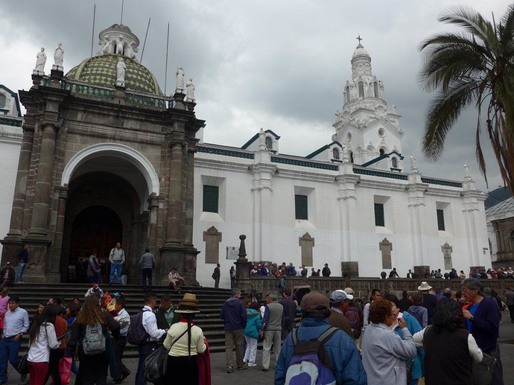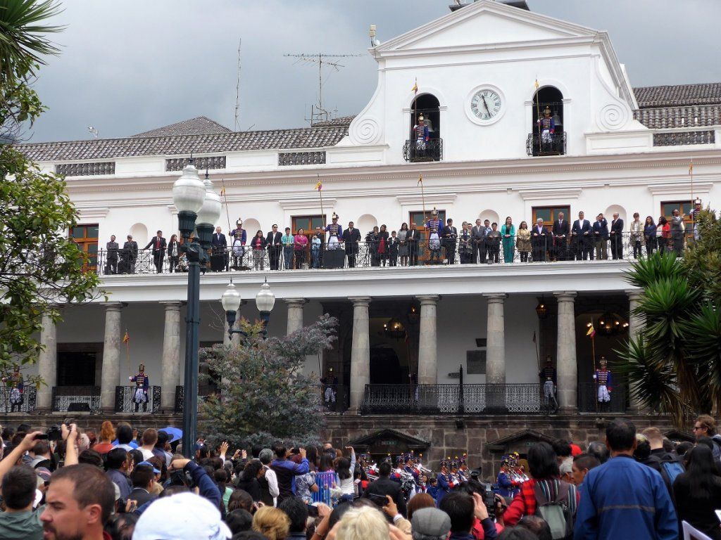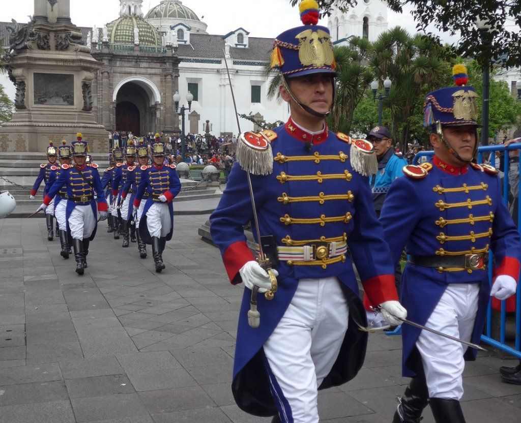 Nach der Rückkehr von den Galapagos-Inseln holen wir noch die Besichtigung der Innenstadt von Quito nach. Von unserem Stellplatz ist es eine zweistündige Busfahrt mit Umsteigen bis ins Zentrum der langgezogenen Stadt, deren Nord-Süd-Ausdehnung gut 40 km beträgt. Jeden Montag findet eine beeindruckende Wachablösung der Palastgarden statt, von der wir zufällig noch einen Teil mitbekommen. Dann zeigt sich Präsident Rafael Correa auf dem Balkon des Palasts, winkt seinem Volk zu und wird von diesem laut und freudig bejubelt. Beeindruckend ist auch die Jesuitenkirche, für deren Innenraum-Dekorationen angeblich sieben Tonnen Gold verwendet wurden.